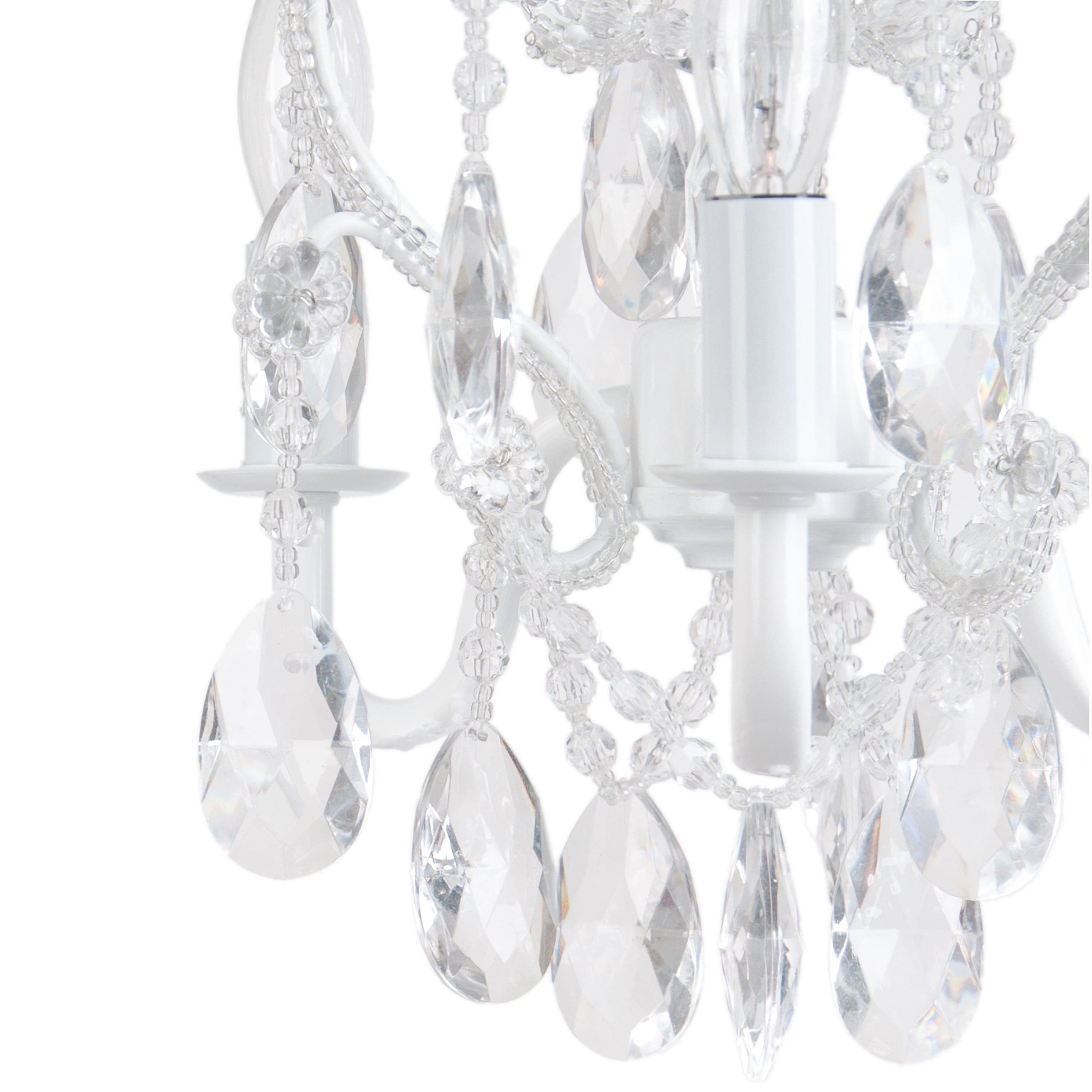 Tadpoles Beaded 3-Bulb Mini Chandelier, White Diamond: INCLUDES: Bead mini chandelier, 12′ hanging chain and plug-in cord 15 Feet; 2 ceiling plates (diameter 4.7 inch) and hardware DIMENSIONS: 8″ x 8″ x 10″ WATTAGE: 25 Watts AVAILABLE IN: Pink Sapphire, Black Onyx, Lavender Topaz and White Diamond
