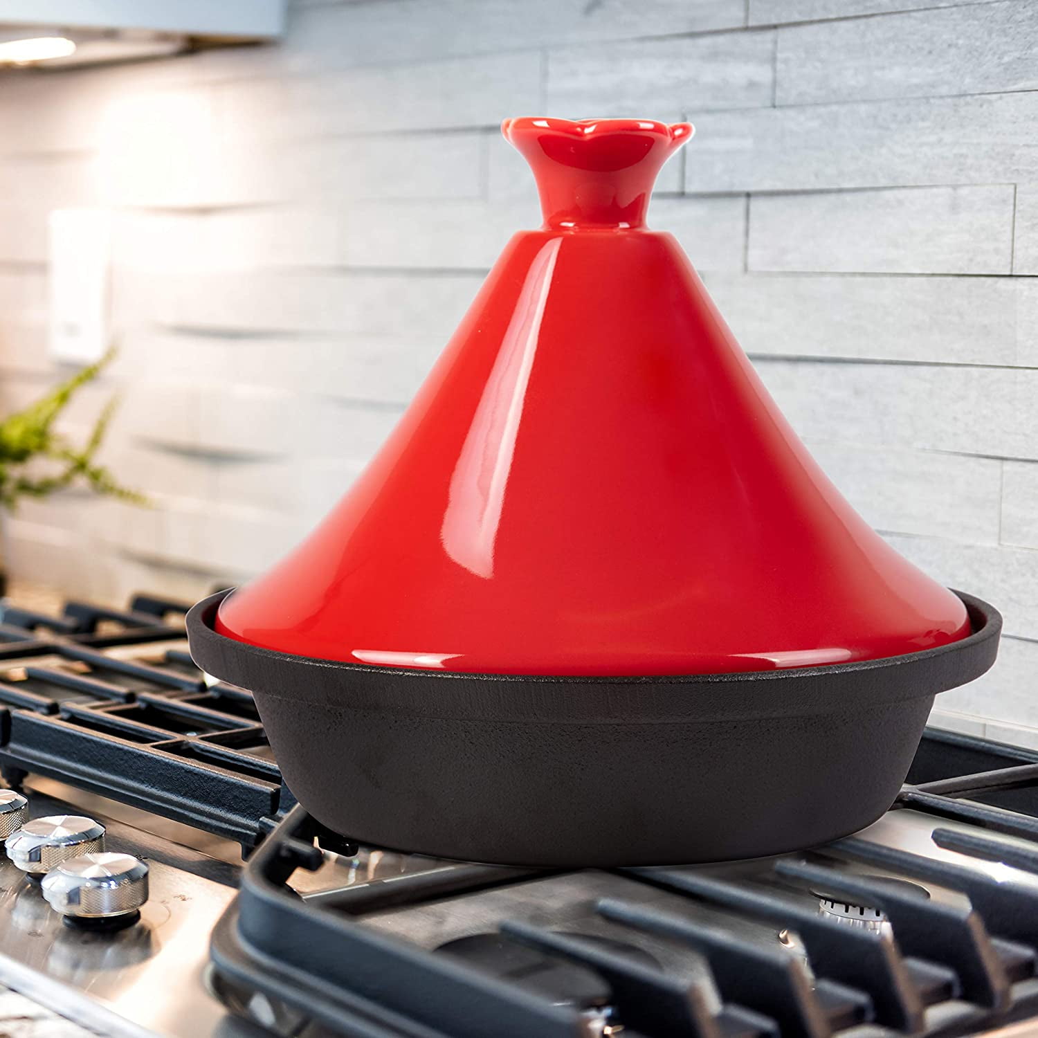 CucinaPro 4 qt Oven Safe Cast Iron Cooker Pot with Cover Traditional Moroccan tagine pot designed for authentic cooking Conical lid locks in steam, ensuring continuous basting for enhanced flavor Ideal for slow simmering soups, stews, and other flavorful dishes Made of durable cast iron for excellent heat retention and even cooking Enameled ceramic lid adds a stylish touch and is easy to clean Oven safe up to 500°F, perfect for versatile cooking methods Great gift idea for cooking enthusiasts, especially for Mother’s or Father’s Day