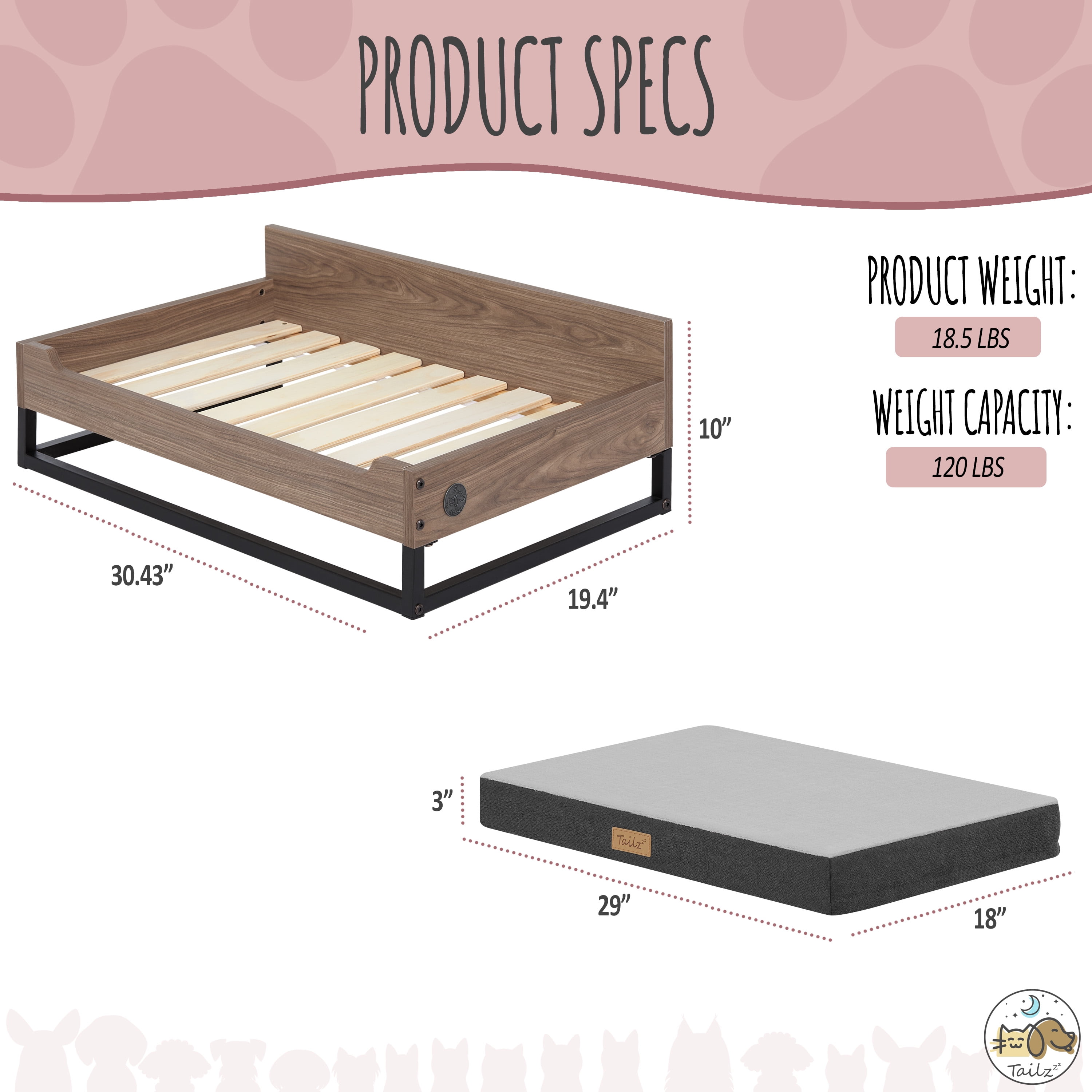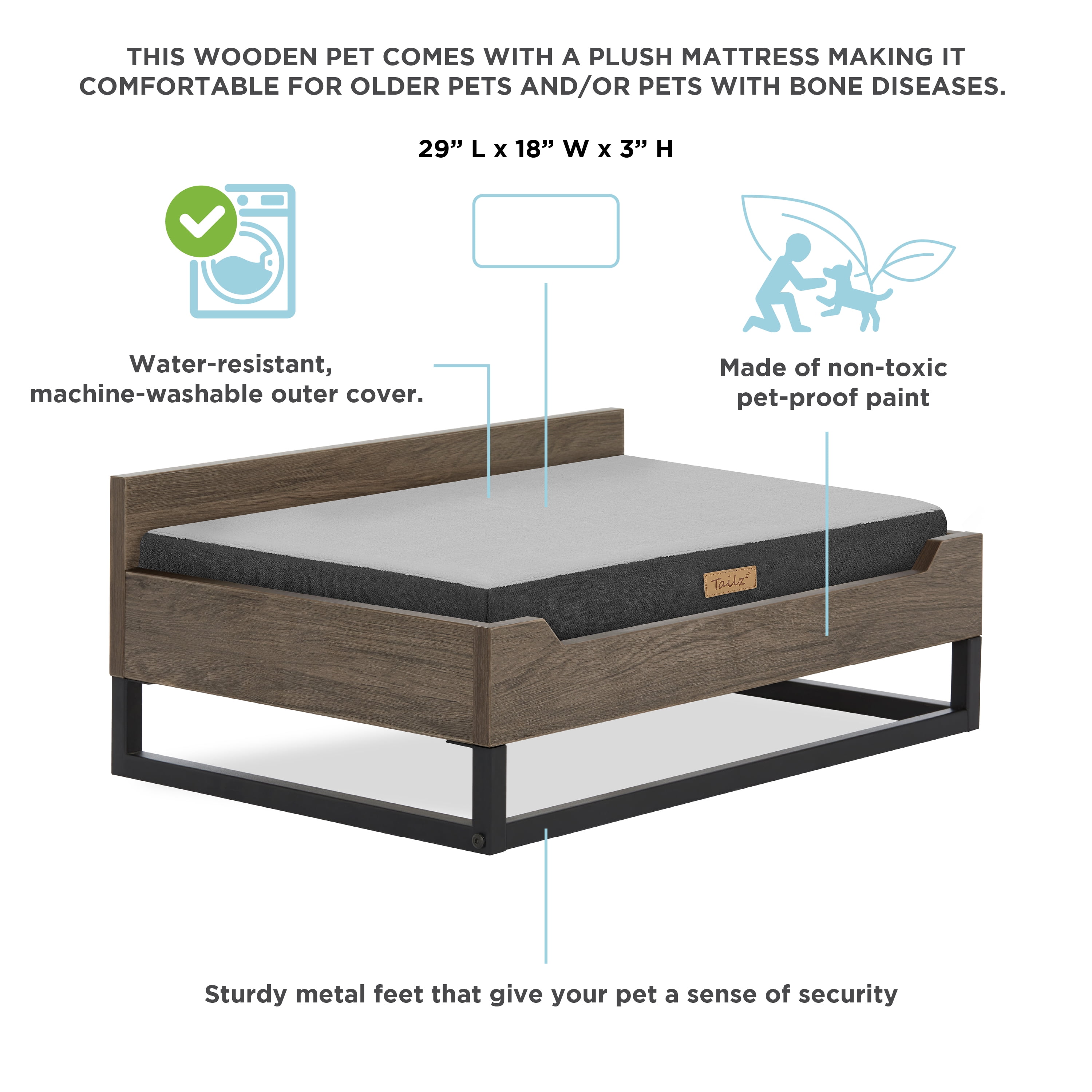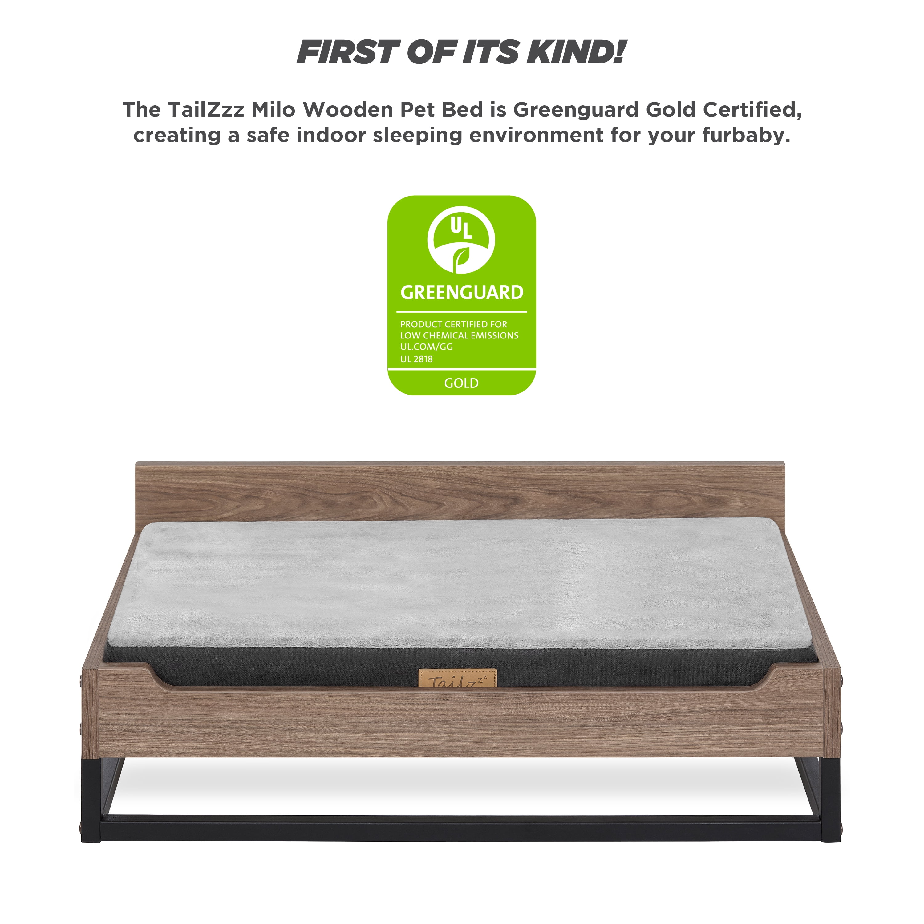 FIRST OF ITS KIND: The TailZzz Milo Wooden Pet Bed is Greenguard Gold Certified, creating a safe indoor sleeping environment for your furbaby. MATTRESS INCLUDED: This wooden pet comes with a plush mattress, making it comfortable for older pets and/or pets with bone diseases. Mattress dimensions: 29” L x 18” W x 3” H. PRODUCT SPECS.: This Wooden Pet Bed dimensions are 30.43” L x 19.4” W x 10” H with a weight of 18.5 Lbs. Weight Capacity: 120 Lbs.