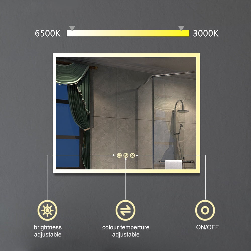 1. 1/5” copper free mirror. The performance of anti-friction and corrosion resistance of copper free mirror are better than those of ordinary silver mirror. 2. Defogger application will give you a clear look when taking steamy shower. 3. CRI>90. the higher CRI index, the higher color rendering of the light source. E.g. The best light source is sunshine, CRI=100. 4. Easy installation. We offer two small brackets and screws, which provide you very easy installation. 5. Thin thickness. Only 1 1/16” thin thickness of the whole mirror. 6. Light color adjustable. We offer you both cool (whiter) and warm (yellow) light to meet your various requirement. 7. Lumen adjustable for 3000K-6500K. You may touch the dimmer button to adjust the brightness of light. More of that, stepless light adjustment available when keeping touching the dimmer button. 8. Memory. Latest setting of Color and Lumen could be memorized. 9. Every mirror can be displayed vertically or horizontally 10. An anti-leaking stripe tape has been added around the led vanity mirror to prevent light leakage. 11. ETL&cETL certified give you a best safety guaranty of using electric appliance in damp environment. Source:Input 100-250v, 50/60HZ; LED Strips: 4 With Defogger; Size:48″Width x 36″ Height; Edges: Frameless Beveled; Mirror Thickness:1.5″ totally; Touch Screen Power On/Off and Brightness adjustment