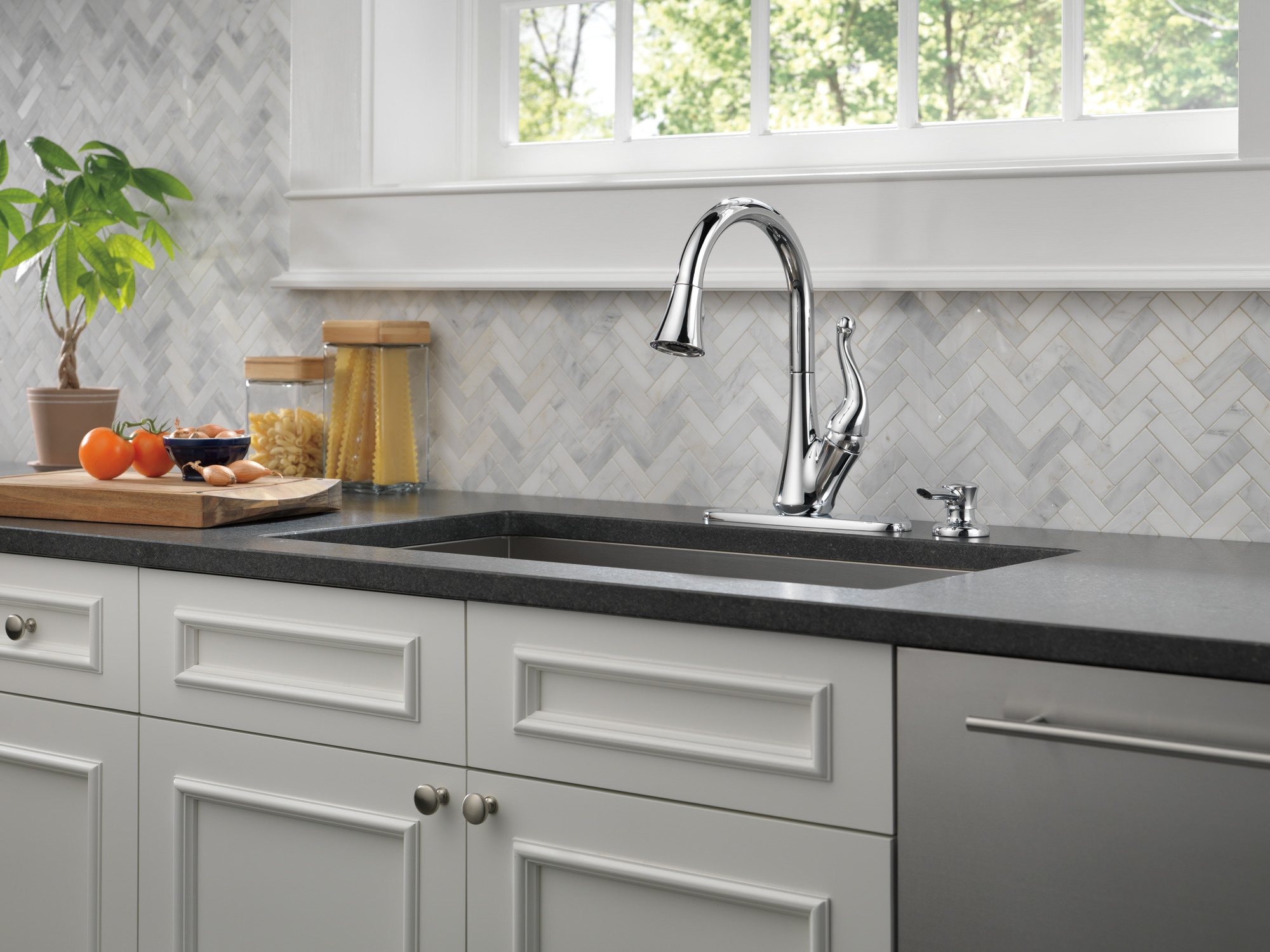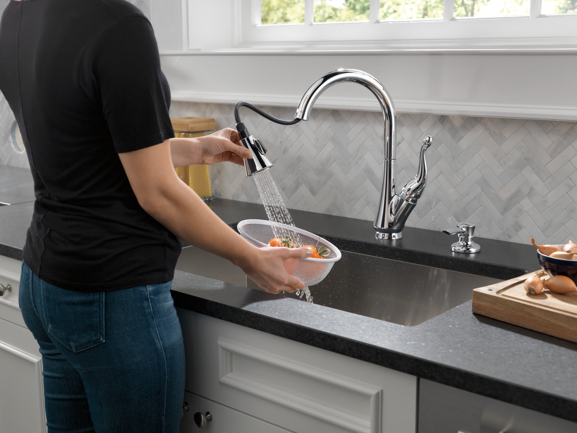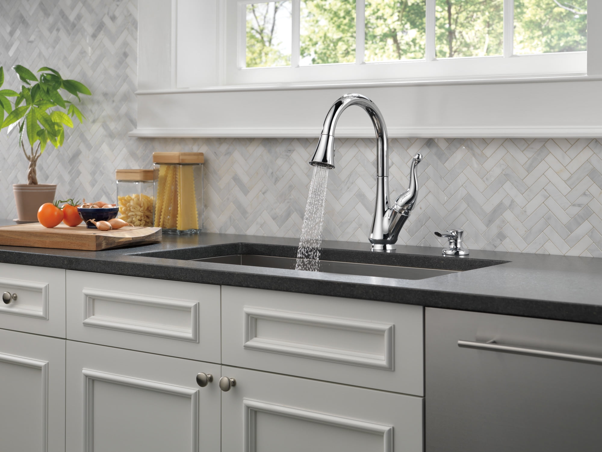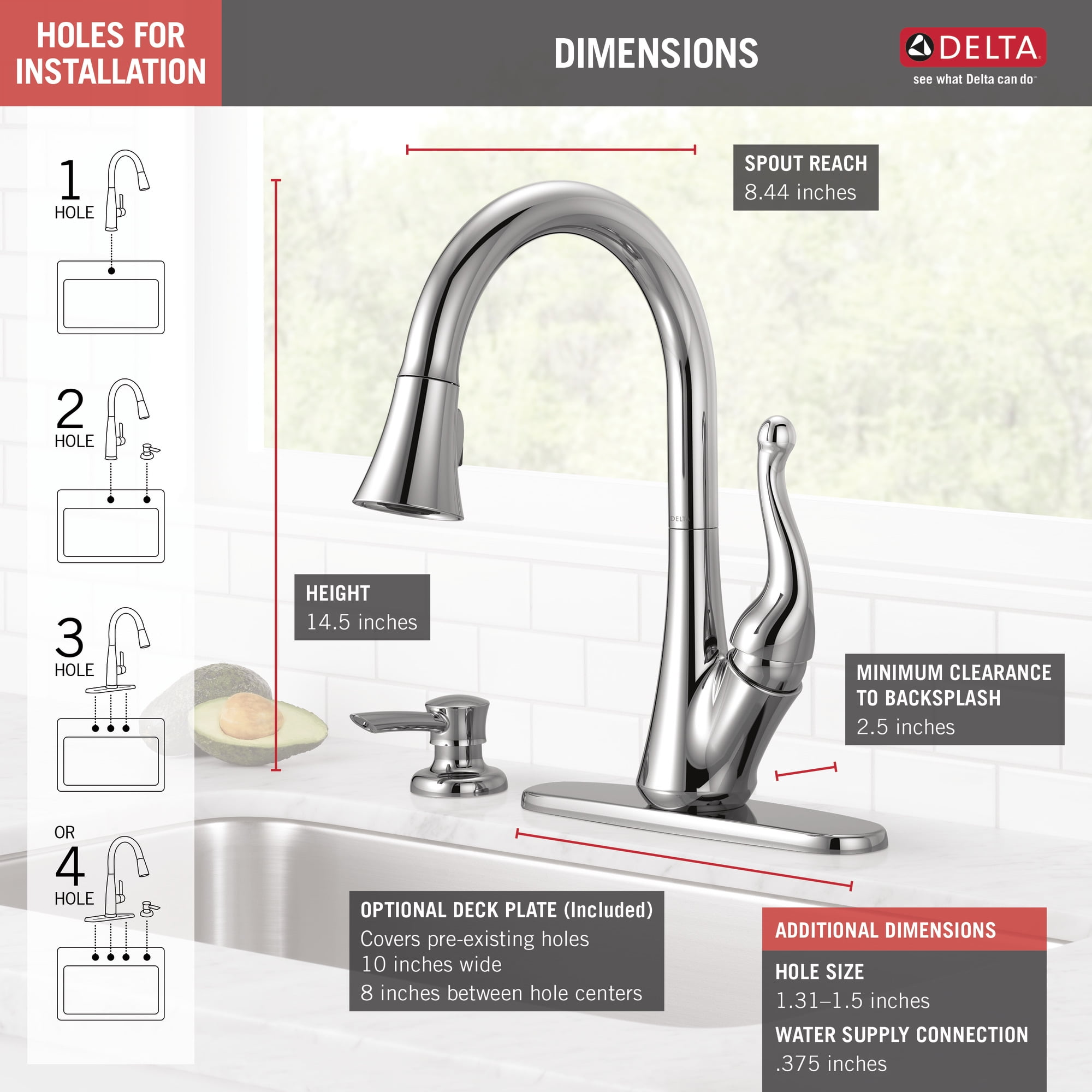 MagnaTite® Docking uses a powerful integrated magnet to snap your faucet spray wand precisely into place and hold it there so it stays docked when not in use and doesn?t droop over time ShieldSpray? Technology powers off the mess without making a mess Concentrated stream cuts through messes and innovative water shield reduces splatter Soft, rubber Touch-Clean® spray holes allow you to easily wipe away calcium and lime build-up with the touch of a finger DIAMOND? Seal Technology is less hassle to install and helps your faucet perform like new for life, reducing leak points and lasting twice as long as the industry standard Everything you need is together in one convenient box, including integrated InnoFlex® PEX supply lines Includes coordinating soap dispenser 1, 2, 3, or 4-hole 8″ installation Optional escutcheon included for use with additional mounting configurations and a cohesive look ADA Compliant High-arc pull-down swivels 360degrees