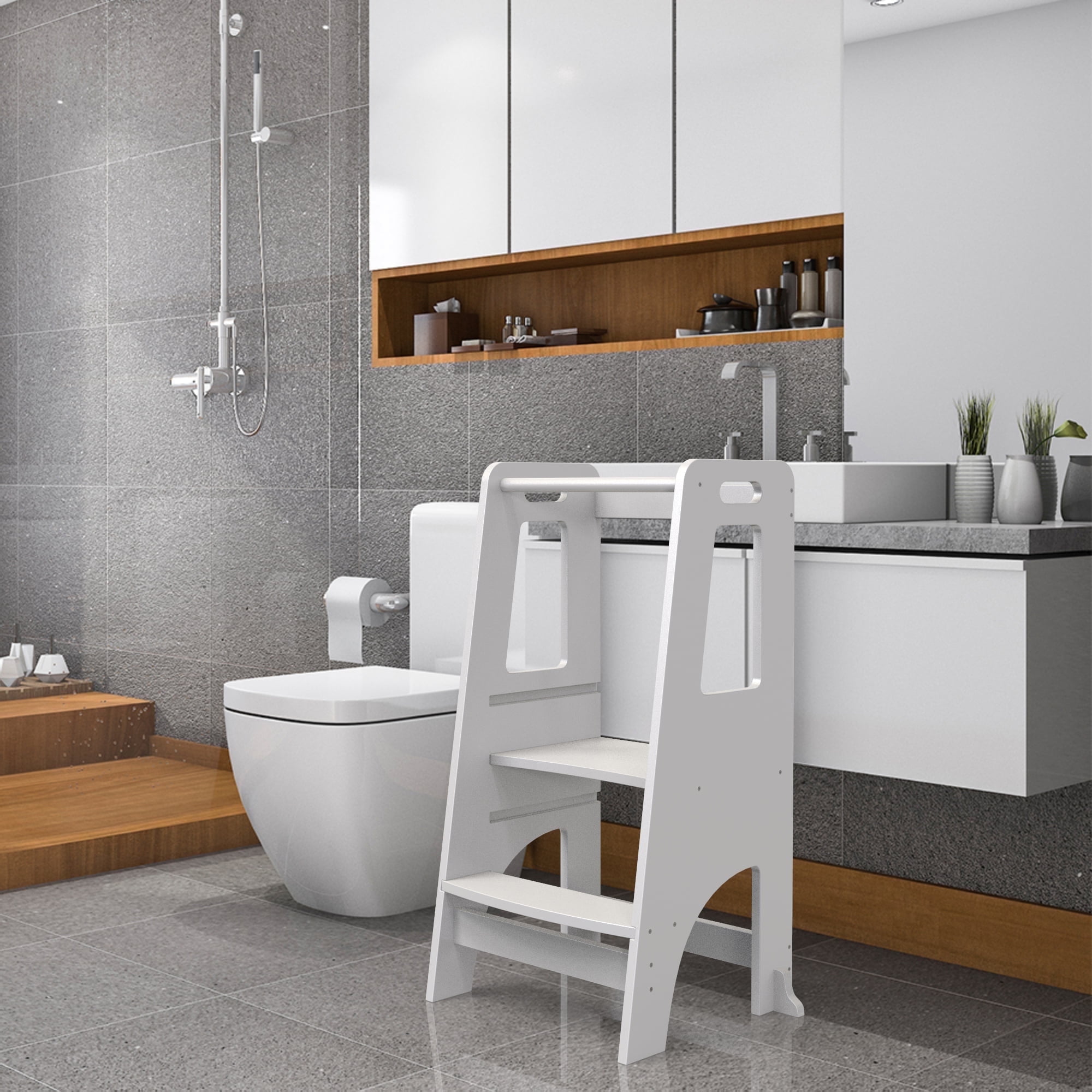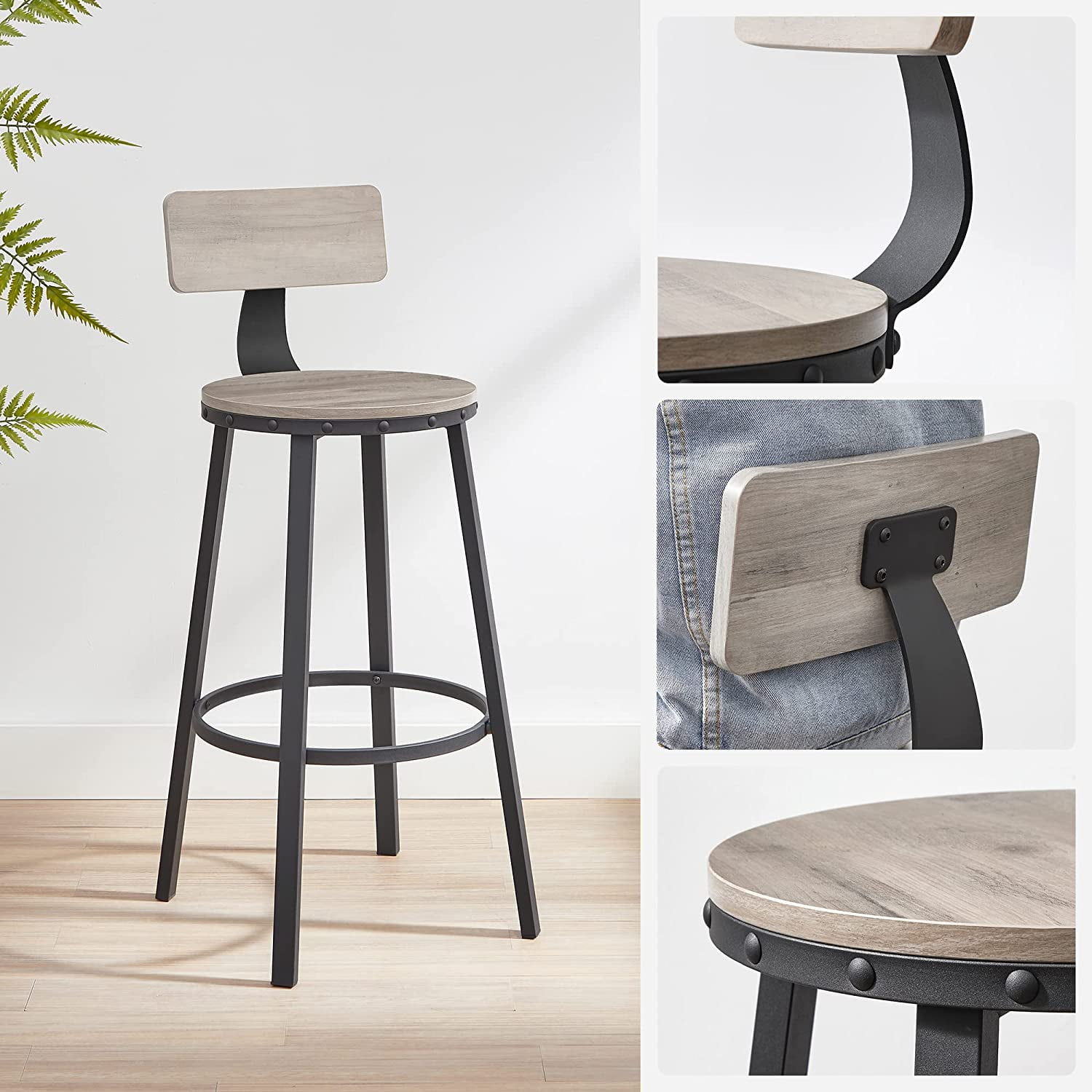 Basking in Rustic Charm: With their greige appearance, elegant black steel, and stud detailing, these tall stools embody industrial style and give a unique touch to the kitchen island or bar counter Enjoy the Comfort: Sit on the 20.9” dia. seat with your lower back surrounded by a well-curved backrest and feet on the footrest, you’ll enjoy some slow, relaxing moments on these bar chairs in comfort Offer You Solid Support: These 2 bar stools combine aesthetics with quality. Thanks to the thick, hard-wearing steel frame and sturdy particleboard, you can sit safely and comfortably. Complete your bar corner now! Put Them Back Underneath! With a compact design and seat height of 28.7” each, the 2 kitchen stools can be placed under most tall tables so they don’t take up space when not in use; just pull them out when dinner is served! Keep It Easy: The detailed instructions, numbered parts, and assembly tool included will help you set them up with ease so you can sit on it and have a lemonade Color: Greige, Black Product Size: 21.3”Dia. x 39”H (54 x 99 cm) Seat Diameter: 14.6” (37 cm) Seat Height: 28.7” (73 cm) Max. Static Load Capacity per Stool: 220 lb (100 kg) 2 x Bar Stool 1 x Assembly Kit 1 x Instructions Children should not climb on or play with the product for safety reasons. The static load capacity of each stool is 220 lb. Please do not exceed its weight limit.