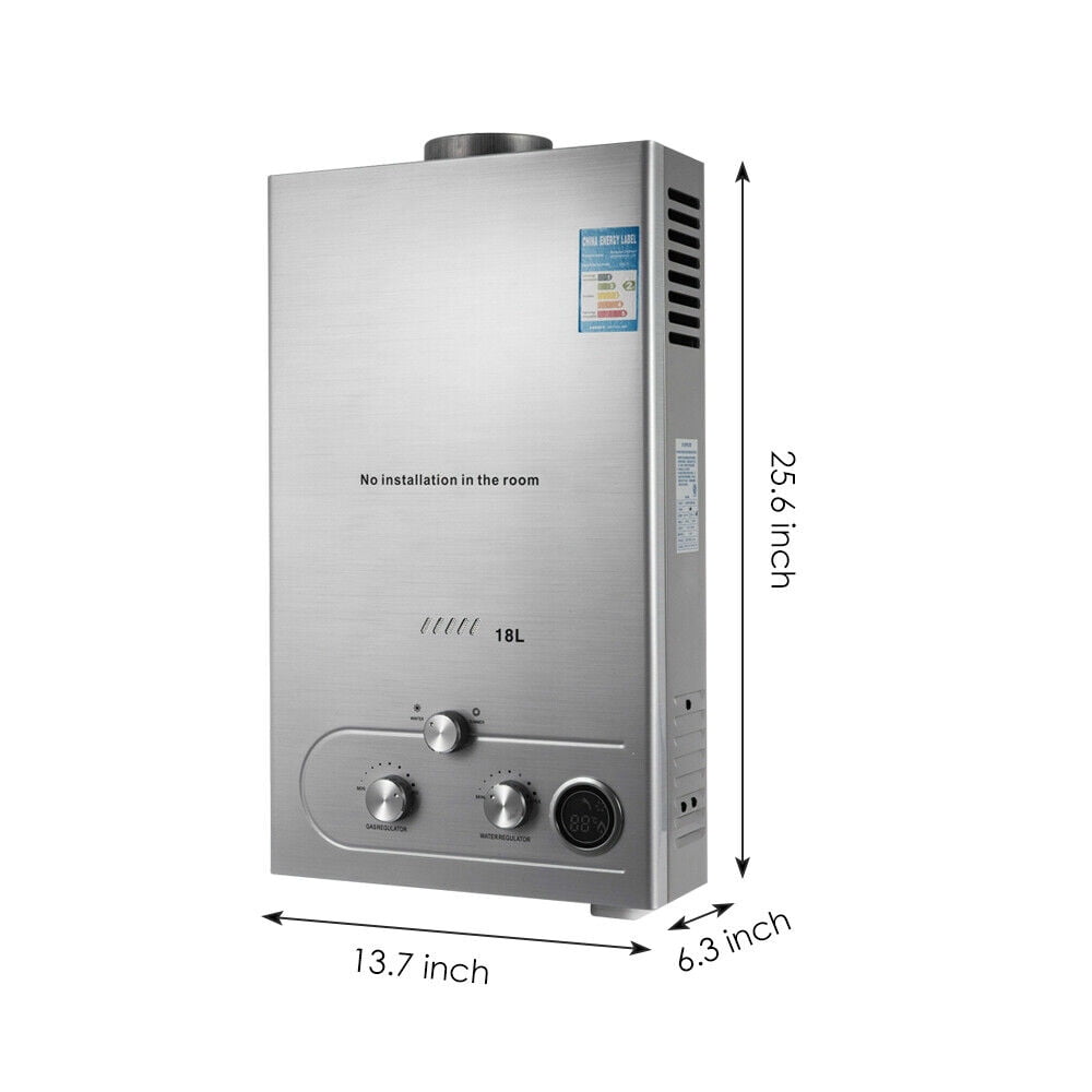 Specifications: Model: 18L Liquefied Petroleum Gas Water heater Type: Tankless Heat Output Power: 36 KW Gas Pressure(LNG) : 2000 Pa Hot Water Output: 18 L/min (4.8 GPM) Use Gas Type: Liquefied Petroleum Gas/Natural Gas Rubber Gas Hose(Outer diameter): 20 mm (0.79 inches) Water Inlet: G1/2” Water Outlet: G1/2” Suitable Water Pressure: Min.: 0.02 MPa Max.: 0.8 MPa Starting Pressure: 0.015 MPa Thermal efficiency : ≥80.8% Smoke Exhaust Pipe Output Diameter: 9 cm (3.54 inch) (Smoke exhaust pipe not included ) Exhaust Way: Open & Force flue exhaust type Discharge Ways: Flue automatic gas discharge Fire Catching Ways: Electricity pulse automatic fire catching Ignition: Powered by 2 size ‘D’ batteries (batteries not included) Characteristic: 1. Modern fashionable line shape designed, magnificent thin-shaped appearance. 2. High efficient energy saving. The heater exchanger and main burner adopt mostly advanced energy-saving and combustion technology to decrease gas consumption and burning noise. 3. Low water-pressure startup. The water control linkage valve makes the heater start up under low water pressure and stable water flowing under high pressure to meet the requirements of those in water shortage areas and those living in high stairs. 4. Manifold auto protection, Lon flame inspection. For the sake of your safety, automatically shut down gas power under unexpectable flameout. 5. Controller design, overheat protection. Both cold water and warm water can be properly controlled. 6. Over water pressure protection function, anti-freezing protection function. Automatically decrease the pressure under excessive high water pressure. The anti-freezing apparatus can discharge the stock water to avoid damaging the machine itself by freezing under cold areas or in case of long-time no use. Packing list: 1x 18L Propane/Natural Gas Water Heater Main Body 1x Shower Kit 1x English User Manual Precautions For the sake of your safety, please read following information carefully before using our products: 1. Every type of gas water heater is only suitable for one kind gas. And our 18l tankless instant hot water heater uses Liquefied Petroleum Gas. 2. Please read the instructions carefully before using the gas water heater, and in strict accordance with the instructions to use, maintenance of the water heaters. 3. It is highly recommended to be installed by a professional. 4. Must be used under the condition of ventilation, ensuring the normal condition of the flue kit. 5. Please check the gas connection regularly to ensure there is no leaking risks.