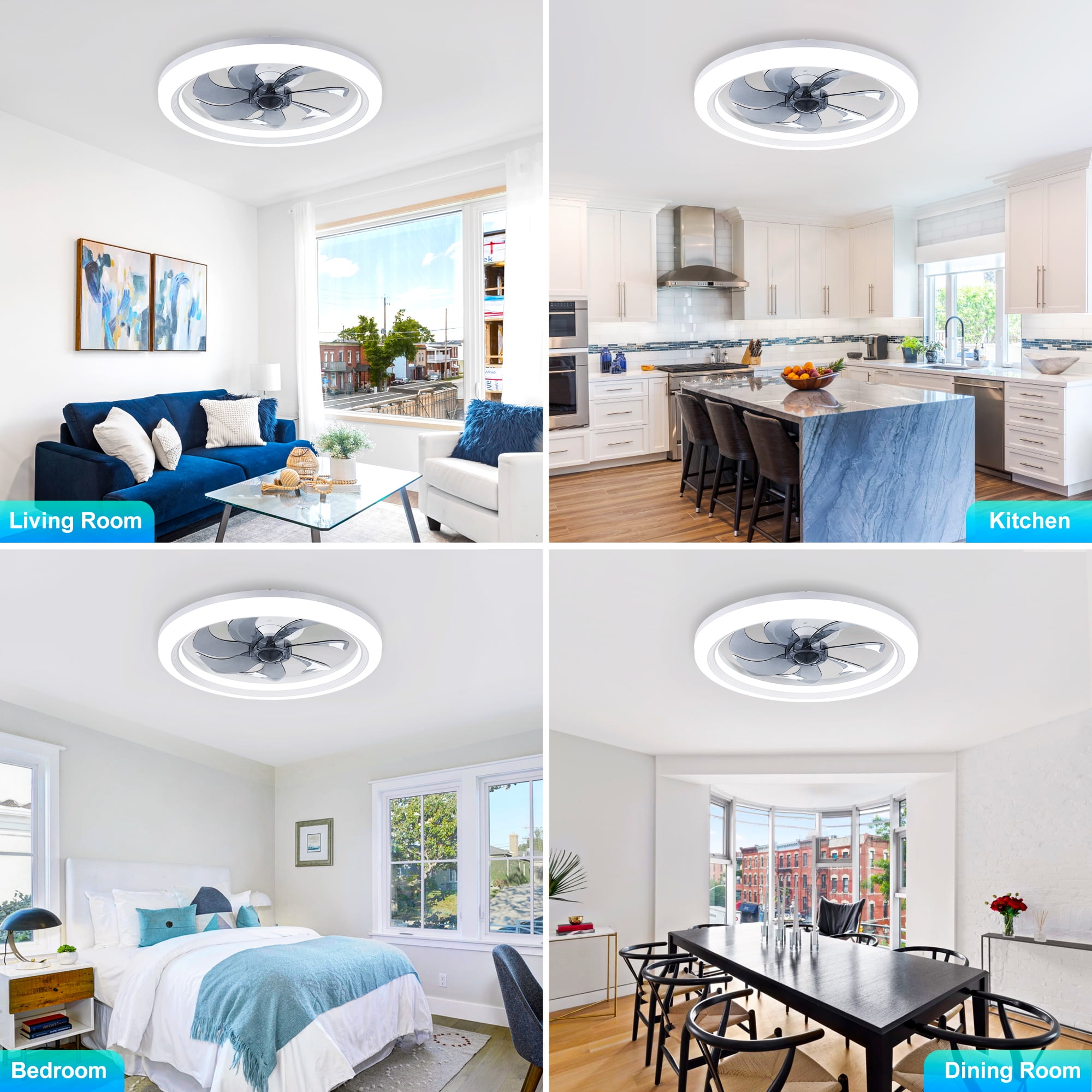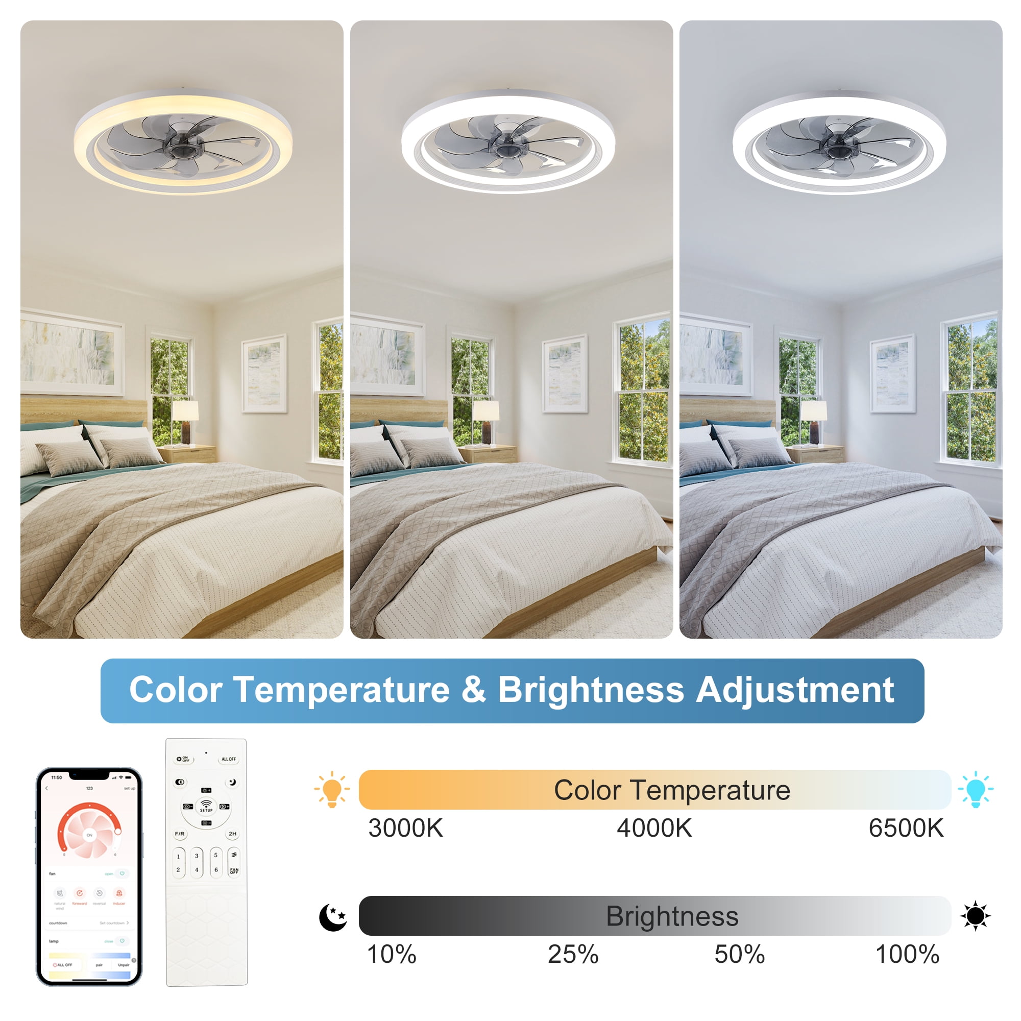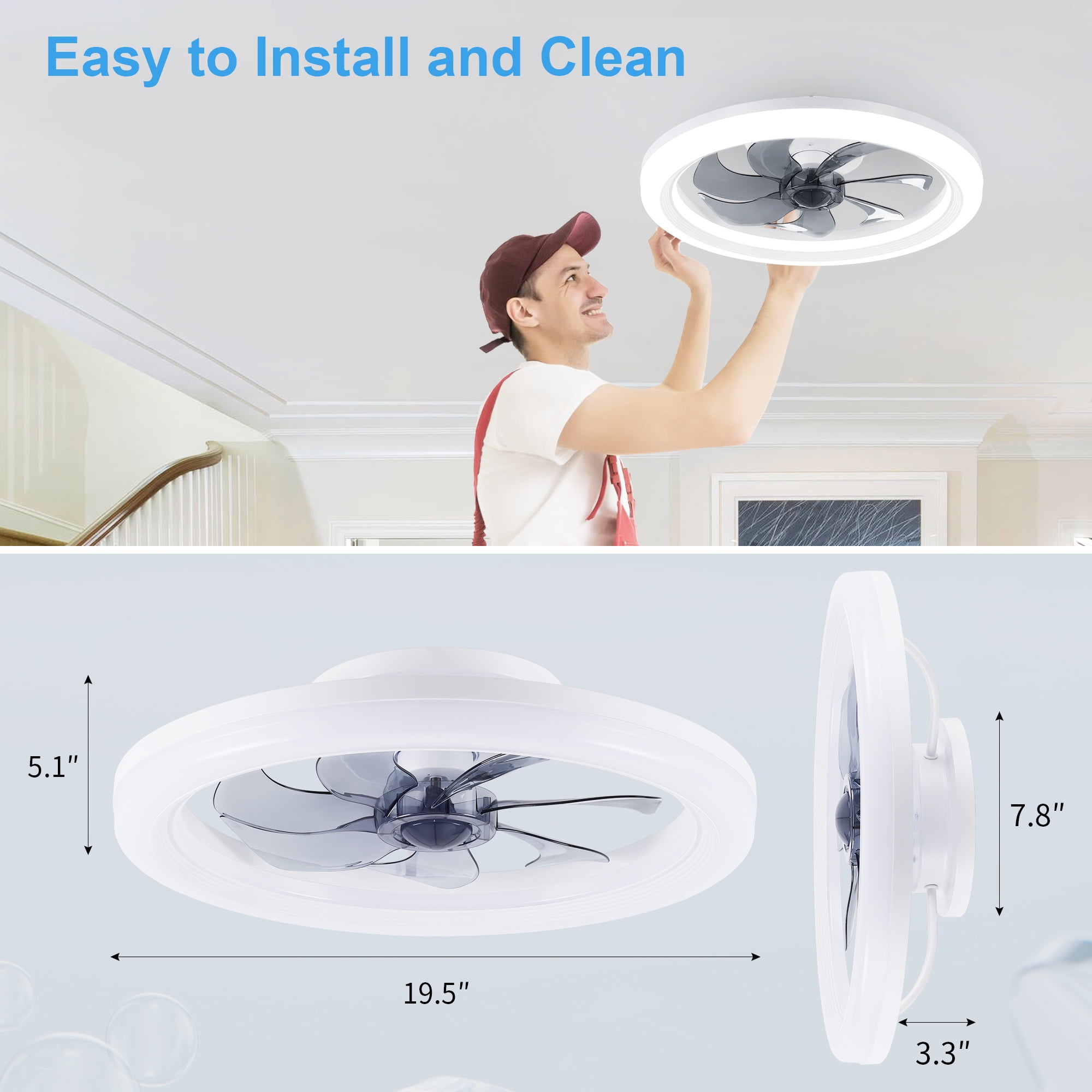 【2-in-1 Smart Ceiling Fan Design】 This flush mount ceiling fan combines adjustable LED light ring with a modern ceiling fan, adding a stylish and creative touch to your indoor space while providing low noise cooling. It’s an ideal dining room, kitchen, kid’s room, living room, bedroom ceiling fan selection. 【Remote and App Control】 Control your fan light with ease using the included remote control or through your smartphone app. The remote features a digital display for clear and immediate feedback on your settings. 【6 Wind Speeds & 7-Blade Design】 Enjoy optimal air circulation with our ceiling fan featuring 7 robust blades and 6 different wind speeds, ensuring a comfortable breeze for every season. 【Adjustable Color Temperature and Brightness】 Fine-tune your lighting to perfection with our ceiling fan light’s ability to adjust from warm light to cool white light across a range of 2900K to 6500K, along with brightness levels from 10% to 100%. 【Night Mode and Timer Function】 Designed for comfort and energy efficiency, this ceiling fan light includes a night mode and timer function, ensuring a restful sleep and saving energy. 【Noiseless DC And Reversible Motor】 Equipped with a premium copper reversible motor that operates at a low noise level of 35dB, providing a cool breeze in the summer and circulating fresh air in the winter. 【Easy Installation and Cleaning】 Designed with user-friendliness in mind, this ceiling fan light is simple to install and easy to clean, making maintenance a breeze.