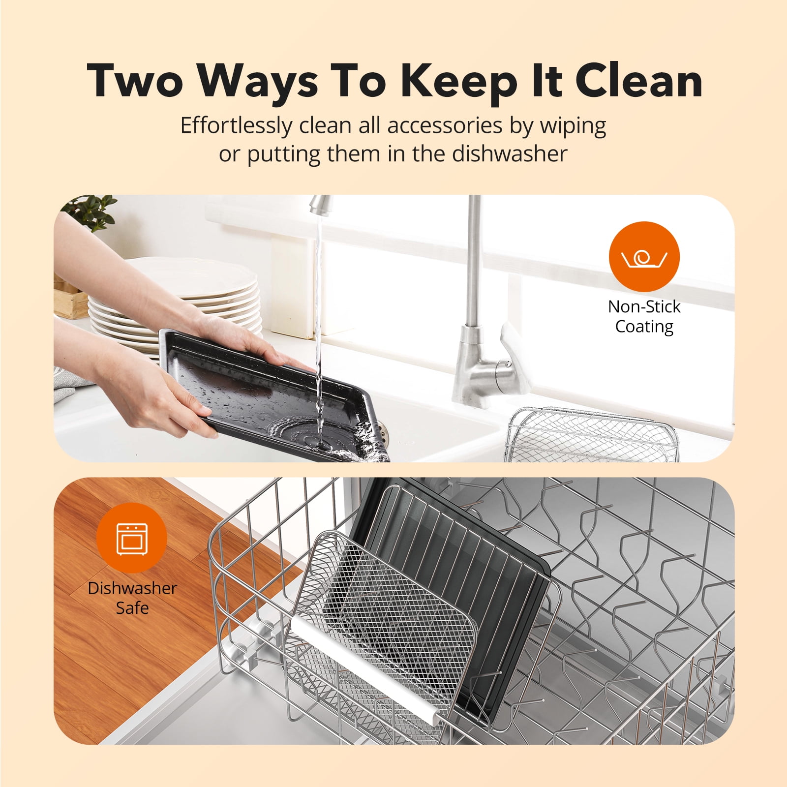 Fry A Feast: The large 14.8-quart air fryer lets you add a variety of food including a 9-inch pizza, 4 slices of toast, 8 chicken wings, and other types of food that can feed the whole family; includes extra accessories to cook even more Ensures an Even Heat: Top and bottom heating pipes, advanced technology and a design that is conducive for 360° hot air circulation work together to create a fume-free cooking experience that leaves food golden, crispy, and evenly cooked 5 Modes to Cook Everything: This premium oven meets all your cooking needs by supporting air frying, toasting, baking, roasting, and warming, so you can make food worthy of a restaurant; comes with a magnetic cheat sheet to help novice and veteran cooks elevate their meals Convenient, Open Design: Air frying is now easier than ever with three easy-turning knobs to set the temperature, timer and cooking functions; the open transparent glass lid enables you keep an eye on your fried meal instead of frequently opening the cover and losing heat No Mess, No Fuss Cleaning: With its non-stick coating, no food residue is left behind. This means it’s never been easier to keep the air fryer and its accessories clean – all you need is a dishwasher or simply a sponge to wipe it clean