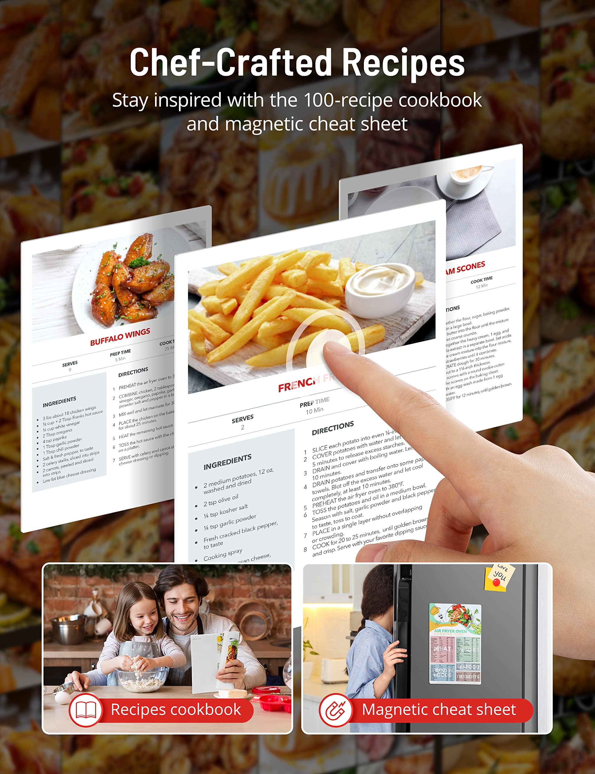 Unlike typical single-function air fryers or ovens, we elevate our product by offering 24 preset digital functions. These functions include Fry, Chicken, Steak, Bake, Roast, Broil, Dehydrate, Ferment, Defrost, Keep Warm, Slow Cook, Toast, Pizza, Cake, and more. This versatile 24-in-1 combination allows you to effortlessly prepare a variety of dishes, making your cooking experience more enjoyable than ever before. TaoTronics Air Fryer Oven Combo stands out in the market with a 70% larger capacity. You can effortlessly roast a 5-6 pound chicken, toast 6 slices of bread, cook a large batch of French fries, grill 20 chicken wings, or bake a 12-inch pizza in one go. The increased capacity is ideal for family use, entertaining guests, or preparing meals, making it an indispensable multifunctional device in the kitchen. The air fryer oven features a 1750W power and six heating elements, cooking food 40% faster than traditional ovens. With even heat distribution, it reduces preheating time by up to 30%, saving you precious time in the kitchen. It ensures food remains tender and juicy on the inside, retaining up to 35% more moisture for perfect texture and taste balance. Our air fryer function serves as a healthy alternative to traditional deep frying, reducing fat by up to 75%. Enjoy all your favorite foods guilt-free, including french fries and other fried delicacies. With intense and efficient convection heating, our air fryer oven delivers perfect crispy and golden results every time. This ensures a perfect fusion of texture and flavor, guaranteeing a top-notch cooking experience. Easily set cooking temperature from 100°F to 450°F and time range from 1 to 120 minutes. With upgraded touch panel and knob design, our air fryer is easy to operate and quick to master. Comes with a cooking manual and magnetic recipe book containing 100 recipes, fulfilling all your cooking desires.