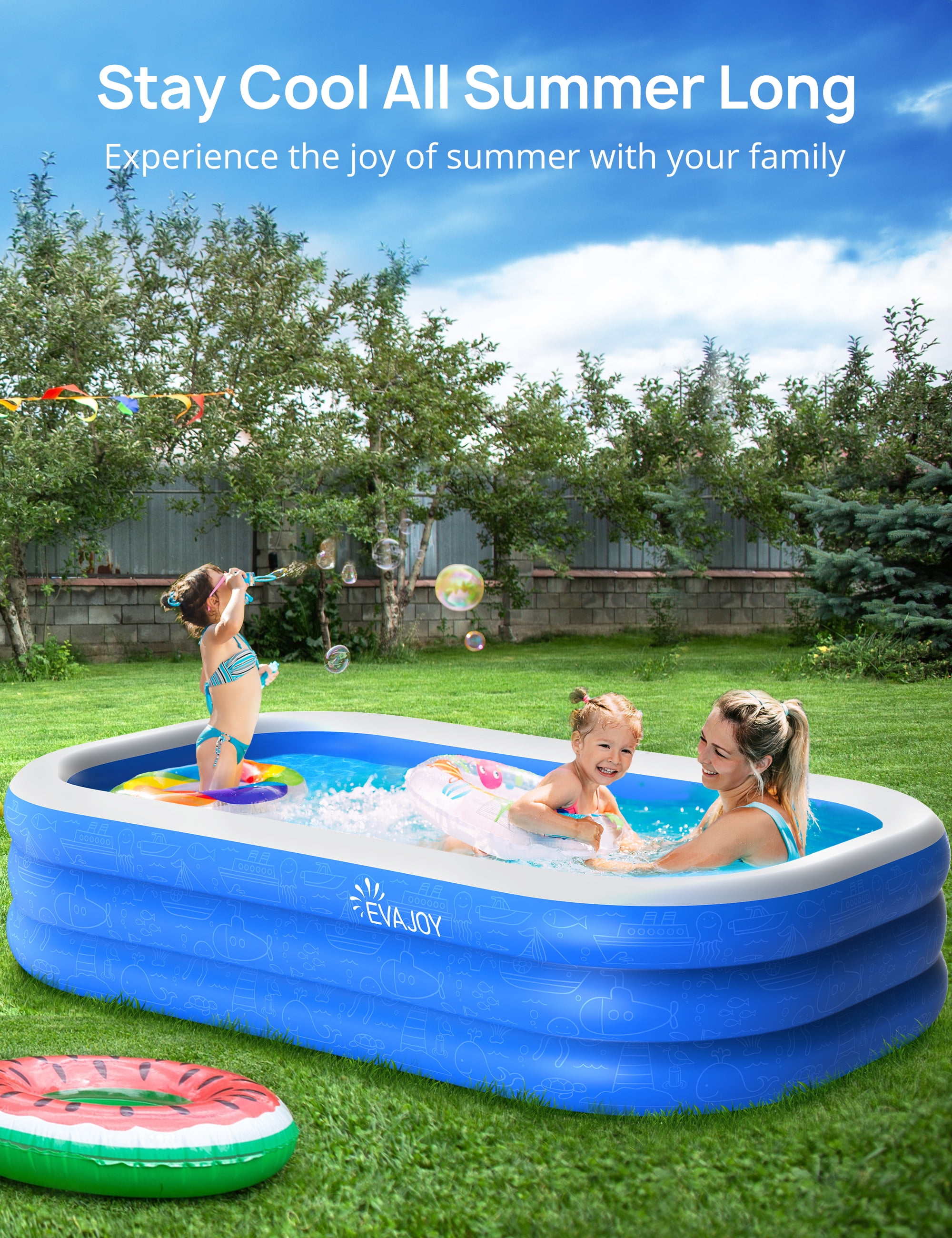 Blow Up Kiddie Pool, 78″ X 72″ X 20″ Full-Sized Inflatable Swimming Pools for Baby, Kids, Adults, Family Product Description: Your summer fun home party You can have parent-child swimming, playing with your family anytime, anywhere such as outdoor, garden, backyard. With skin-friendly materials, you and your children can feel and enjoy the cool and comfortable water in the family inflatable pool. Unique marine design inspires from the colors of sea, waves and fish. This blue pool has a white cap to reflect the sun’s heat, you don’t burn yourself when getting in or when you’re sitting back and resting your arms along the top surface. Constructed from durable PVC, equipped with efficient valves that make it both easy to set up and deflate. 【Polyester】 【Large Size Family Pool】: The size of the swimming pool is 78″×72″×20″, so it has plenty of room for the whole family to chill, this swimming pool can hold up to 2 adults and 3-5 kids(Age 3+) for summer fun in the water. 【2X Thicker Hull】: The hull of this inflatable pool is constructed from durable 0.4mm PVC material that is twice as thick as most products on the market, reducing the risk of being punctured by sharp objects and ensuring a long service life. 【BPA-Free PVC Pool】: Made with BPA-free materials that meet international standards for children’s toys, and the four corners of the swimming pool are also treated, it feels the same as the child’s skin, so don’t worry about scratching the child. 【3 Individual Air Chambers】: The independent air chamber structure makes the blow up pool more stable, and can prevent water leakage and air leakage. The 90° vertical drain pipe can facilitate the outflow of water, without worrying about the water residue. 【Ball Pit】: This kiddie pool also can be used as a ball pit, sand pit, fishing pond, toy pool, your child can be satisfied both indoors and outdoors. TaoTronics blow up pool is a great gift for your kids, families, pet dogs and even friends.