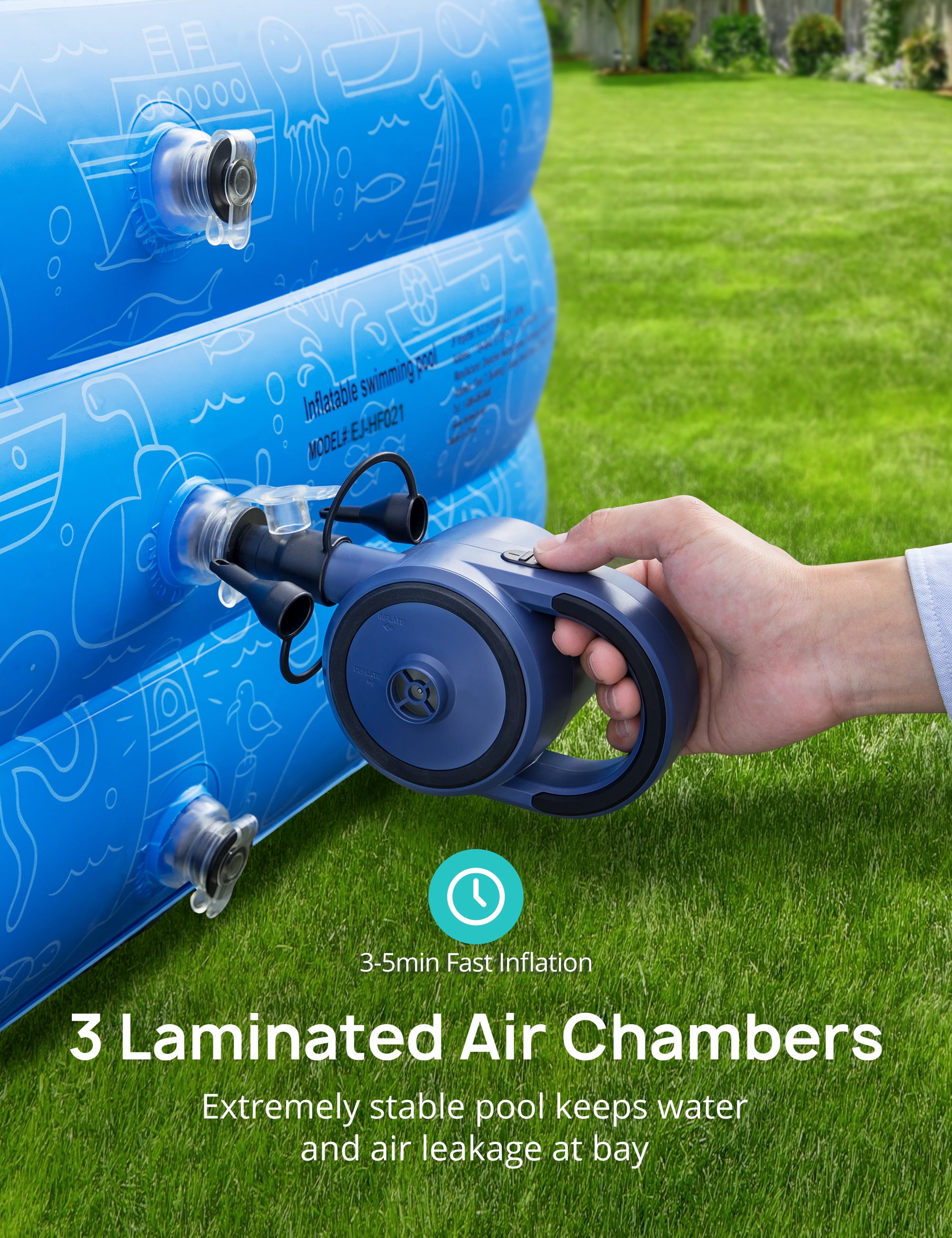 Quick and Easy: Inflate in 3-4 minutes by electric pump (not included), built-in 2 curve water valves double the drainage speed Sturdy & Stable: 3 individual air chambers each with double intake and free flow exhaust valve which can withstand weight while preventing air or water leakage