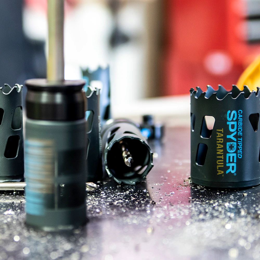 Spyder’s carbide-tipped Tarantula hole saws cut the toughest materials including steel, stainless steel, nail-embedded wood, fiber cement board, plastics, and more. Durable tungsten carbide cutting teeth make up to 50x more cuts than conventional bi-metal hole saws, and they are up to 10x faster — cutting through the toughest materials and extending bit life. Use with Spyder’s Rapid Core Eject arbor system to remove cores without prying (drill hole, press button, pull back the hole saw, and eject the core), cut at an angle, and enlarge existing holes using two adapters on one pilot bit (adapters and pilot bit sold separately). Spyder TCT, Bi-Metal, and Tarantula hole saws fit on Spyder’s Rapid Core Eject arbor and pilot bits and on universal hole saw arbors. Using a drill motor with a support handle is recommended. Not for use in hammer mode or on harder, more abrasive materials. 9-piece kit contains (5) hole saws: 1, 1-1/8, 1-3/8, 1-1/2, 2; (2) HSS pilot bits: Hex8, Hex10; and (2) arbors: Hex10 and Hex8, in a hard case.