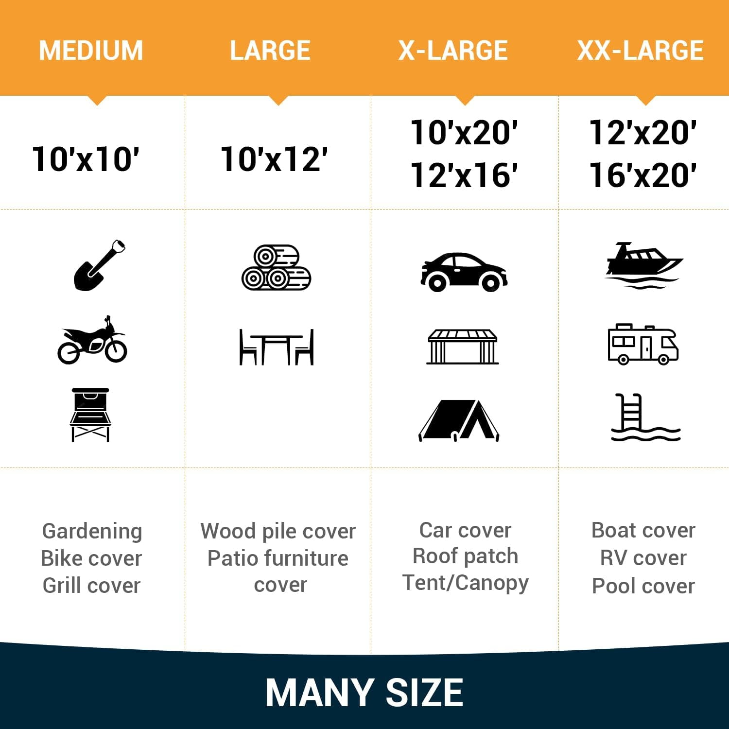 HEAVY DUTY OUTDOOR TARP: Up to 16MIL thickness, 15 x 17 weave, grommets spaced every 23 inches. Made from premium polyethylene material to ensure no breakage in almost any condition, can service for years. TEAR RESISTANT: unlike other products, our each corner is reinforced with plastic edges to help prevent tarps from tearing; In addition, double hemmed and heat sealed technology to secure it almost anything. TOP PROTECTION: The premium poly tarp is waterproof, UV-resistant and an ideal option for any weather or climate. If you get one, you can use the ultra-thick tarp throughout the entire year, whether it?s windy, raining, snowing or sunny. TARPS: With our heavy duty tarps, you can not only protect your belongs from sun damage, but also protect them from moisture, dust and more. Use this plastic tarp sheet to cover many different kinds of objects, like roofs, boats, cars, pools, outdoor furniture, or you can use it to go camping as a tent or a groundsheet. Cover any lumber, firewood and just about anything else. MULTIPLE SIZES AVAILABLE: These black and silver tarps come in 4 sizes in our store, 10x12FT, 10x20FT. If you have any problems or needs, please contact us freely.