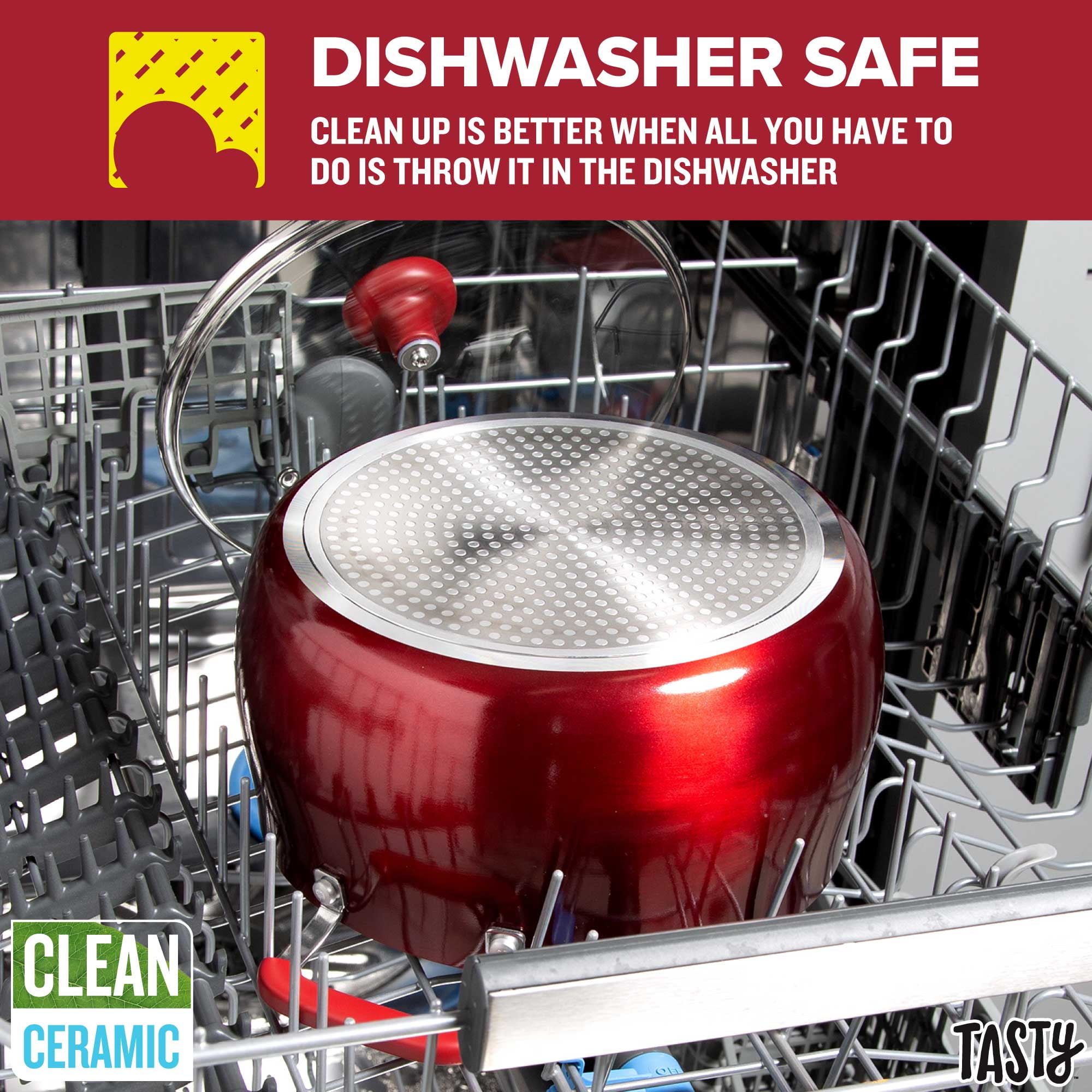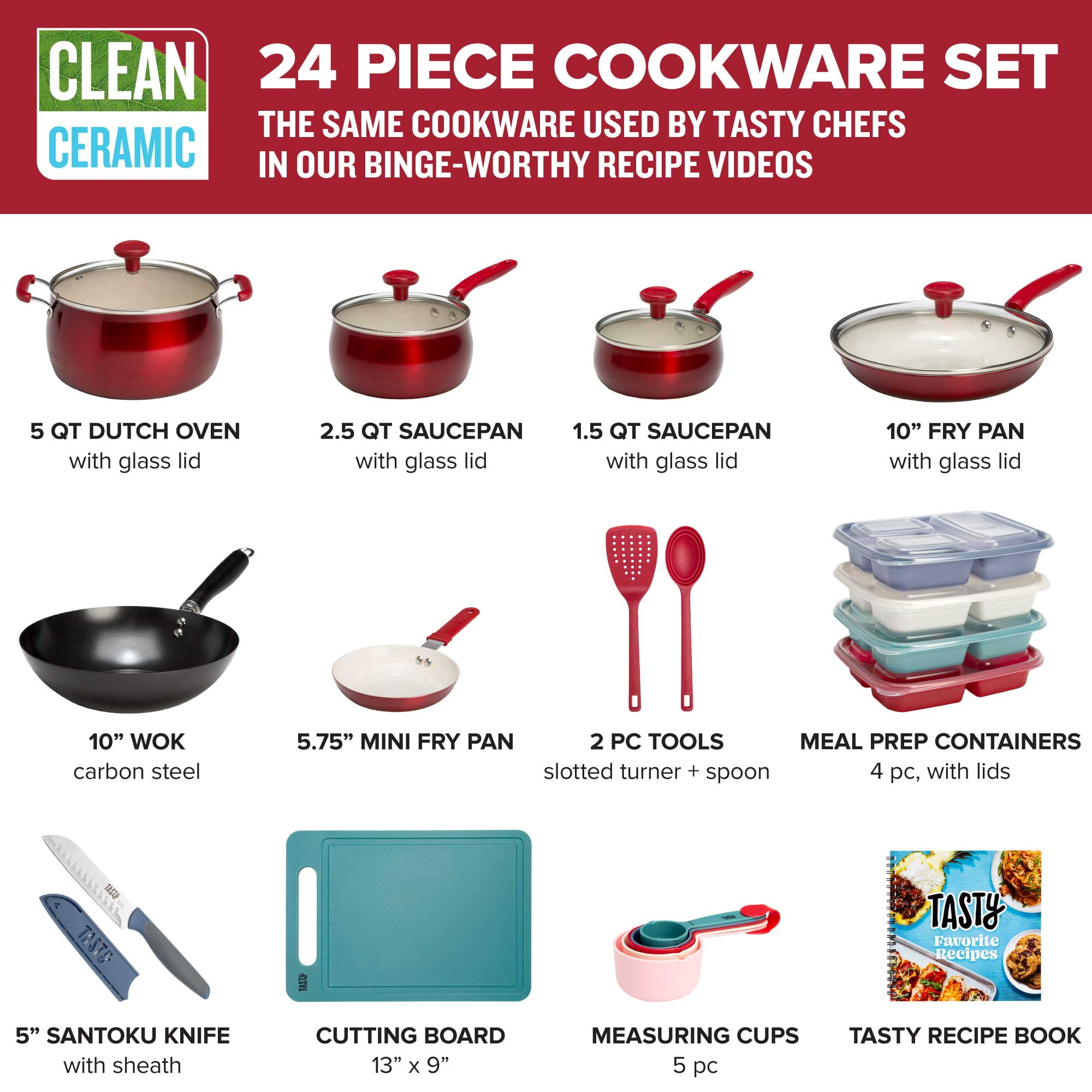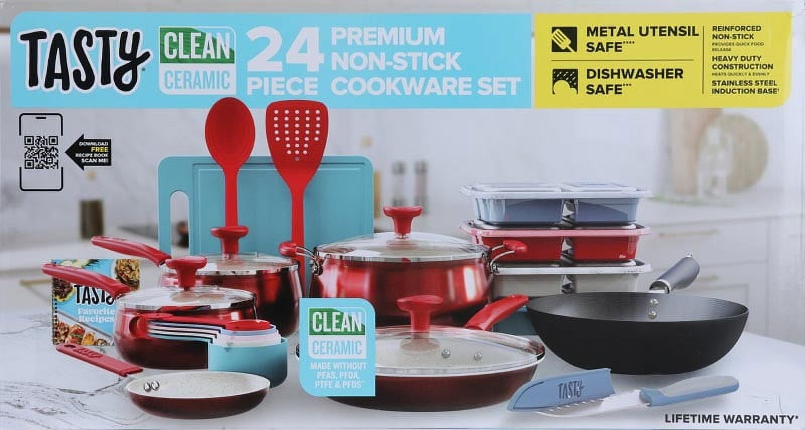 Tasty Clean Ceramic 24 Piece Non-Stick Aluminum Cookware Set, Red