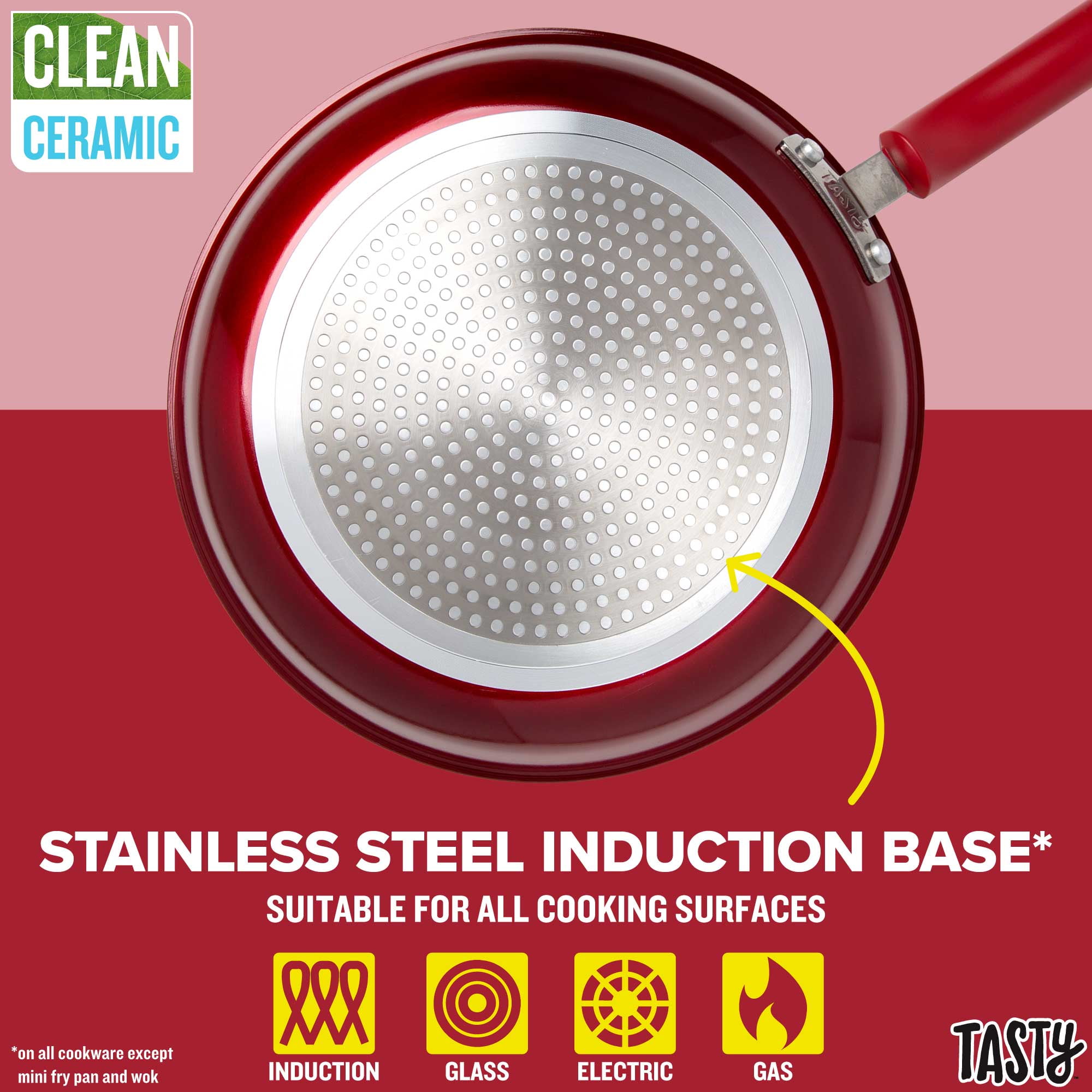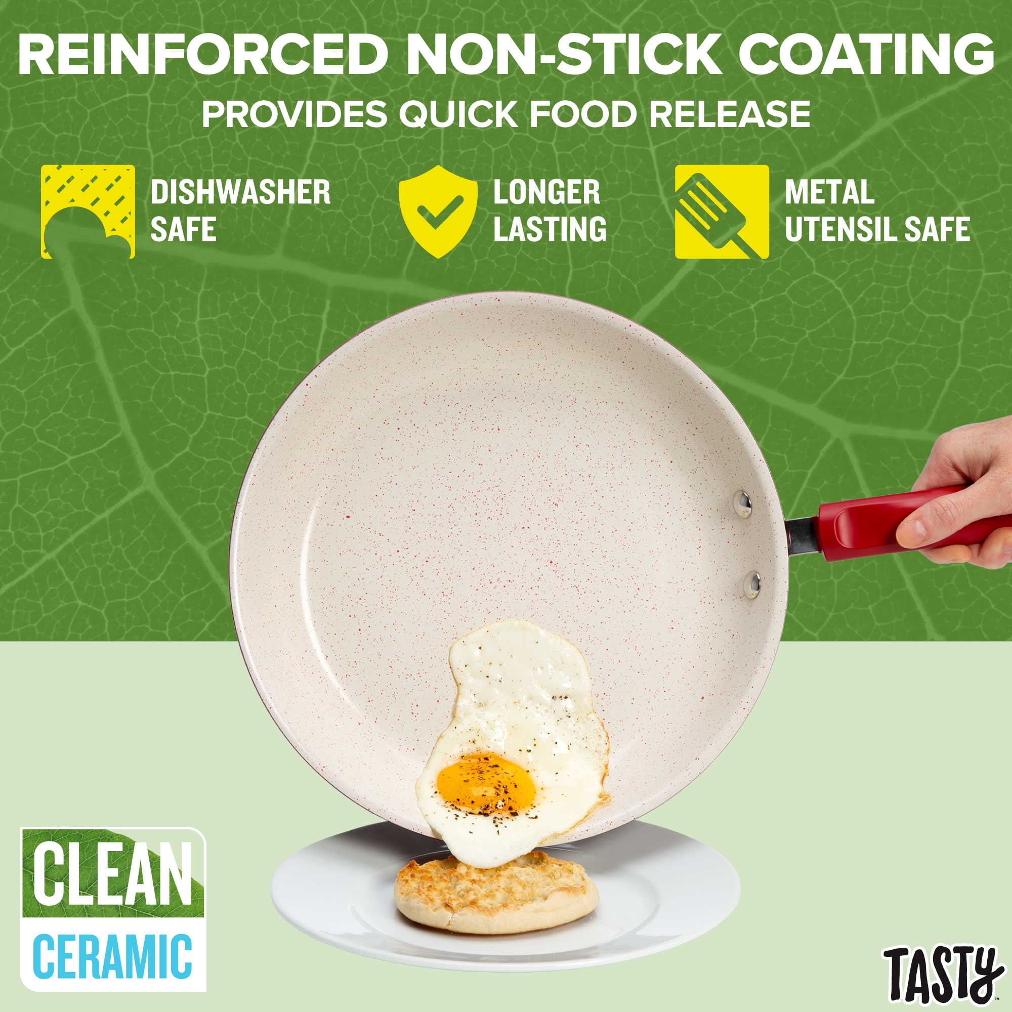 Better, Stronger, Longer-Lasting Non-Stick: This pots and pans set features a premium, reinforced speckled Clean Ceramic non-stick coating that allows food to easily slide out of the pan Healthy Cooking: The speckled ceramic non-stick coating is made without PFAS, PFOA, PTFE or PFOS Metal Utensil Safe: The durable speckled non-stick is metal utensil safe, though we still recommend using silicone, wood or nylon tools when cooking Dishwasher Safe for Easy Cleaning: This set is dishwasher safe for fast and easy clean-up (except the wok and knife, which are hand wash only!) Quick and Easy: This cookware’s heavy duty construction heats quickly and evenly Suitable for All Cooking Surfaces: Use the wok and cookware with stainless steel base on induction, electric, gas and glass! Includes: 5.75 inch mini fry pan, 10 inch fry pan with stainless steel base and glass lid, 1.5 quart saucepan with stainless steel base and glass lid, 2.5 quart saucepan with stainless steel base and glass lid, 5 quart Dutch oven with stainless steel base and glass lid, 13″x9″ cutting board, 5 inch santoku knife with sheath, 4 piece 3-section meal prep containers (34 ounce), 5 piece measuring cups, 10 inch carbon steel wok, solid spoon, slotted turner