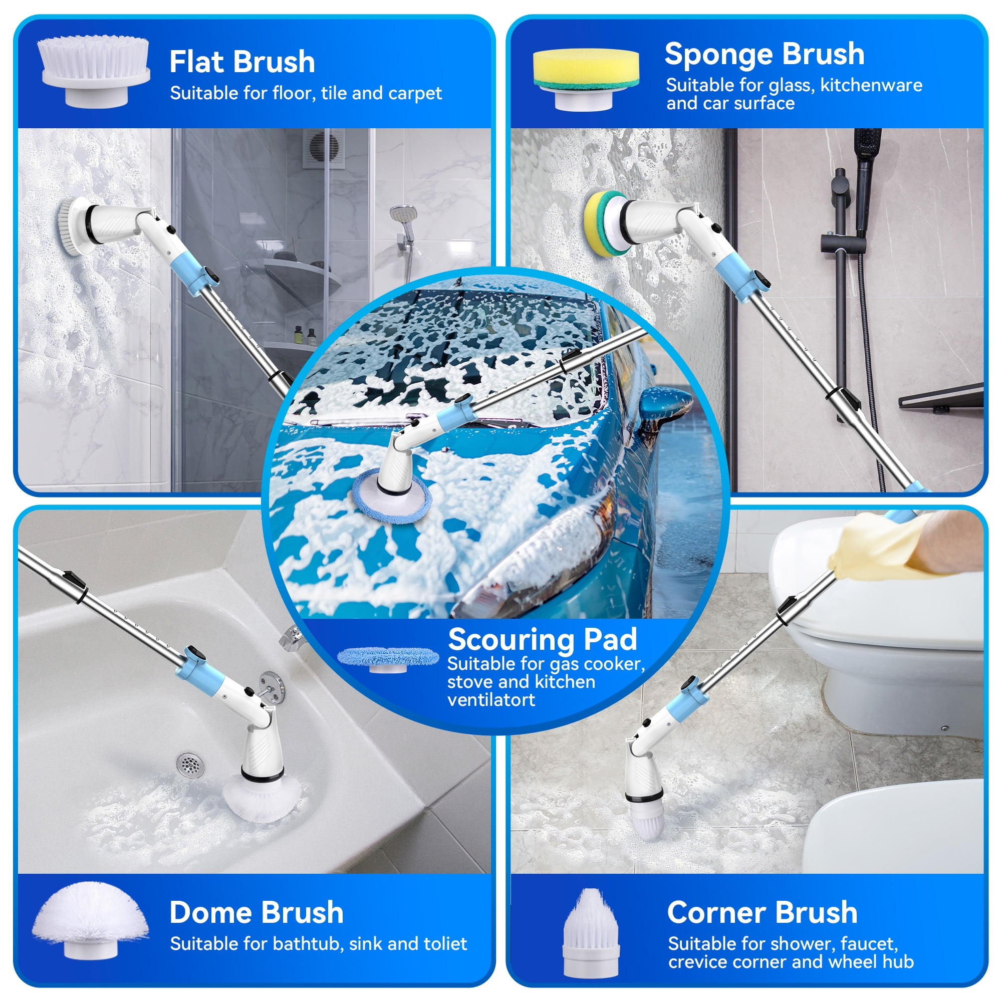 【Cordless Shower Cleaning Brush】If you are still suffering from the traditionally slow, ineffective and tiring cleaning method, the cordless brush scrubber electric cleaning brush may be your best choice, which is designed to use the high-speed rotating brush head to take away all the hard-to-remove stains and can greatly improve your cleaning efficienc 【Powerful Electric Spin Scrubber】Shower cleaning brush power is 21W with 2000mAh battery. There are two modes, high speed mode of 550RPM/min and low speed mode of 450RPM/min. The electric scrubber can clean stubborn stains and grouts and it is great for deep cleaning (Please use the scrubber with detergent or cleanser) 【Fast Charging】Electric scrubber brush for cleaning offers up to 180 mins runtimes after fully charged for 2 hours. Enough time to keep your entire house sparkling clean. A single charge can meet 2-3 times of whole bathroom deep cleaning needs 【Adjustable Brush Heads】 Electric spin brush head angle is adjustable and flexible, No need to bend over or change positions while cleaning, and this electric spin scrubber can adapt to all kinds of hard-to-reach places, such as shower head, sink or faucet gap and so on 【Extendable Handle】Bending over to clean has been torture for people who had bad backs or vulnerable knees. The shower cleaning brush can be extended to 3 lengths, so you do not need to bend over or kneel down to scrub the tub and floors 【Gret for Nooks and Grannies】 Shower spin scrubber comes with 5 detachable brushes, Dome brushes for cleaning bathtub and toilet; Large flat brushes for showers, and floors; Small flat brushes for detail work; Corner brushes for baseboards, door frames tiles with deep grout. Each brush can get deep into the corner to remove grout and stains effectively 【Easy Storage】Comes with a hanging bracket, you can use the bracket to hang the brush for storage or disassemble the brush for storage in a drawer