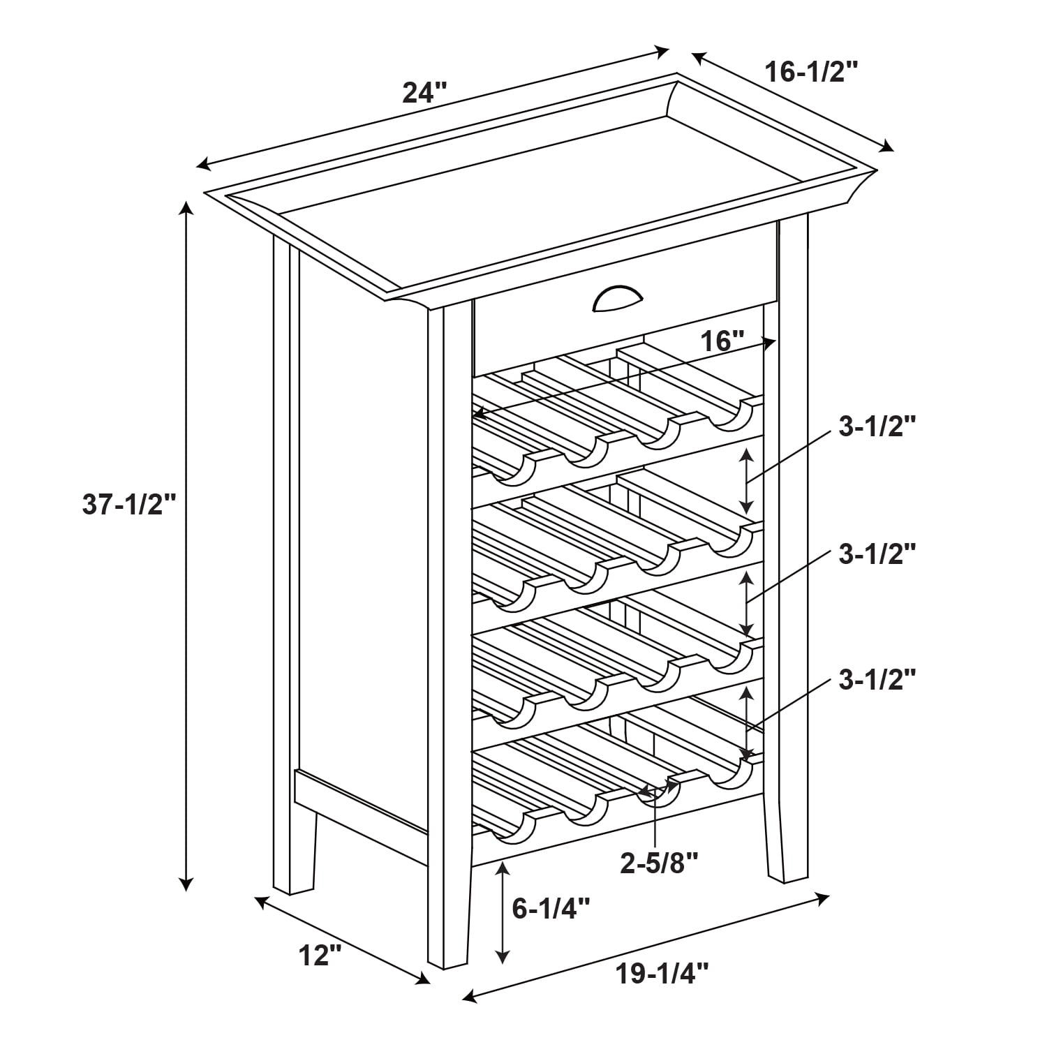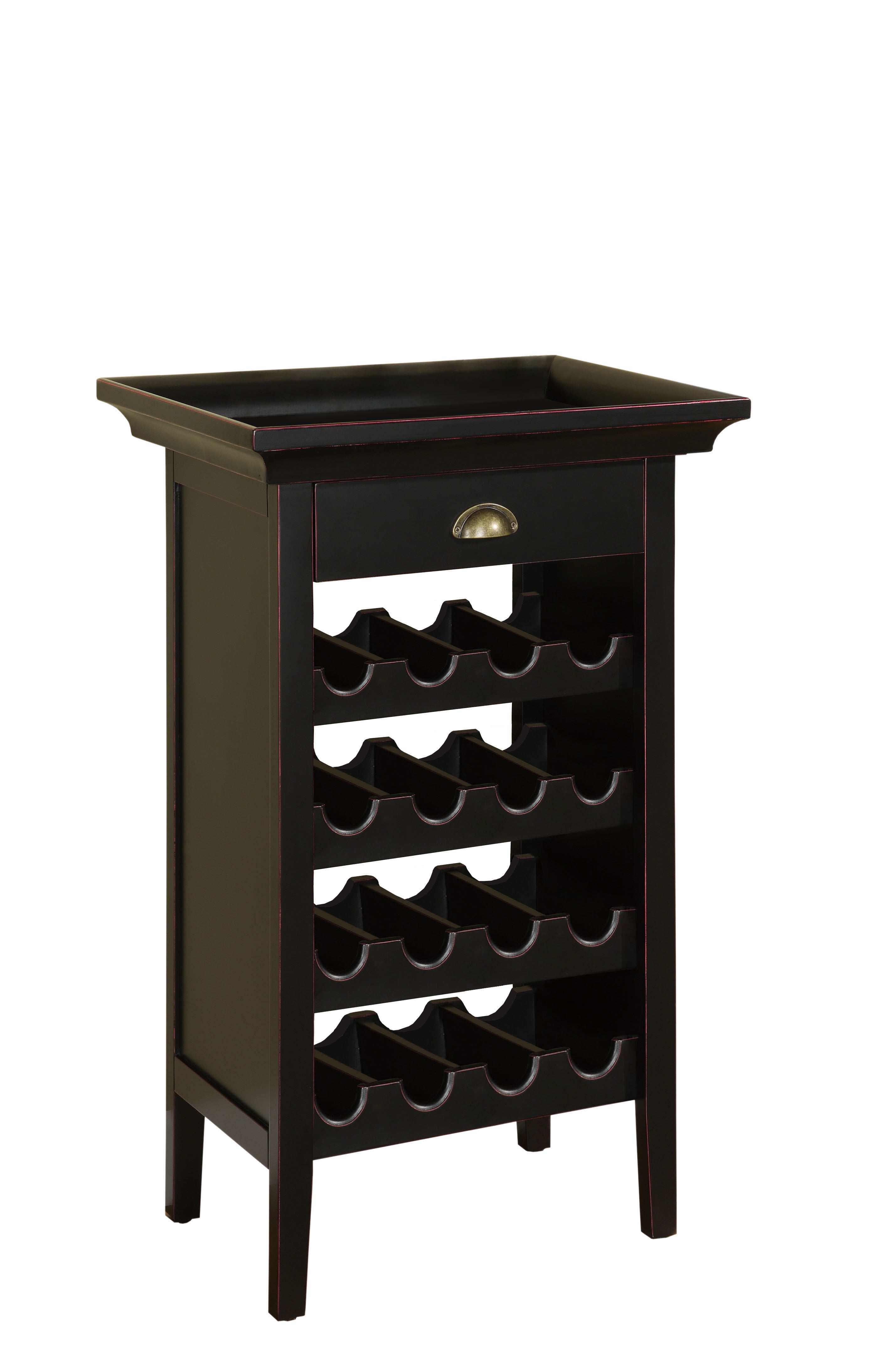 Removable tray top allows you to carry drinks and snacks to other areas of your home. Single drawer with pull 16-Bottle Capacity Black Finish Some assembly required Assembled Dimensions: 24″ W x 16.5″ D x 37.75″ H Weight Capacity: 50 lbs for Top Ships in 1 box
