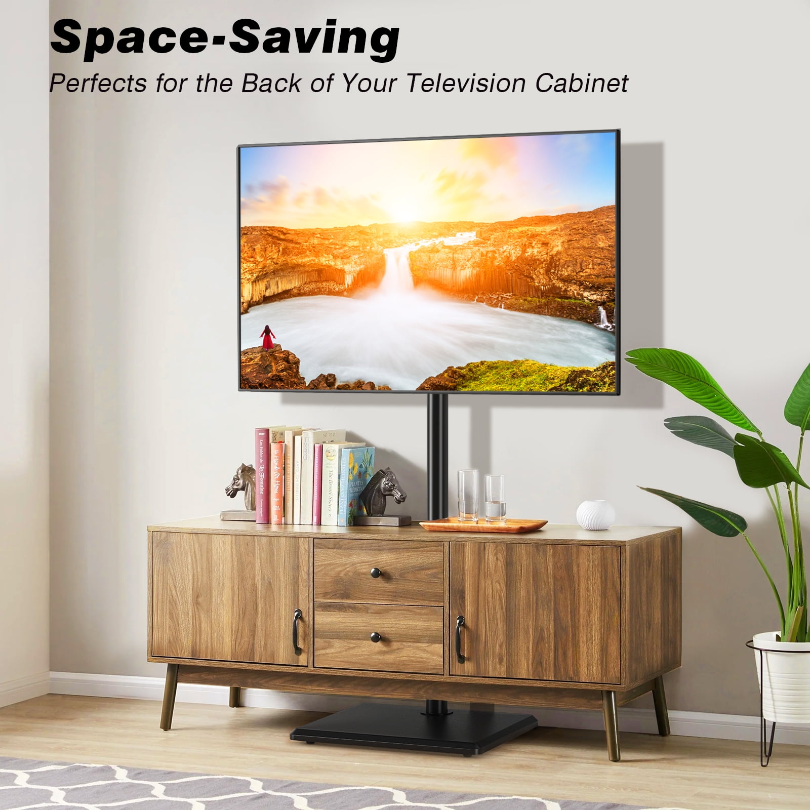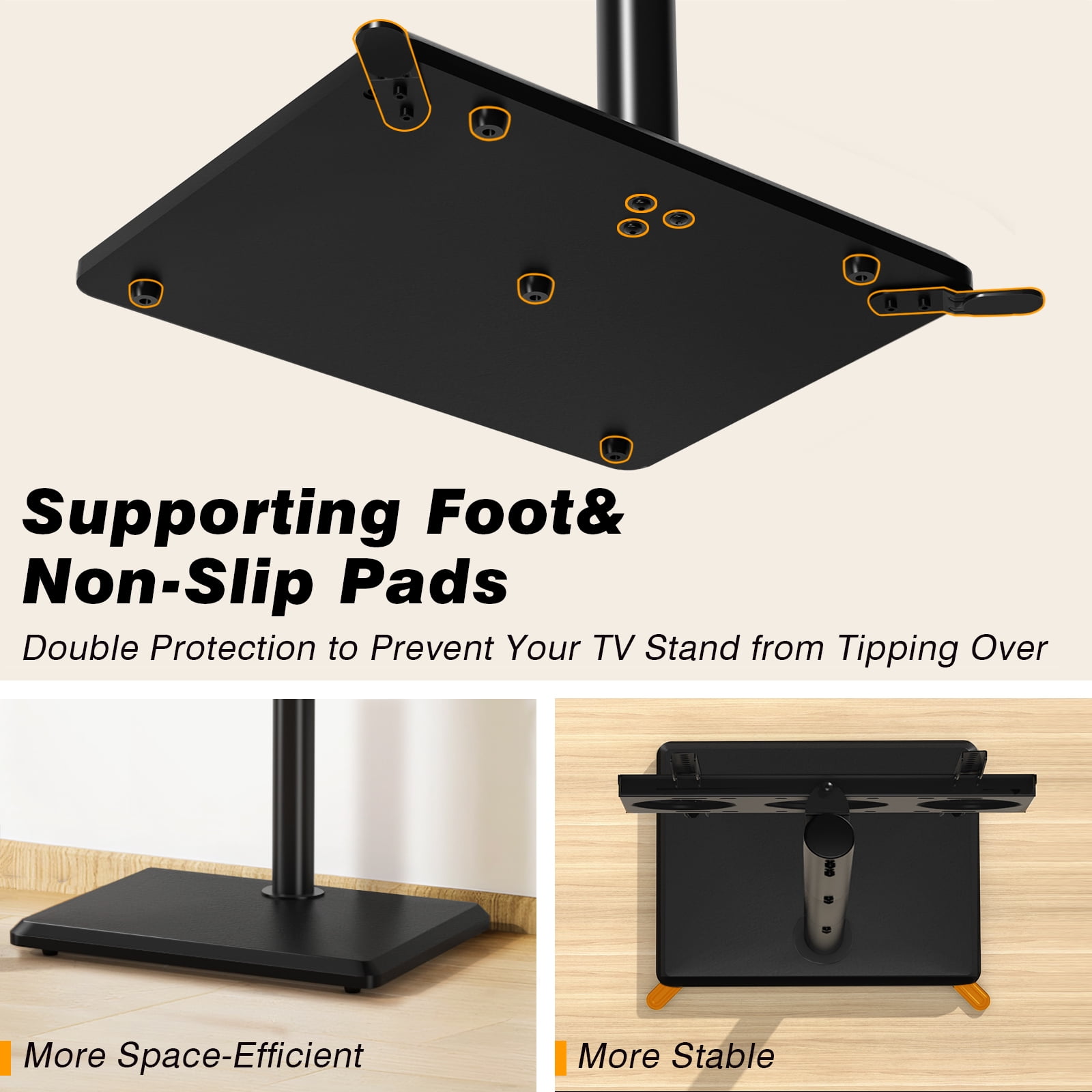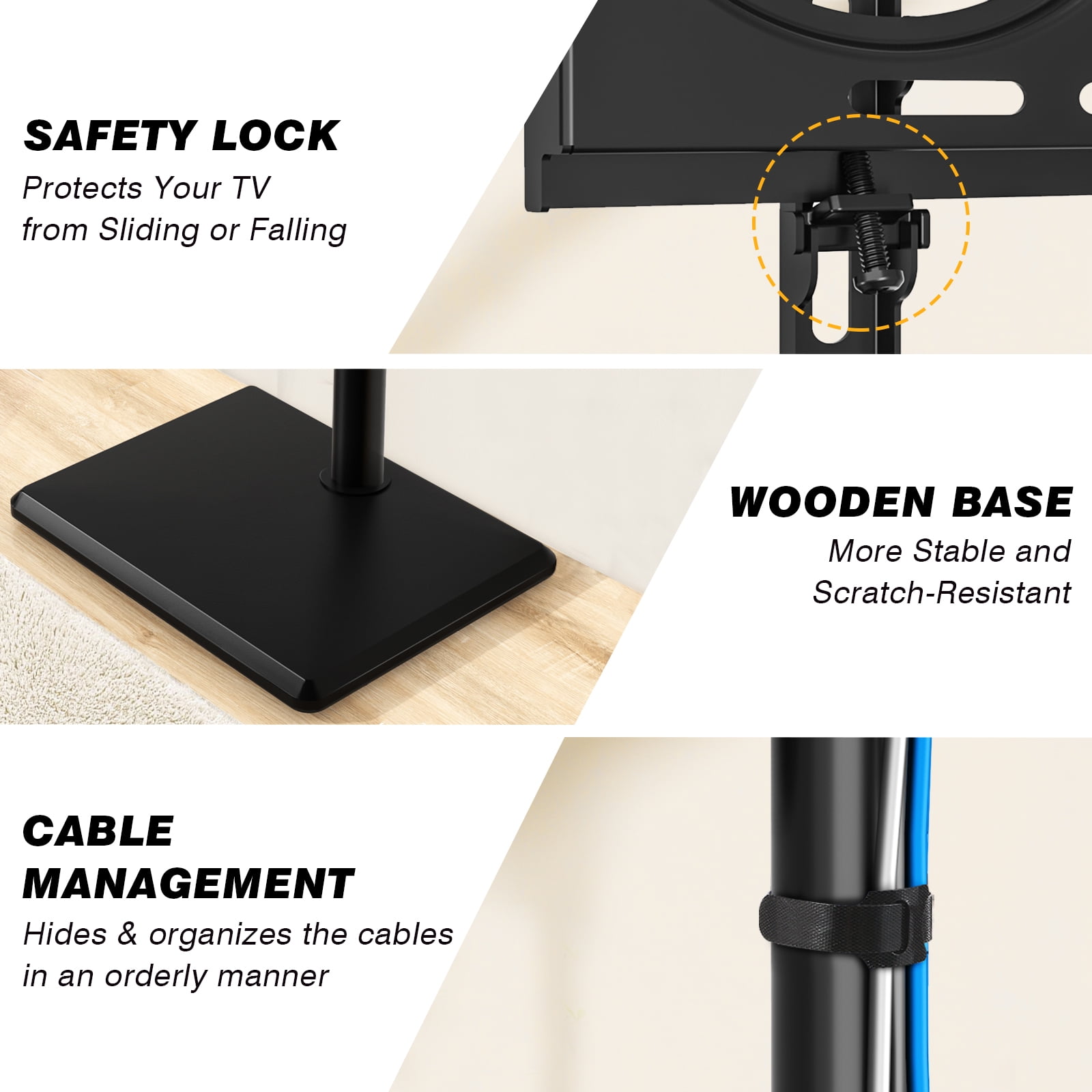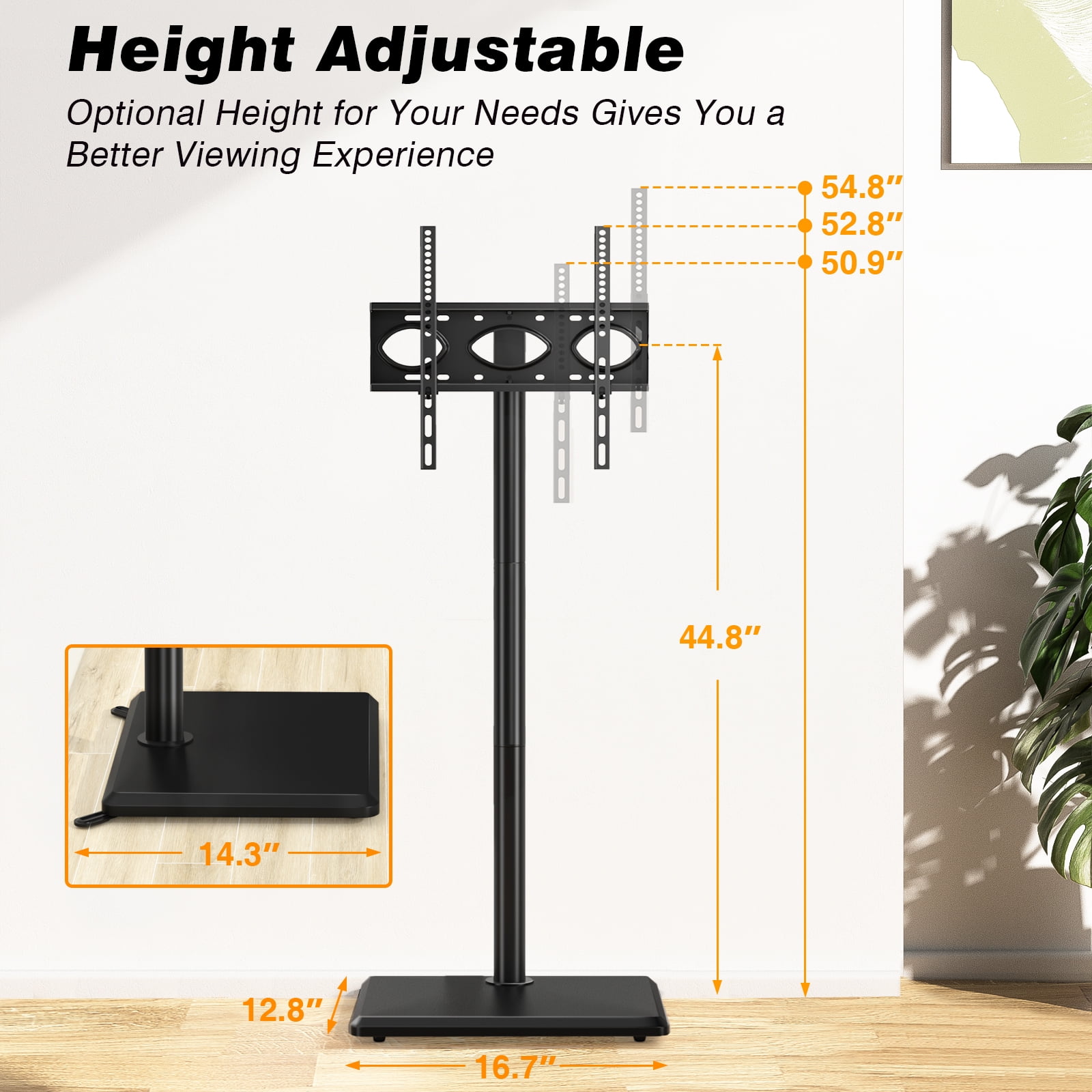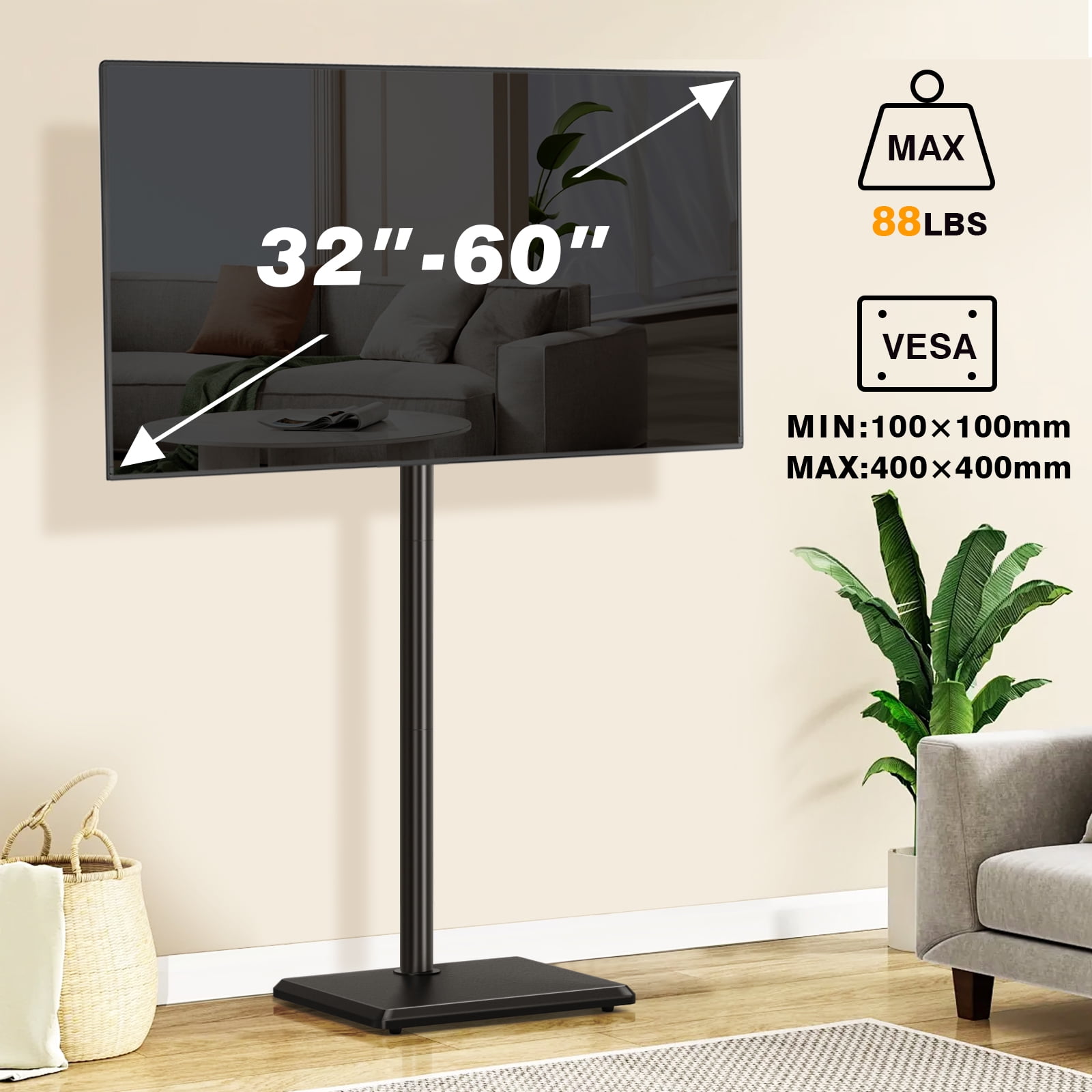 Universal TV stand fit for 32 35 40 42 43 45 49 50 52 55 60 inch TVs, standing weight capacity up to 88 lbs. Swivel TV stand turns 35 degrees left or right, wider viewing angle than other TV mount stands. Expandable support feet make the modern TV stand more stable, while hiding it can save space. Adjustable TV stand offers 3 height levels ranging from 50.9 to 54.8 inch. Metal TV stand for 60″ TV comes with cable management, which deftly hides your wires. Tall TV stand mounting bracket VESA pattern meet following: 100×100/ 200×100/ 200×200/ 300×200/ 300×300/ 400×200/ 400×300/ 400x400mm. Floor TV stand swivel mount stand poles can be adjusted from 17.3″W x 14.4″D x 37.9″H. Safety lock that prevents the TV from falling, much safer. Black TV floor stand comes with 5 years warranty.
