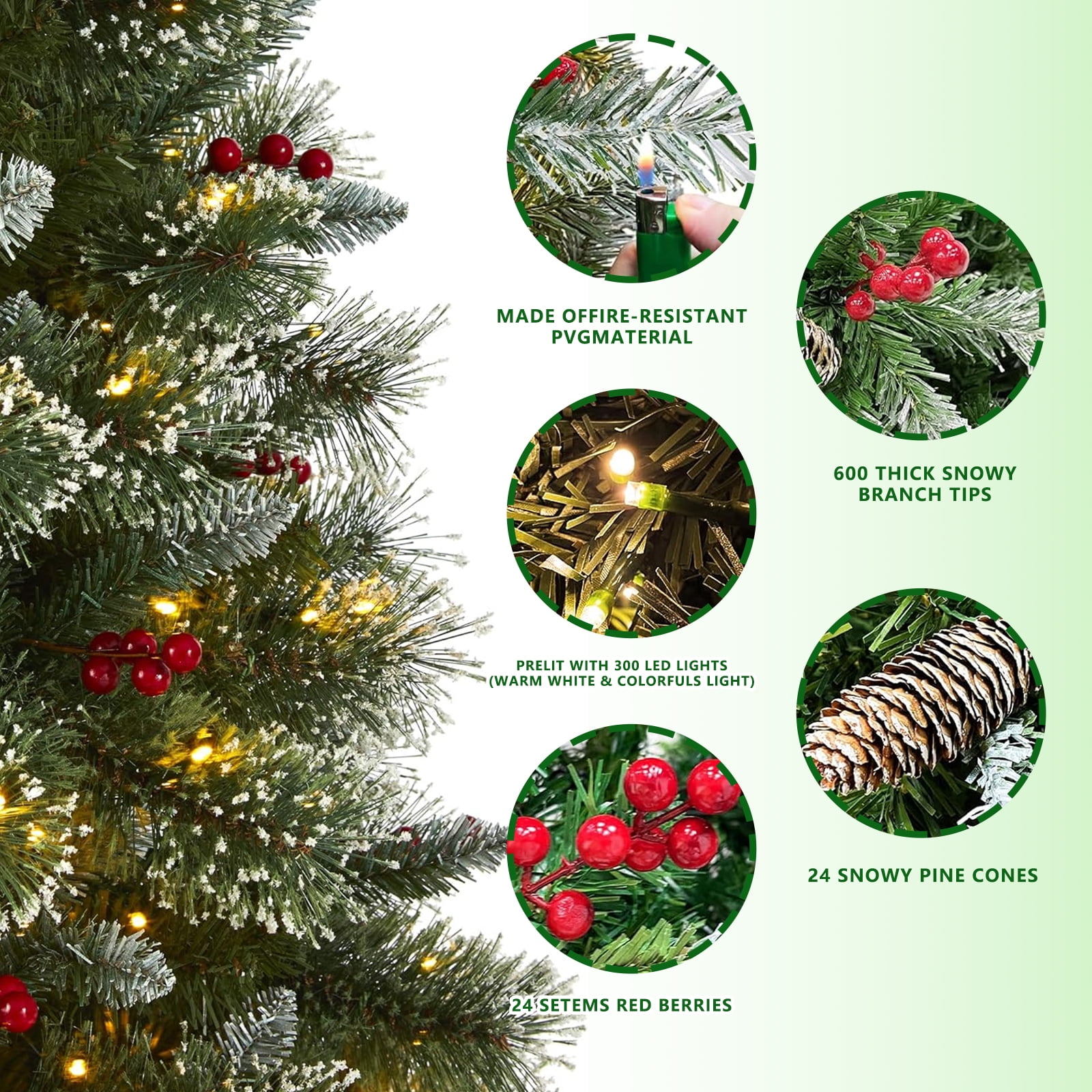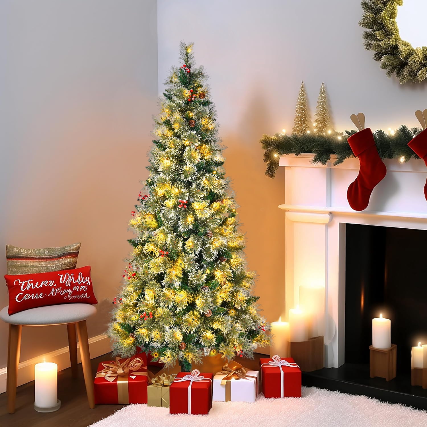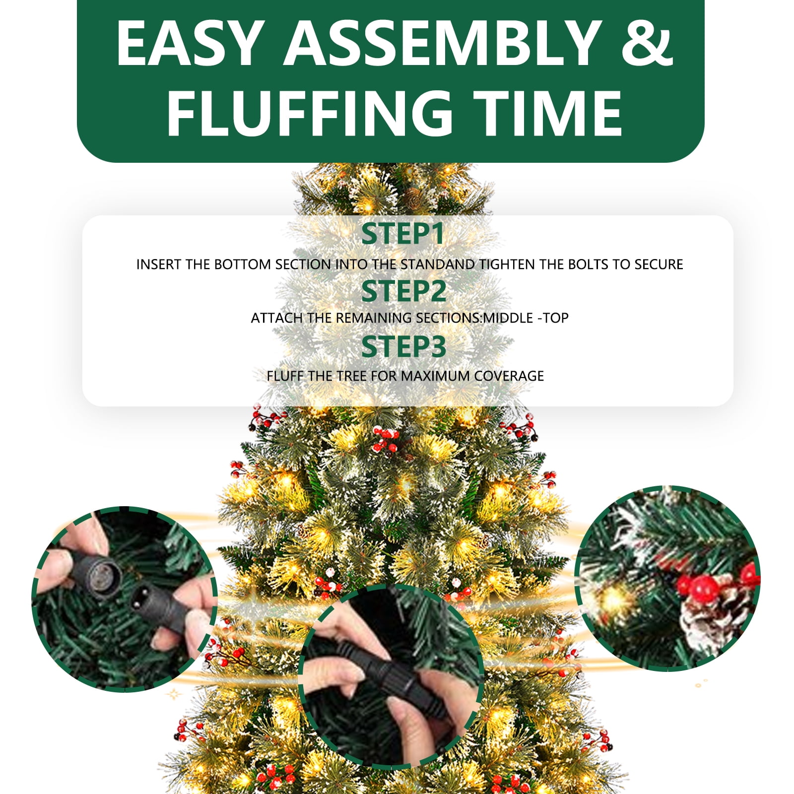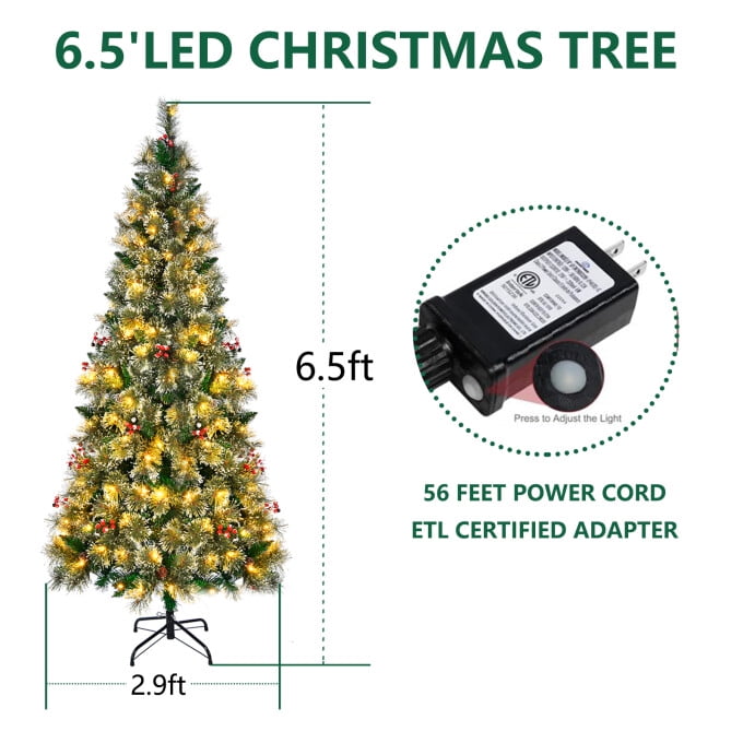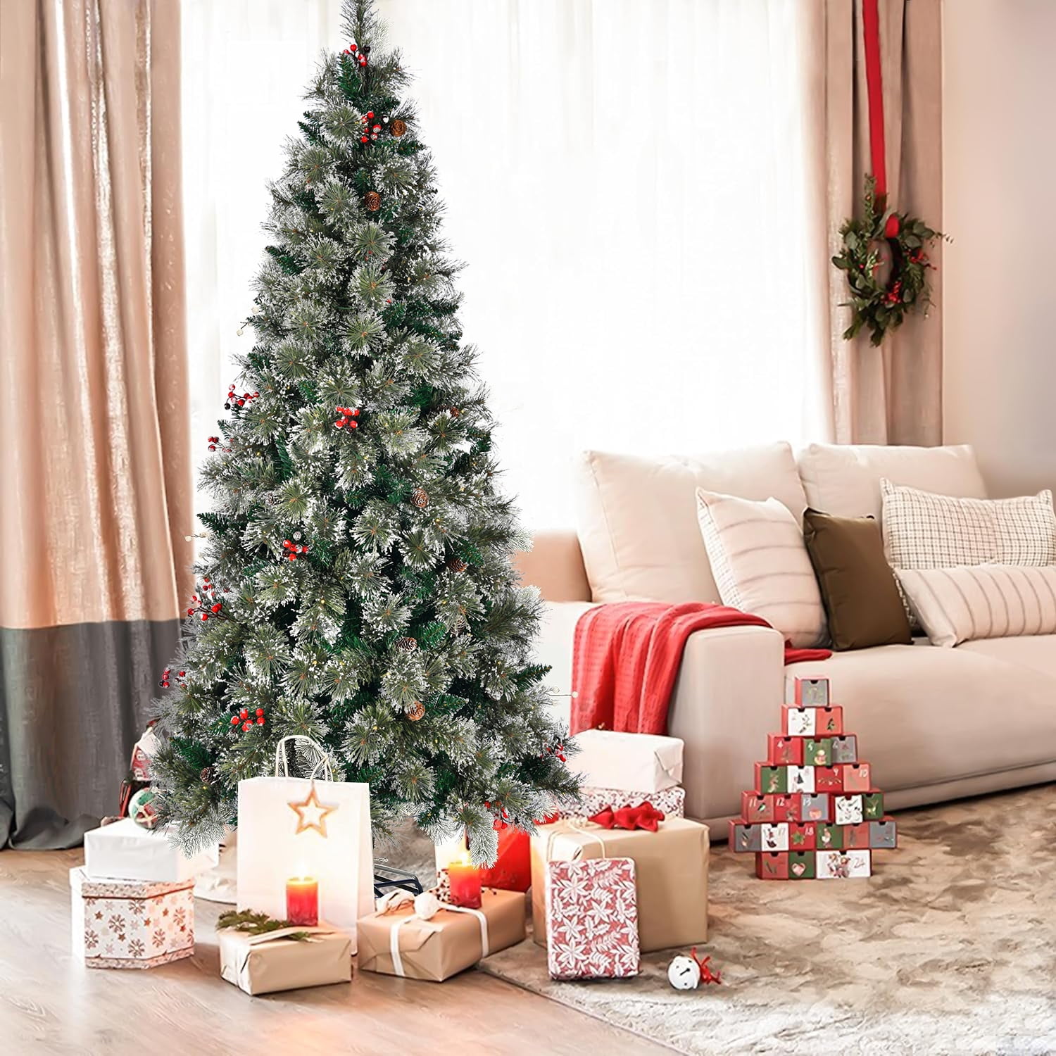 Are you still looking for a Christmas tree that fits the Christmas atmosphere? This holiday tree is the perfect choice for decorating homes, offices, and shops. Its natural look let it great in traditional and modern homes, and its flexible branches are easy to shape,you can also add your own creative ideas and embellishments to give it a sprightly look. About this item Perfect Decoration: This Christmas tree has 600 branch tips made of snowy PVC leaves and silver glittering pine needles to add a touch of sparkle to your holiday. And the Christmas tree is adorned with 24 clusters of vivid red berries and 24 real pine cones, bringing a natural element to your festive. Pre-lit with 200 LED Lights: Equipped with 200 warm-white LED lights that illuminate soft glow, the pre-lit Xmas tree creates a cozy atmosphere during the festive season. Durable & Stable Design: The leaves of the artificial Christmas tree are crafted from 100% new PVC material, which is flame-retardant, odorless, and non-allergic, guaranteeing the safety of your family. Besides, the metal base with non-slip pads is less prone to scratch the floor while ensuring stable standing. Easy to Install: The Xmas tree features a hinged structure, allowing the branches to automatically spread out, saving you valuable time and effort. With sectioned design, the Christmas tree can be easily assembled and detached, enabling you to store the tree once the holiday season is over. Multi-scene Display: Whether you intend to create a festive atmosphere in your home, store, office or any other space, the Xmas tree is a perfect choice. Specifications: Color: Green + Red Material: PVC and Metal Height: 6.5 ft Number of Branch Tips: 600 Package includes: 1 x Christmas Tree 1 x Instruction