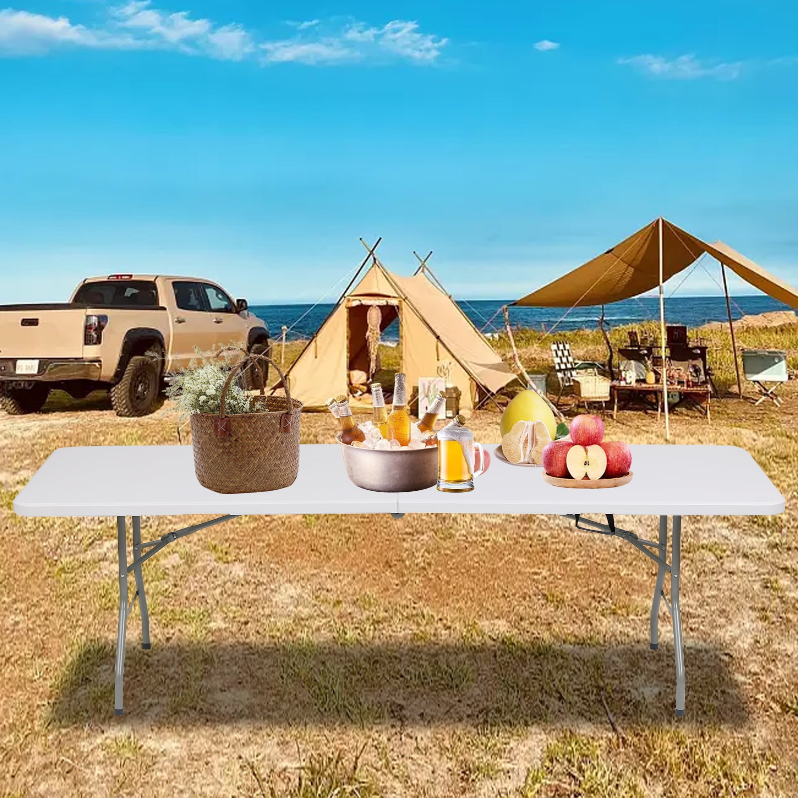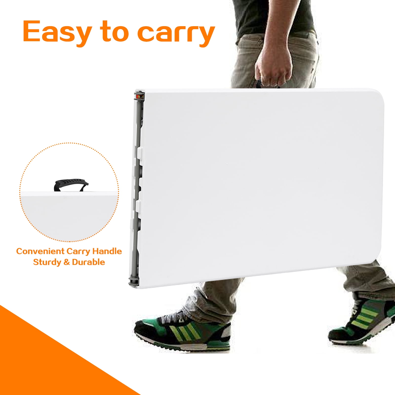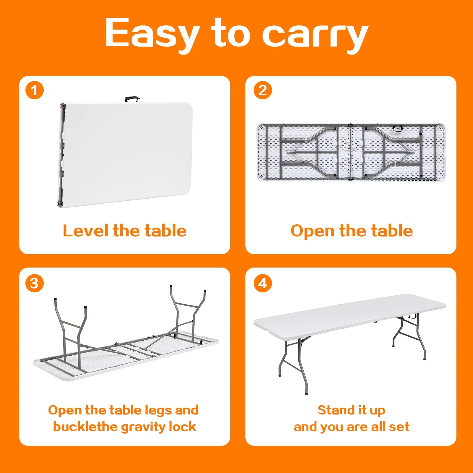 Our folding table is the perfect solution for those seeking both functionality and space-saving design. With its compact and foldable feature, it can be easily stored when not in use, making it suitable for small spaces. What sets our table apart is its versatility. Weighing in at just 40.6 pounds, it’s incredibly lightweight and easy to move around. Whether you need a dining table for family gatherings, a picnic table for outdoor adventures, or a party table for special occasions, this portable square table has you covered. Key Features: Compact & Foldable: Easily folds up for convenient storage, suitable for all ages. Multipurpose: Weighing only 40.6 pounds, it’s perfect as a dining, picnic, or party table. Sturdy Construction: Premium HDPE top and solid steel legs ensure durability and can hold up to 330 lbs. Stable Legs: Arced tubes and precise leg locking hardware eliminate wobbling. Perfect Size: Measures 96 x 30 x 30 inches, ideal for small spaces. Specifications: Color: White Materials: HDPE, Steel Assembled dimensions:96″L x 30″W x 30”H Folded dimensions: 48″L x 30”W x 3.4″H Weight: 37.5lbs Seating Capacity: 10 Adults Package Included: 1 x Folding Table