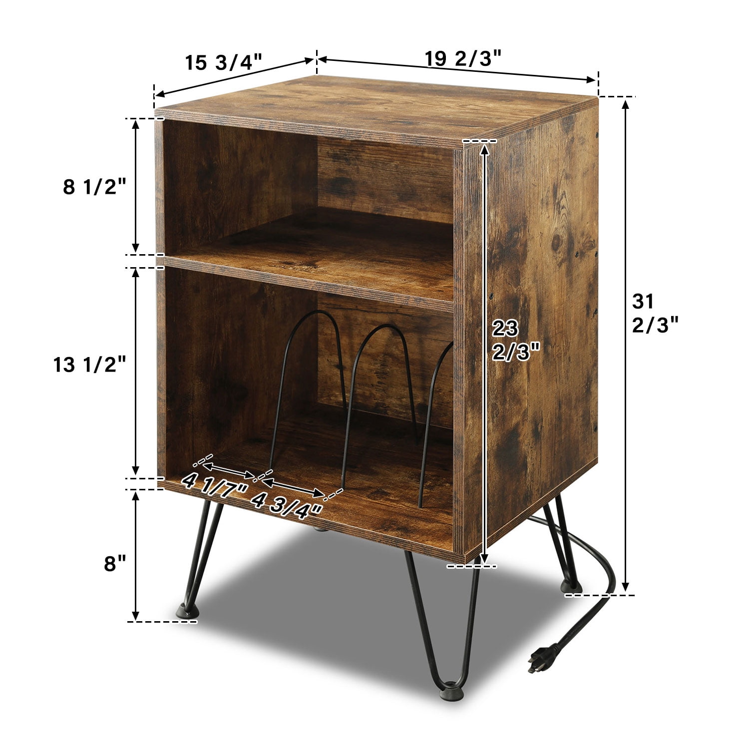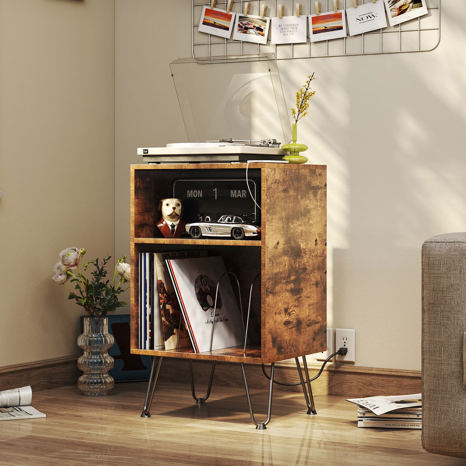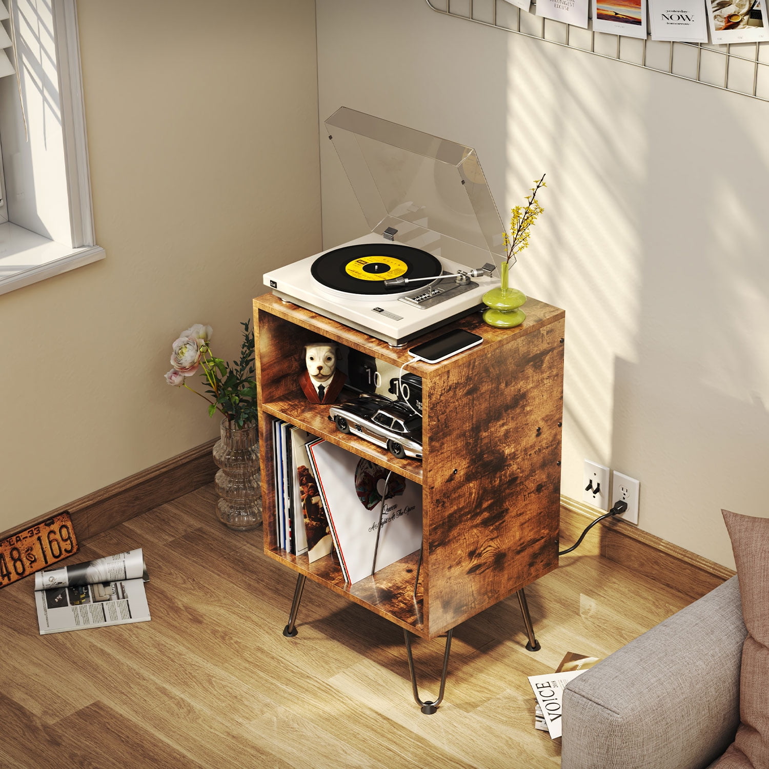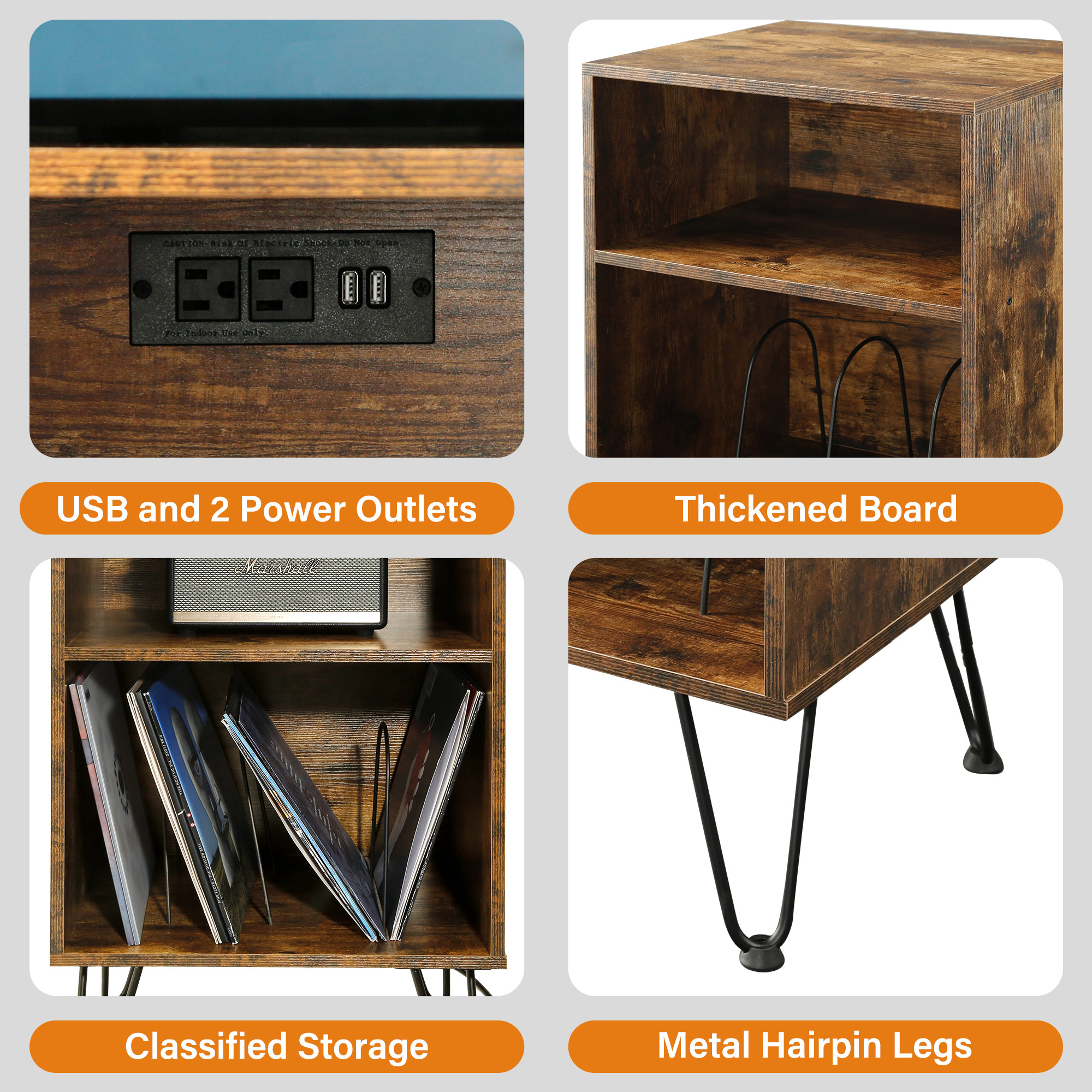 TC-Homeny Revival Series 3-Tier Record Player Stand with 2 USB Ports & Metal Legs, Rustic Brown Reliable material and great durability with a combination of Revival series and PIVOT series Mid-century modern design featuring classic hairpin legs and a brown wooden board Upper space compatible with most record players and includes built-in hidden sockets Three tiers of storage accommodating at least 70 albums with quick-release dividers Designed with a charging socket featuring 2 USB ports and 2 standard plug sockets Easy assembly process with numbered parts and installation instructions Lightweight design for easy movement and versatility in different spaces