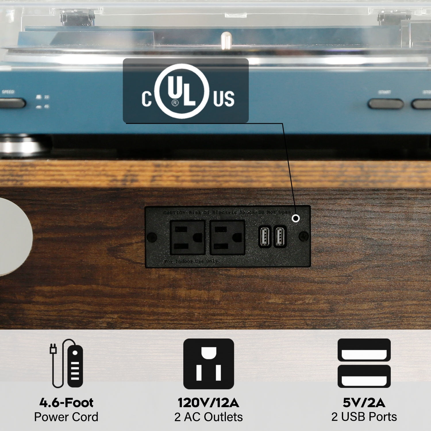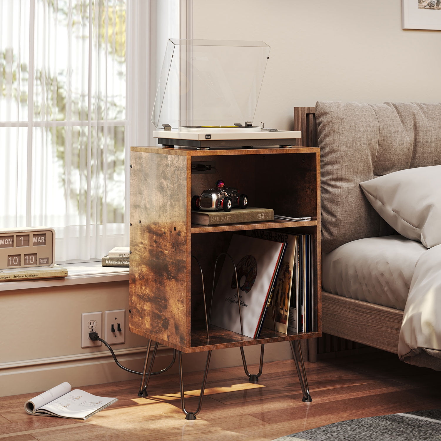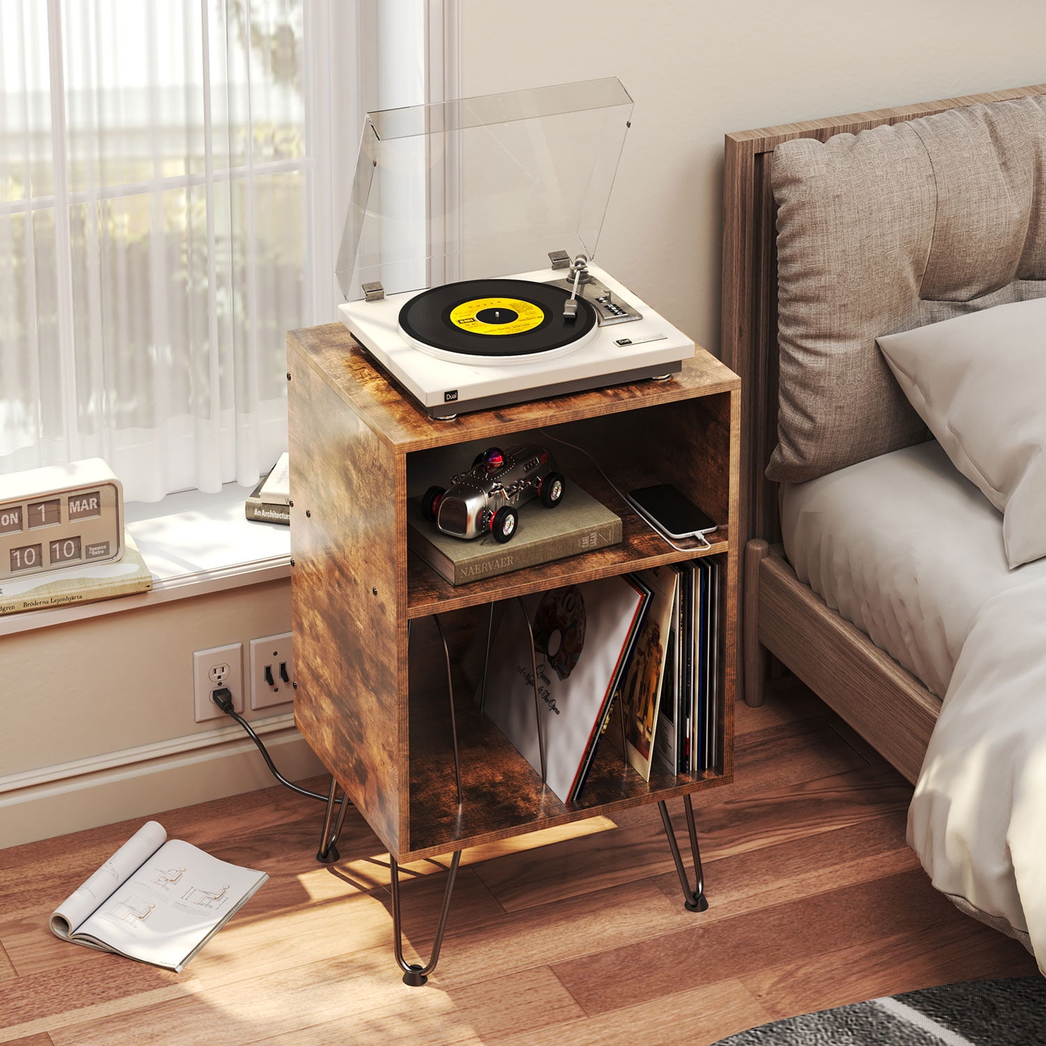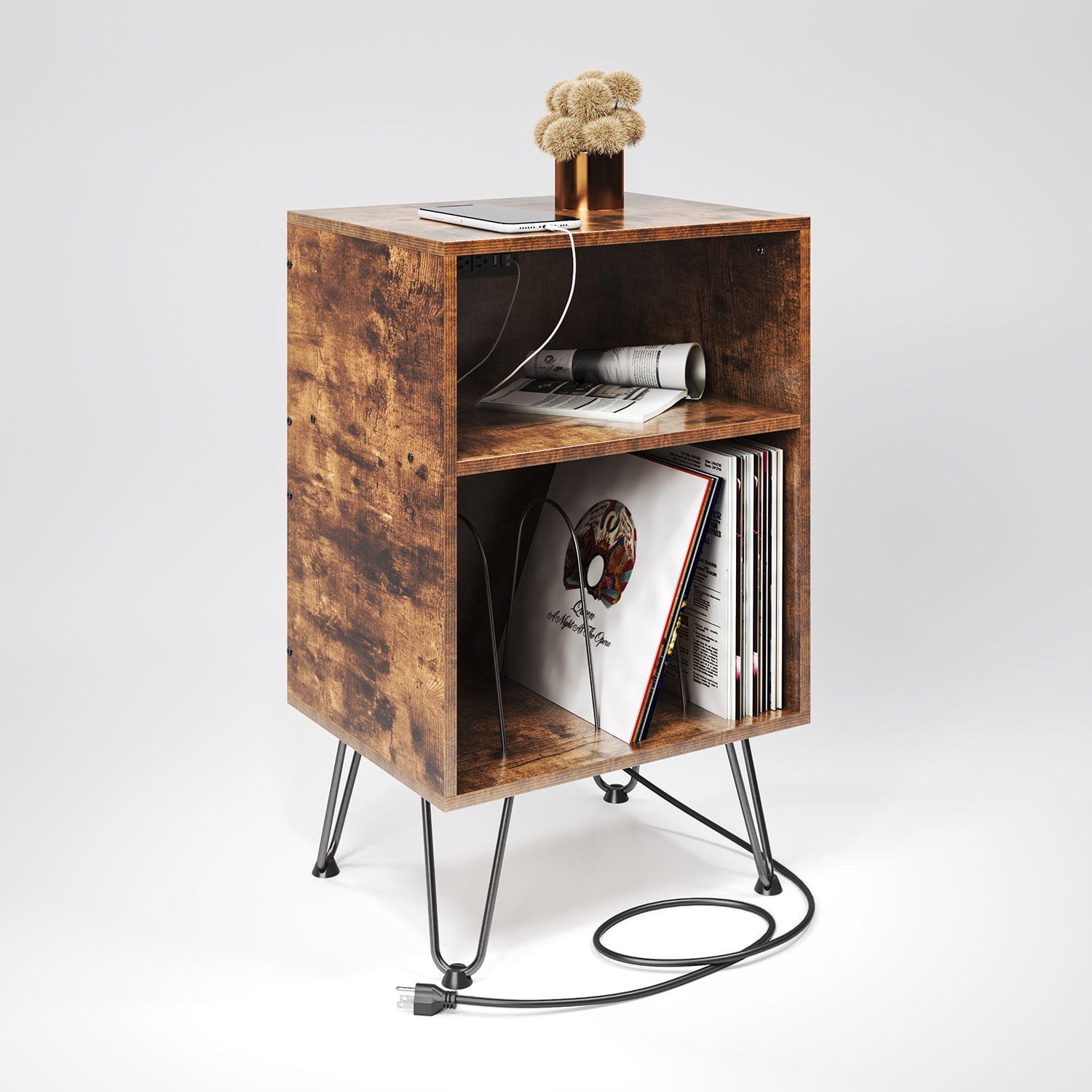 TC-Homeny Revival Series 3-Tier Record Player Stand with 2 USB Ports & Metal Legs, Rustic Brown Reliable material and great durability with a combination of Revival series and PIVOT series Mid-century modern design featuring classic hairpin legs and a brown wooden board Upper space compatible with most record players and includes built-in hidden sockets Three tiers of storage accommodating at least 70 albums with quick-release dividers Designed with a charging socket featuring 2 USB ports and 2 standard plug sockets Easy assembly process with numbered parts and installation instructions Lightweight design for easy movement and versatility in different spaces
