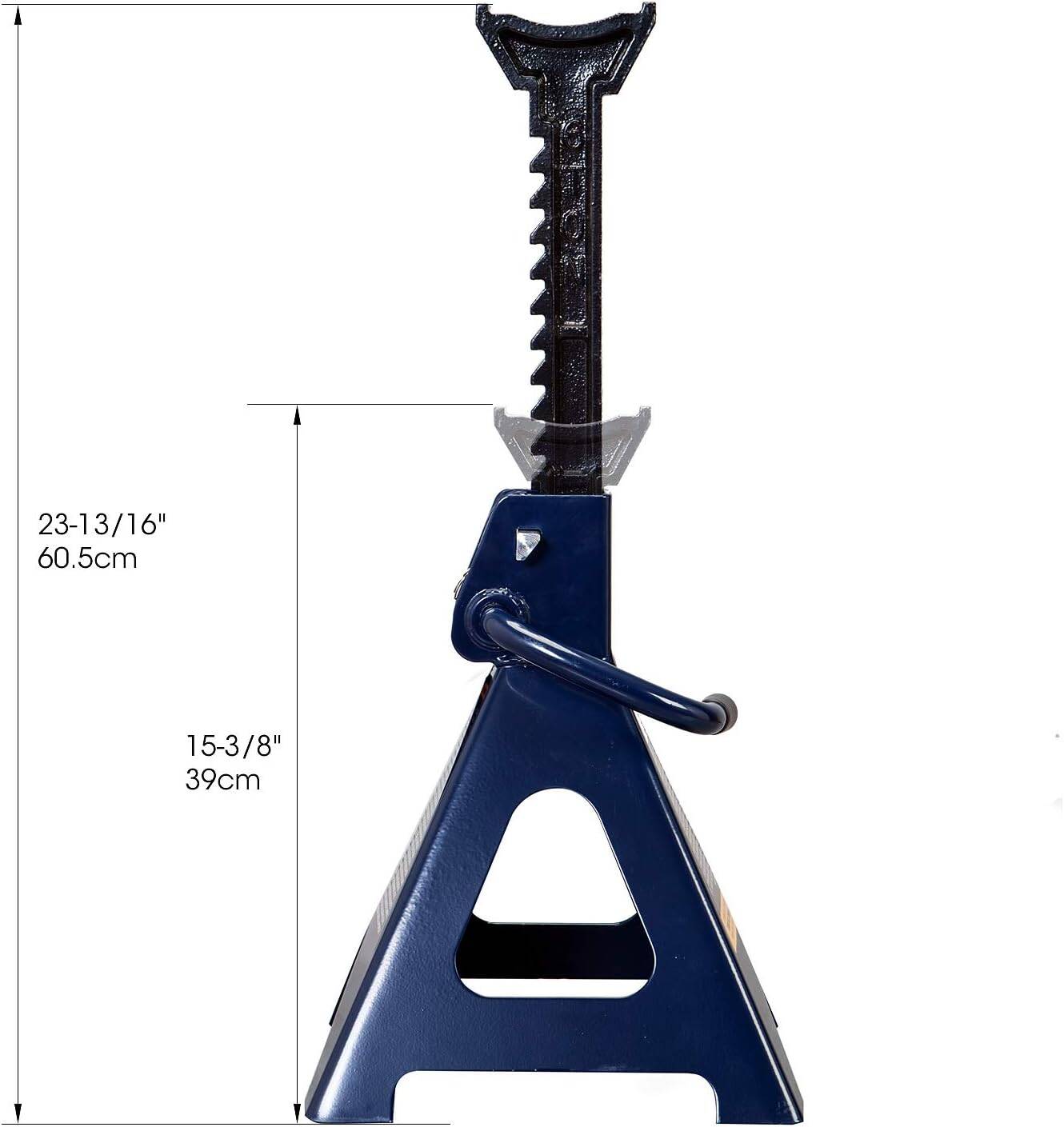 Double locking jack stands that are sold as a pair; Height ranges from 15-3/8″ to 23-13/16″ with a 6 ton (12,000 lb) capacity each Equipped with a double-lock protection feature, increasing safety by 200% Saddle has a large surface area that provides better contact with the load being supported; Large foot base size of 10-13/16″ by 9-7/16″ Single piece, self-locking, multi-position, forged iron ratchet bar provides precise adjustments