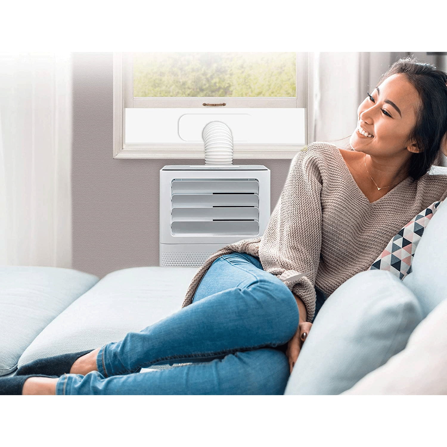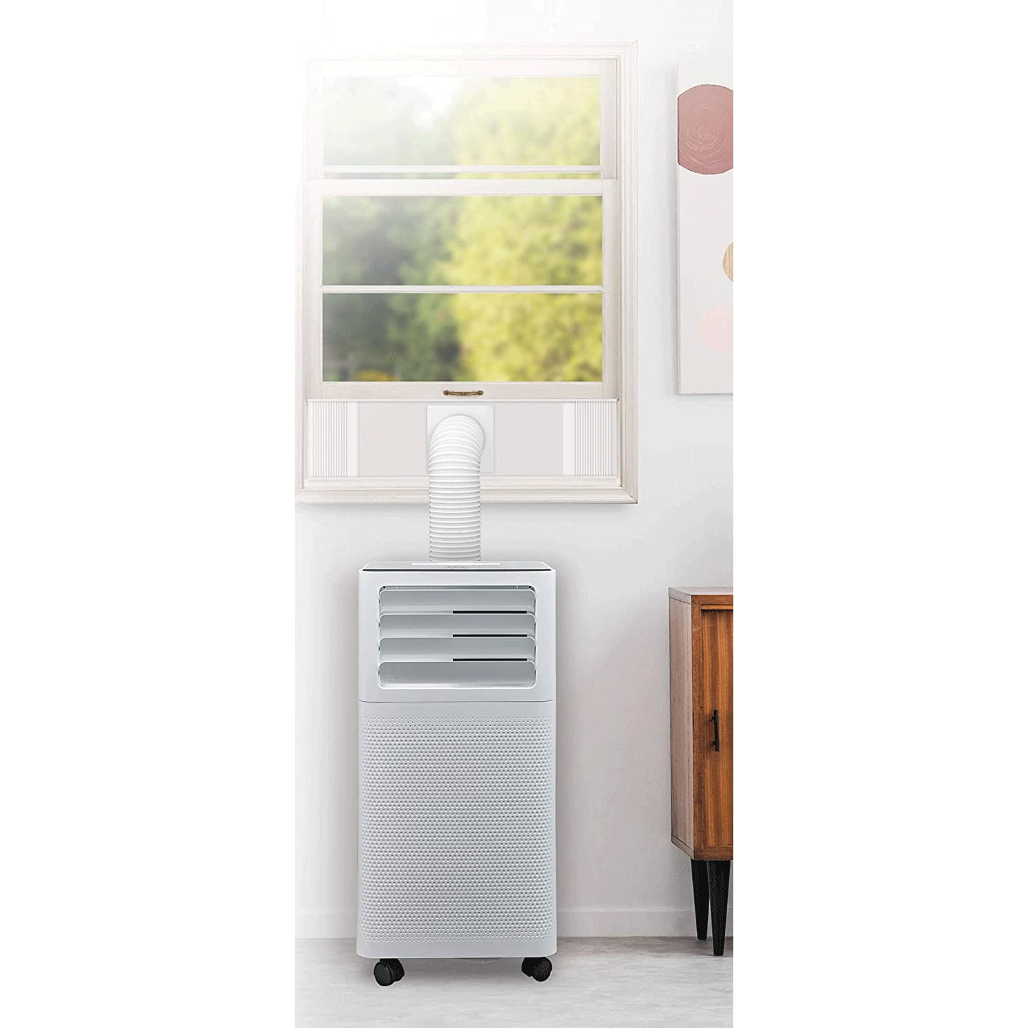 Choose among the fan speeds and settings to keep any room cool, clean, and dry The 8,000 BTU portable air conditioner is powerful and features many fan speeds that allow you the best comfort level Set up your portable AC unit in minutes using the included hose and window kit Quiet operation keeps you cool without disturbing your slumber 24-hour timer and sleep mode can lower your energy bill while keeping you comfortable Easily control with the simple to use remote that allows you to switch the temperature from your couch A washable and reusable filter that helps reduce bacteria, room odors, and other airborne particles Color: White Dimensions ( L x W x H): 12.6 x 12.6 x 26.38 inches Weight: 44 pounds