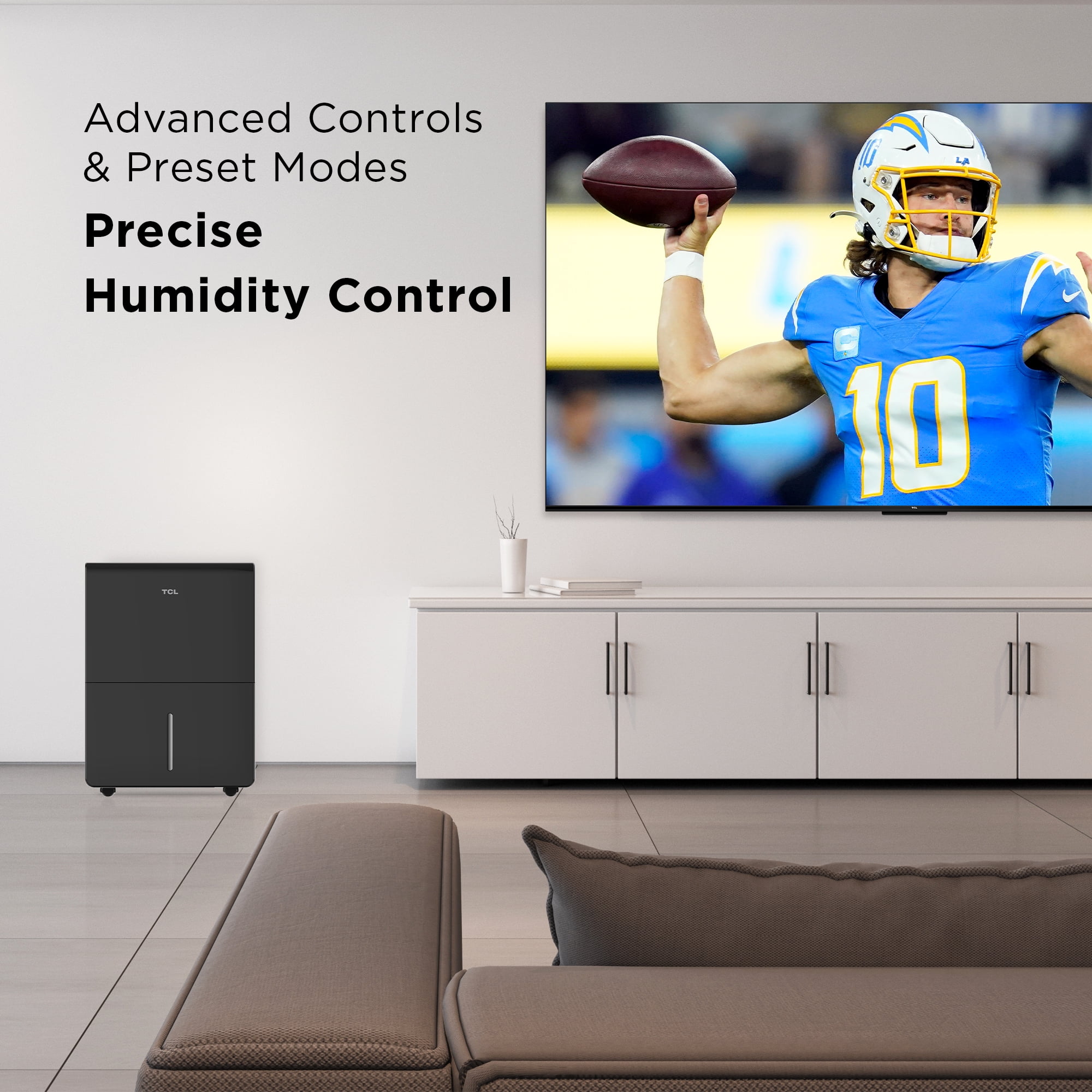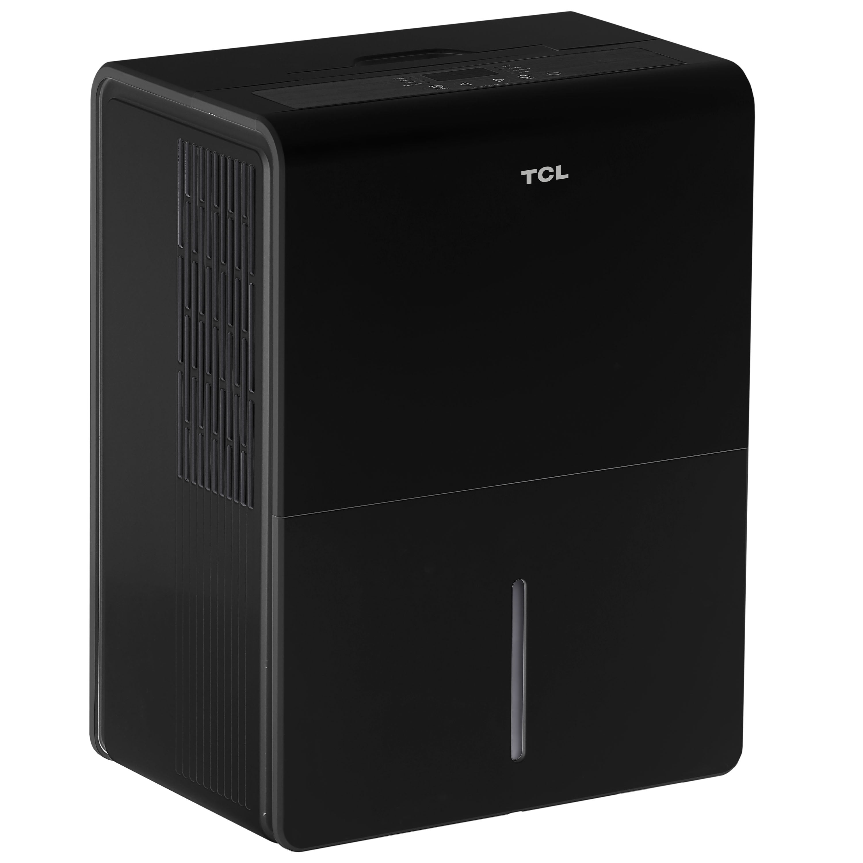 Remove Moisture Throughout Your Home: Choose your perfect comfort level with new TCL’s 50 Pint dehumidifier that removes humidity in areas up to 4,500 sq. ft.*^ Precise Humidity Control: Take control of your home’s air with two fan speeds, an adjustable humidity display, and preset modes (dry, turbo, continuous). Multiple Ways to Drain: With an easily removable water tank and a continuous drain pump (16 ft. hose included), choose the method of draining that fits your needs. Effortless Maintenance: Visually alerts you when it’s time to clean the filter and empty the bucket. With the Auto Stop feature, the unit is designed to automatically turn off when the water tank is full, so it never makes a mess. Prevent Freezing with Auto Defrost: Your dehumidifier’s coils are designed to not freeze up even in cold temperatures (Minimum Indoor Temperature down to 41° F) with Auto Defrost. Advanced Features: The 24-hour Timer lets you preset when your dehumidifier turns on or off when you want. At the same time, Auto Restart is designed to automatically turn your dehumidifier back on once power returns after a power outage. App & Voice Control: Remove humidity with simple voice commands using Alexa and Google Assistant or control your unit from anywhere with the smart and intuitive TCL Home App. Set Up in Minutes. Move Around in Seconds: Unbox your unit and plug it in. It’s just that easy. Also, effortlessly move your portable dehumidifier from room to room with the built-in handles and included wheels. (Size: 15.09in x 10.55in x 24.02in)