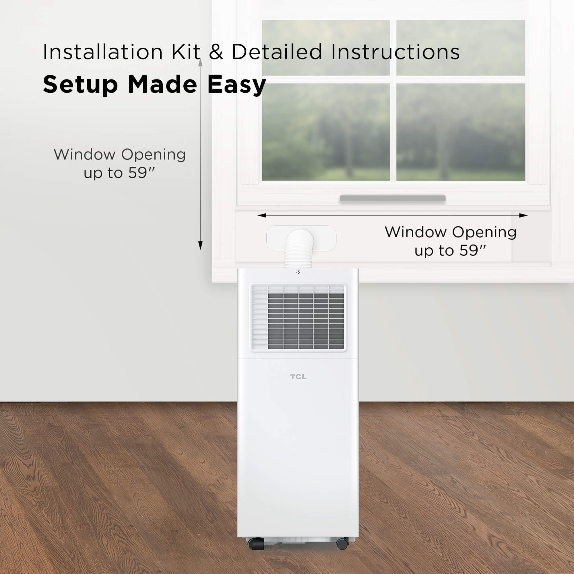 NEW ULTRA-COMPACT DESIGN. SAME POWERFUL PERFORMANCE.: Powerfully cools up to 150 sq. ft. with an ultra-compact footprint that is only 10.8inx10.6in, perfect for super tight spaces in any room like dorms, bedrooms, offices, and more. 3-IN-1 COMFORT: Chill out, cool down, or dry off with TCL’s 3-in-1 AC, Fan, and Dehumidifier to suit a wide array of needs. APP, REMOTE OR VOICE CONTROL: Cool your home with the friendly Mobile app, simple voice commands using Alexa or Google Assistant-enabled devices, or included remote. ENERGY EFFICIENT: Save energy like a pro with Sleep and Eco modes to help you save money throughout the year. CONVENIENT CONTROL. EASY SETUP.: The LED display makes controlling your portable air conditioner simple, while the included remote lets you effortlessly control the unit without ever leaving the couch. To set up, roll your AC to a window, attach the hose and window kit, and plug it in. It’s just that easy. RESTARTS AUTOMATICALLY: Designed to restart automatically after a power outage with Auto Restart.