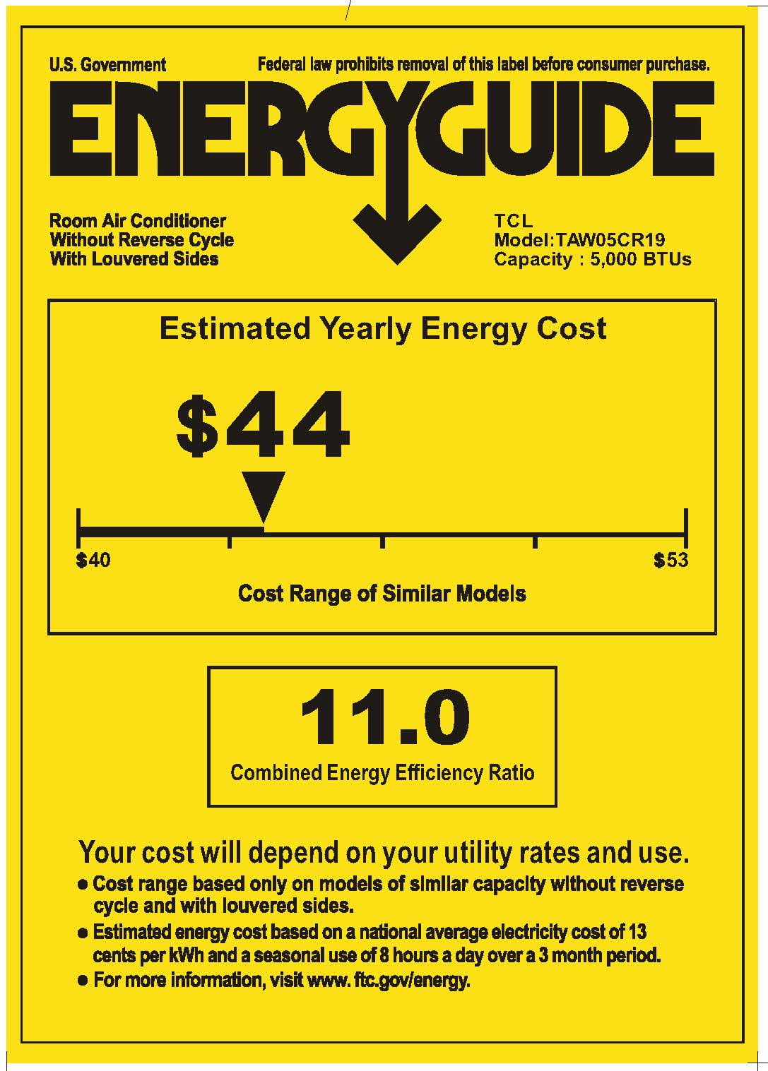 TCL 5,000 BTU Window Air Conditioner with Remote, White: 24-hour timer: white window air conditioner is equipped with a 24-hour timer for on/off functionality Eco Mode: conserves energy by turning off the compressor when the room reaches the desired temperature, the fan motor will run for 10 minutes, stop for 20 seconds, then run again. The compressor will turn back on when the room temperature rises above the set temperature Display on/off: the TCL window air conditioner’s control display can be turned off so it’s not illuminated during sleeping hours Auto-restart: when the power is off or accidentally cut off, it will automatically restart with the previous function settings when the power resumes Multi-directional louvers: 8-way air outlets ensure consistent airflow to all parts of your living space Filter-cleaning reminder: a filter-cleaning light will display after 500 total hours of runtime to remind you to clean the filter to ensure optimal operating efficiency Auto Mode: based on the room temperature and unit setting, this white window air conditioner will switch accordingly to 1 of the 3 mode settings: Cool, Dehumidify and Fan Sleep Mode: automatically adjusts the temperature and fan speed to make the room more comfortable during the night. The set temperature will automatically rise by 1.8degreeF (1degreeC) every 30 to 60 minutes TCL window air conditioner includes a remote and offers 5,000 BTU of cooling capacity; will cool up to 150 sq ft 1-year parts and labor warranty