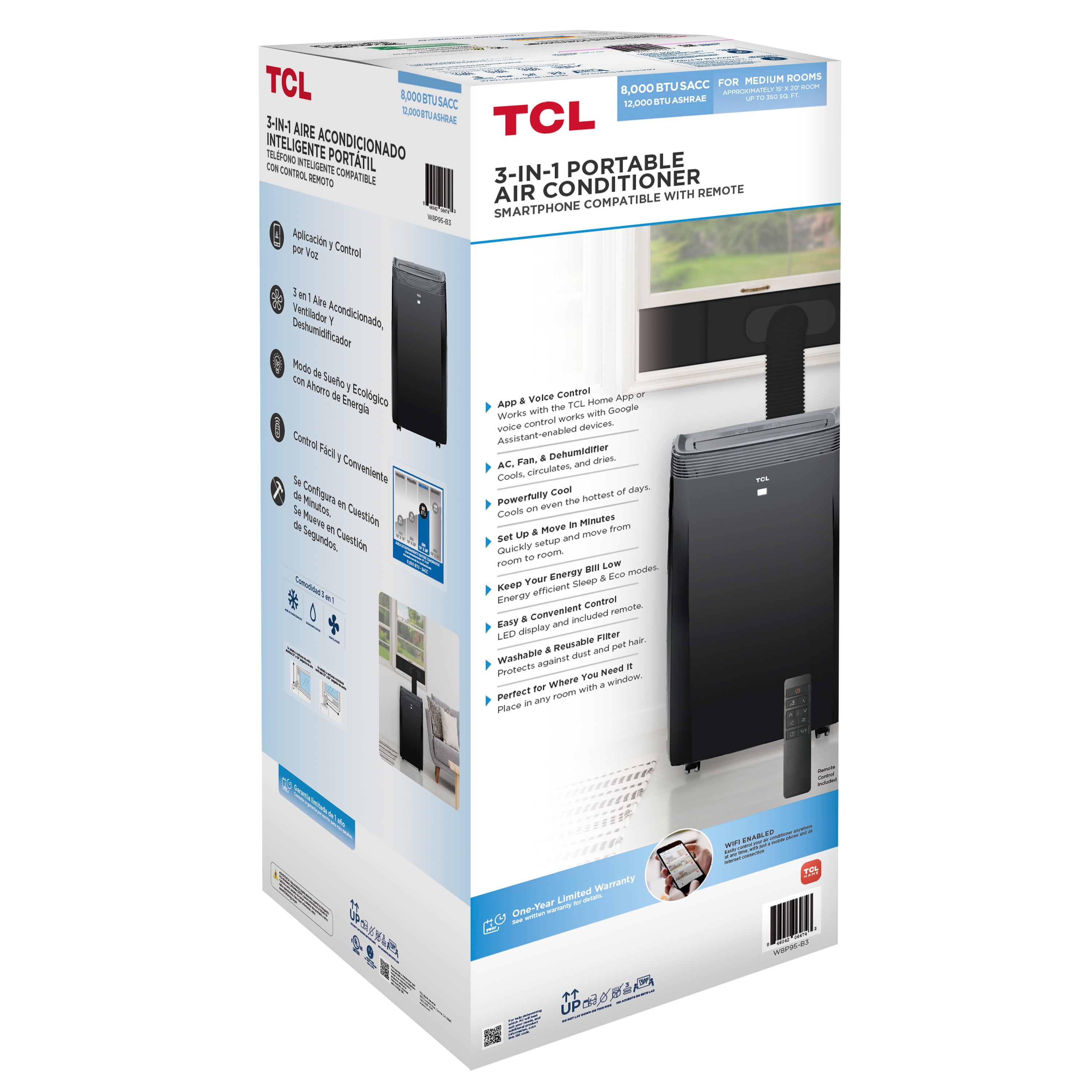 3-in-1 AC, Fan, and Dehumidifier: Choose the perfect mode to keep your room cool, clean, and dry without ever needing to empty a bucket with our self-evaporating design. Powerful Cooling Capacity: The 8,000 BTU SACC (12,000 BTU ASHRAE) BTU portable air conditioner is powerful enough to cool rooms up to 325 sq. ft. and features multiple fan speeds that allow you to choose your level of comfort. App & Voice Control: With advanced smart features, cool your home with simple voice commands using Alexa and Google Assistant or control your unit from anywhere with the smart and intuitive TCL Home App (separate unit remote included). Set Up in Minutes. Move Around in Seconds: Set up your portable AC unit in minutes using the included hose and window kit. TCL portable ACs feature handles and wheels for quick moves from room to room. (Size: 14.06 x 16.5 x 27.09 in) Keep Your Energy Bill Low: The 24-Hour Timer and Sleep Mode help to keep your energy bill low while you stay comfortable. Prolong The Life Of Your Device With The Washable & Reusable Filter: The washable and reusable filter helps protect the life of your AC by preventing large airborne particles like dust and pet hair from ruining the machine. Restarts Automatically: Designed to restart automatically after a power outage with Auto Restart. Window Compatibility: Vertical sliding and horizontal sliding windows (no casement windows) with up to a 59-inch opening clearance. Versatile Design: Use your quiet portable air conditioner in the bedroom, living room, utility room, dining room, basement, nursery, dorm, office, or wherever needed. Voice Control Set up your portable AC unit in minutes using the included hose