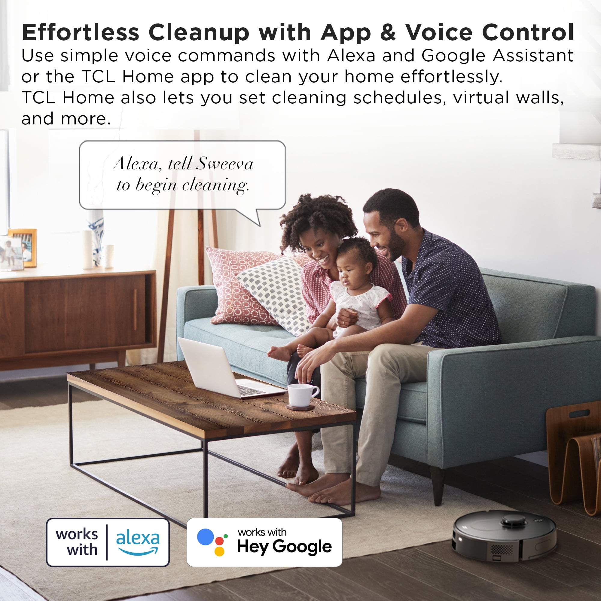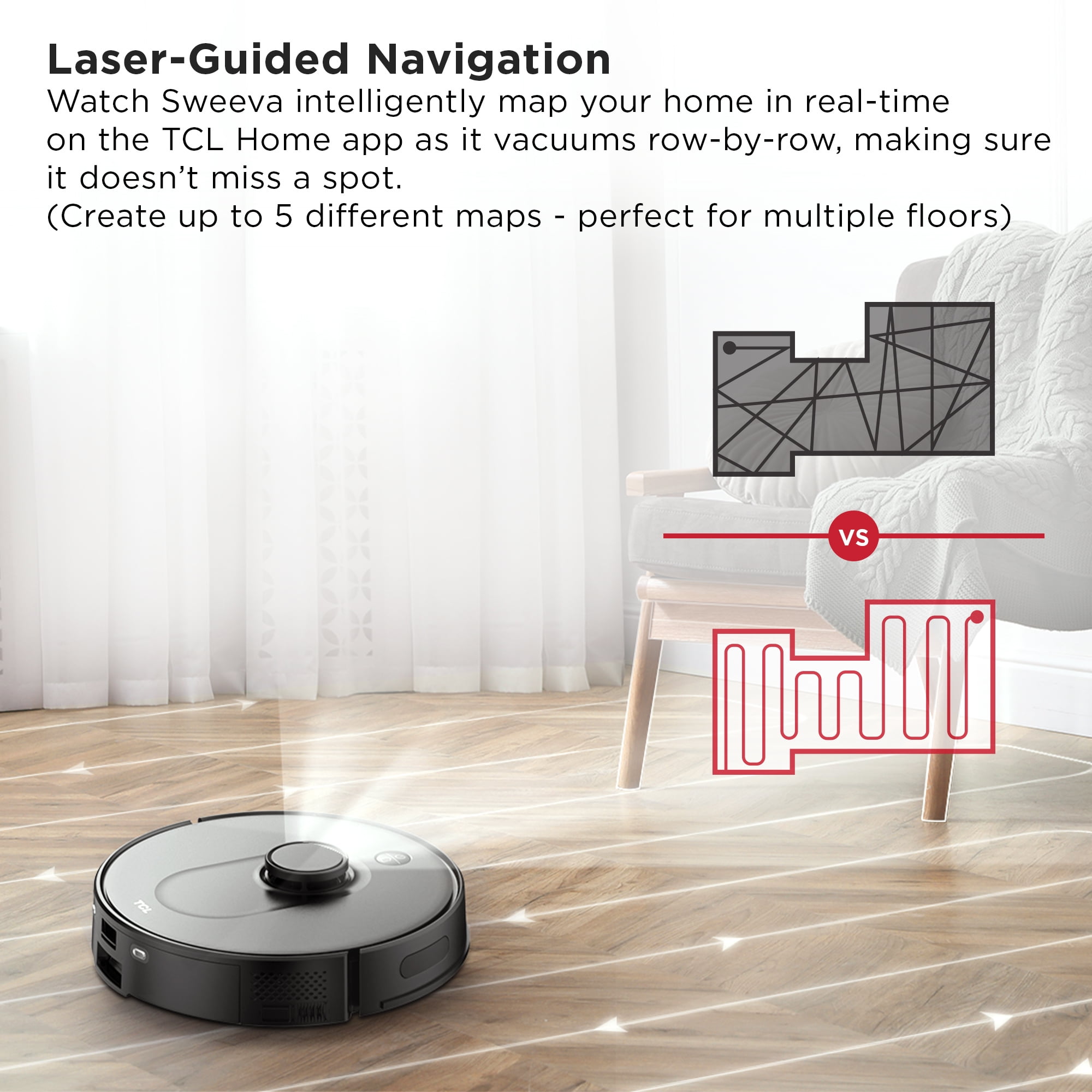 Advanced Navigation for Precise Cleaning: Sophisticated laser-guided navigation maps your entire home and vacuums in tight, clean rows, making sure it never misses a spot. (Up to 5 different maps, perfect for multiple floors) A New Line of Defense: Equipped with state-of-the-art UVC technology, Sweeva eliminates bacteria and viruses found on your floor. Effortless Cleanup with App & Voice Control: Use simple voice commands with Alexa and Google Assistant or the TCL Home app to clean your home effortlessly. RV6014B, New