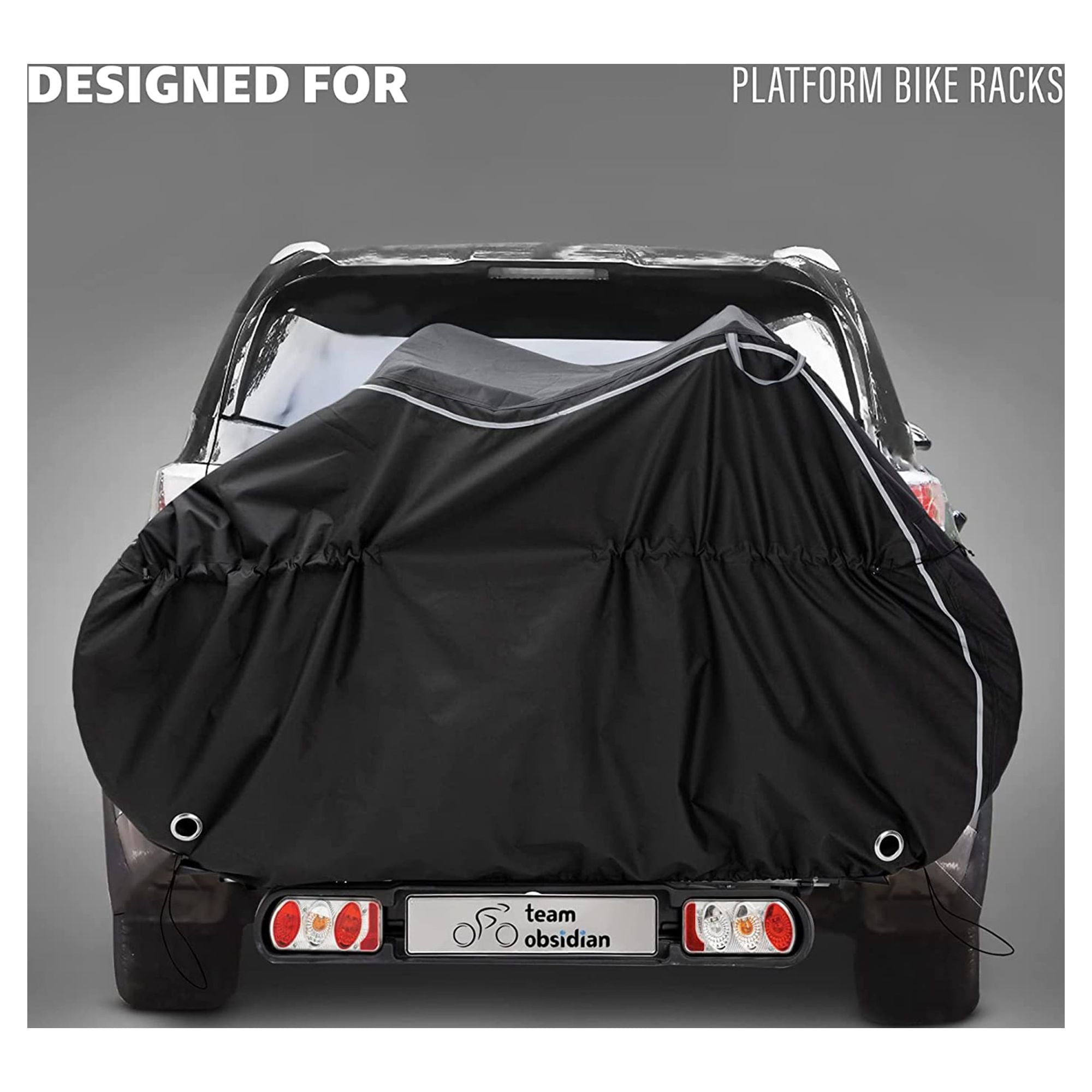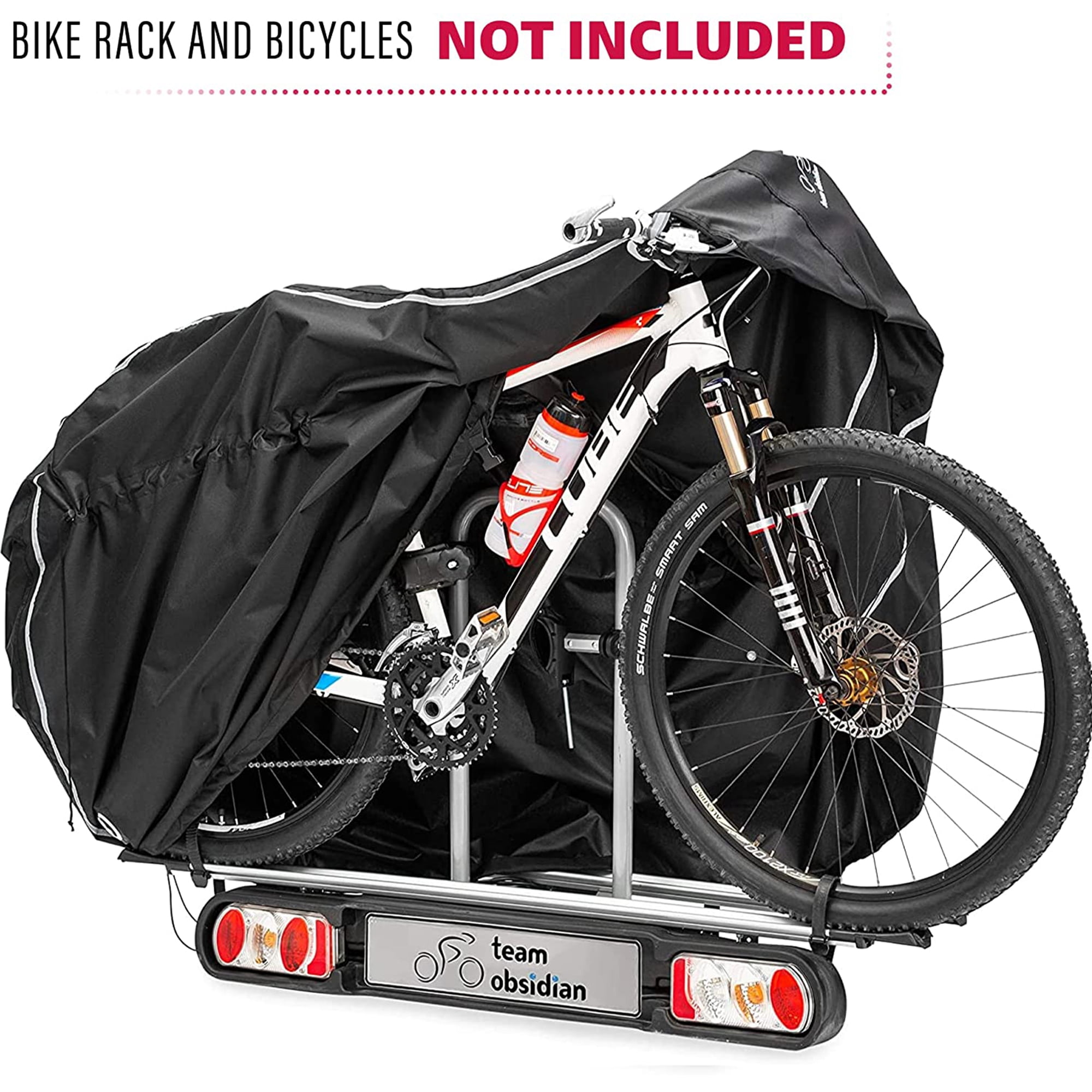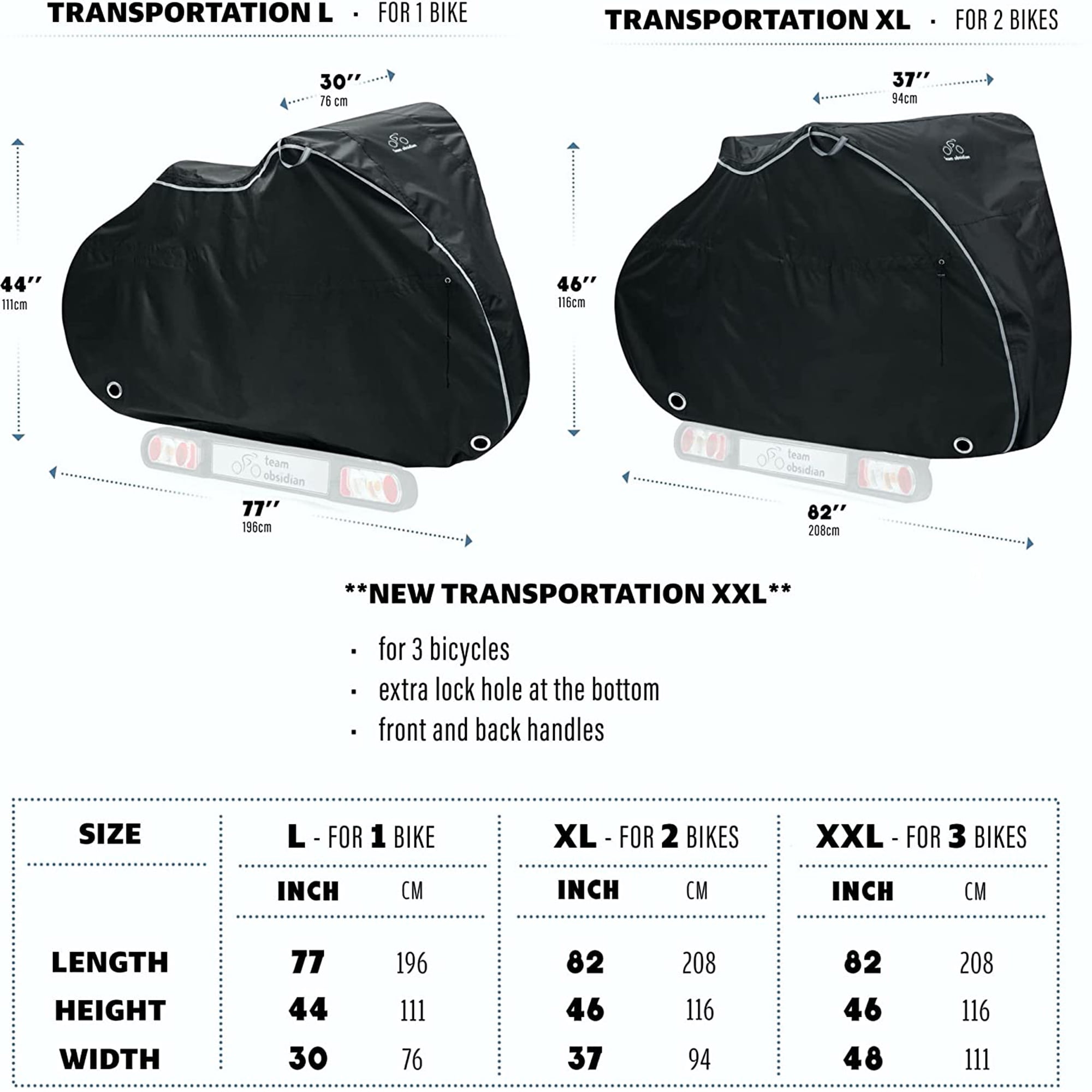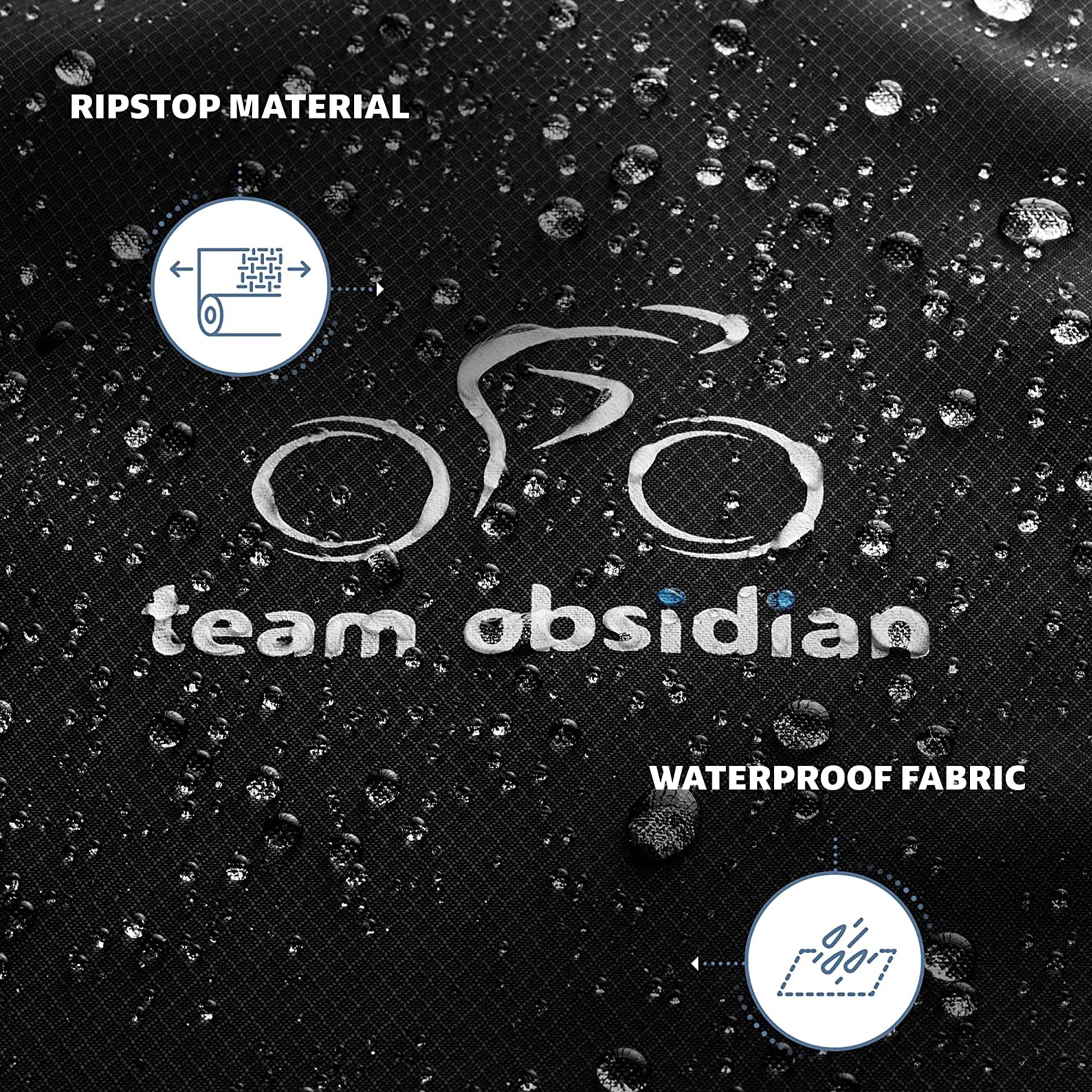 Designed to meet your bike storage needs. Our outdoor bike cover is effective in all weather conditions! This rainproof, anti UV, with PU coating, durable cycling tarp will cover the whole bike body including the wheels to the ground, efficiently protecting your bike against the elements: sun, rain, wind, snow, ice, dust, dirt, hail! It’s suitable for platform-style hitch bike racks on cars and RVs. We’ve designed our waterproof bike cover to last. The strong diamond ripstop material will offer constant protection for your bikes on all your outdoor journeys. With its fitted design, our bike travel case follows the shape of your bicycle so that there won’t be any excess material flapping in the wind. It even comes with a convenient carry bag made of the same material! Keep your ride safe with the Team Obsidian Bike Cover! Designed for your peace of mind, our outdoor bike storage cover can be easily secured on all bikes: mountain, road, hybrid, beach cruiser, electric, city, BMX etc. Just cover the bike from top to bottom, adjust the drawstring cords both at the bottom and in the middle and connect the central buckles for a snug fit. Make sure to knot the extra drawstring at the center. Enjoy extra security with both front and back lock holes – our bike cover is also very noticeable thanks to the reflective straps on both sides. You can easily remove our bike covers by using the top handles. The black and silver style fits both men’s and women’s bikes. Choose the right size and style for you: Stationary L/XL/XXL or Transportation L/XL/XXL. Imagine buying a bike cover and not having to worry about it again. We are here to make that come true and we believe this product will meet all your expectations. In case you have any problems with your cycle protector we’ll have it fixed or replaced at no cost. Don’t settle for anything less than the best in bicycle storage. Add the Team Obsidian Bike Cover to your cart today!