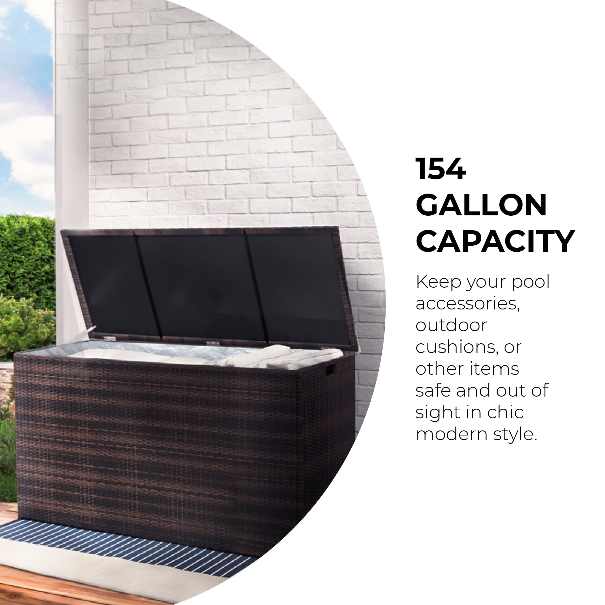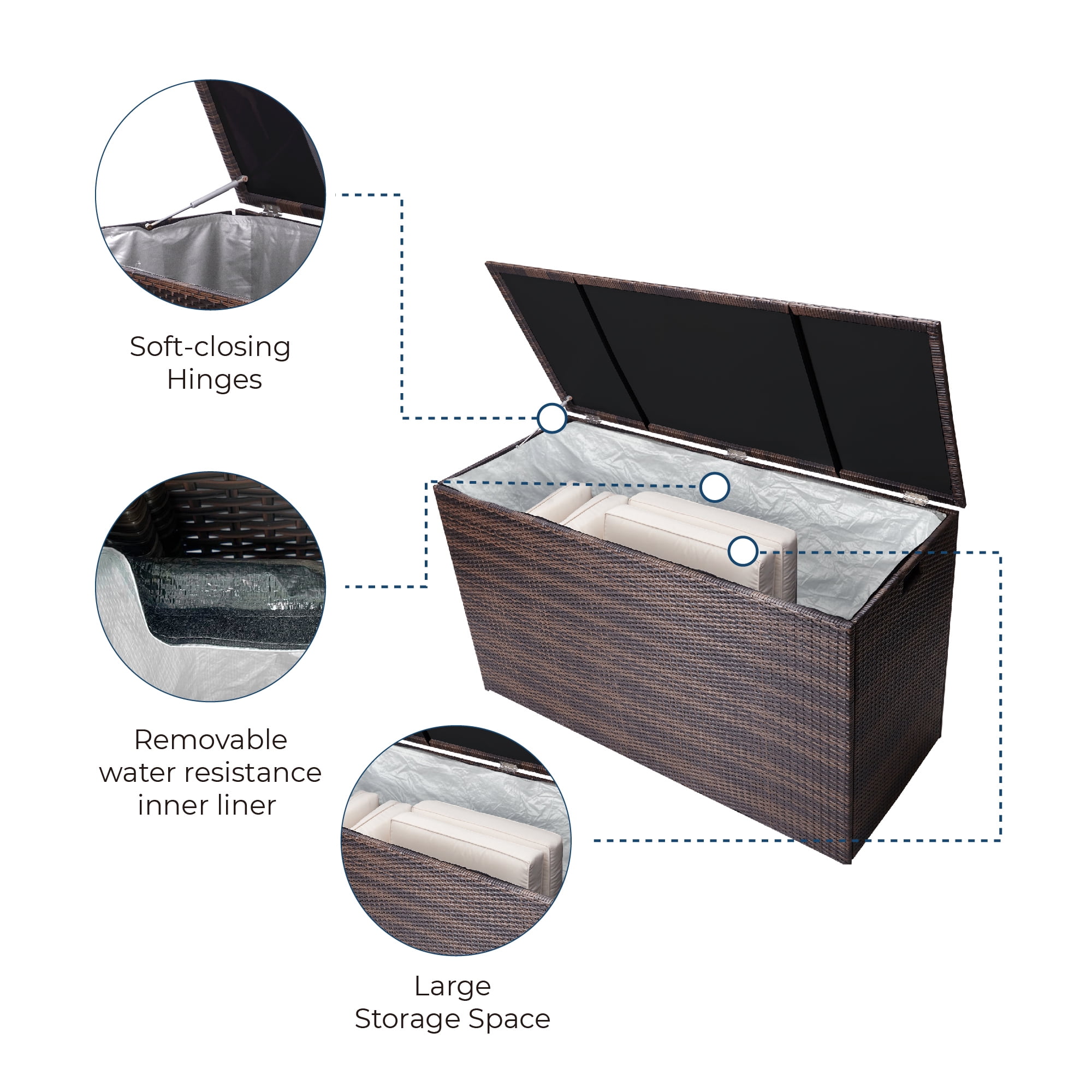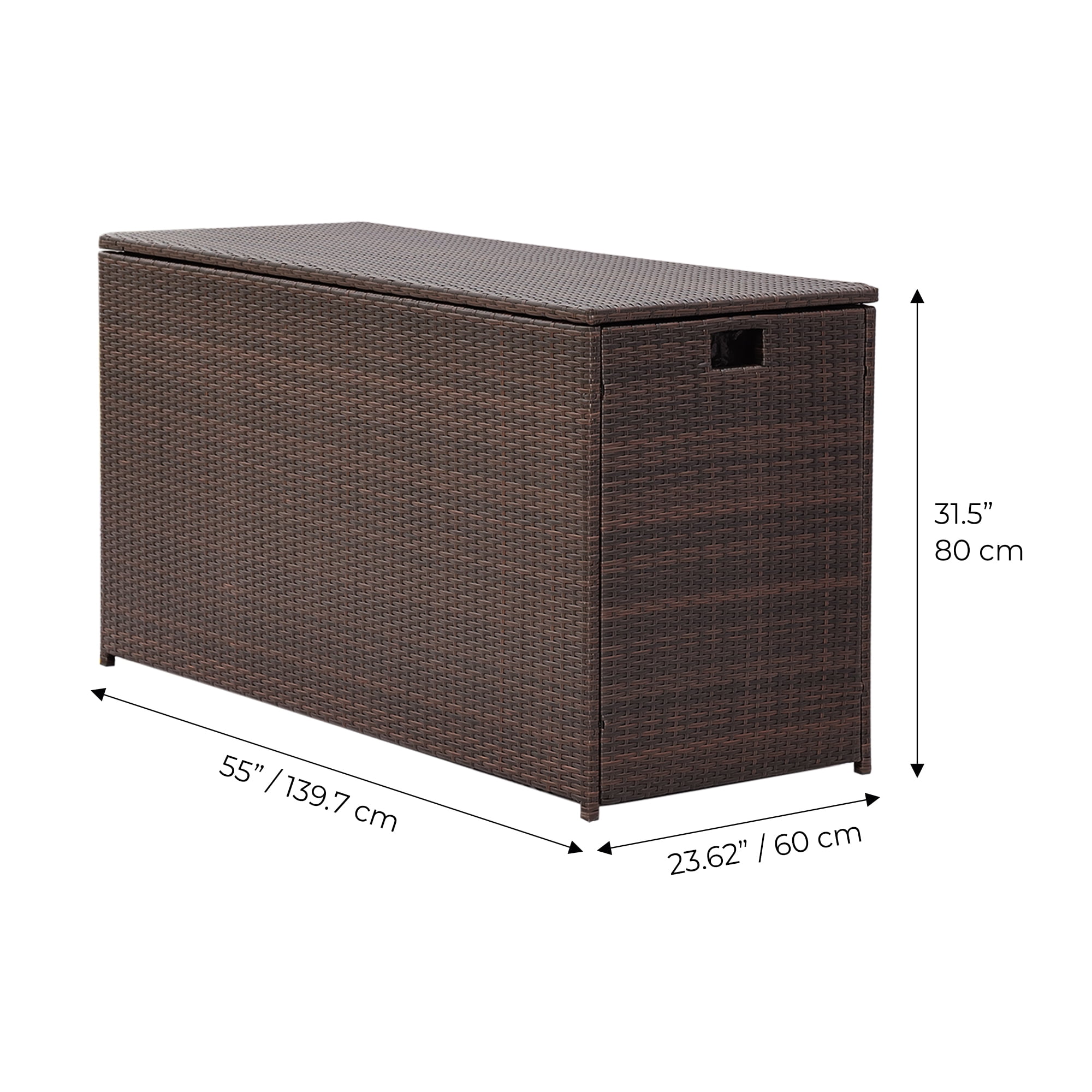 Keep patios, decks, and pool areas neat and tidy with this 154-gallon chest Made of fade-resistant PE rattan with a durable steel frame Soft-close hinges, removable zipped interior waterproof liner, and side handles for easy transport Store patio cushions, pool toys, bird seed and other outdoor living staples year-round Dimensions: 55.0″ L x 23.62″ W x 31.5″ H