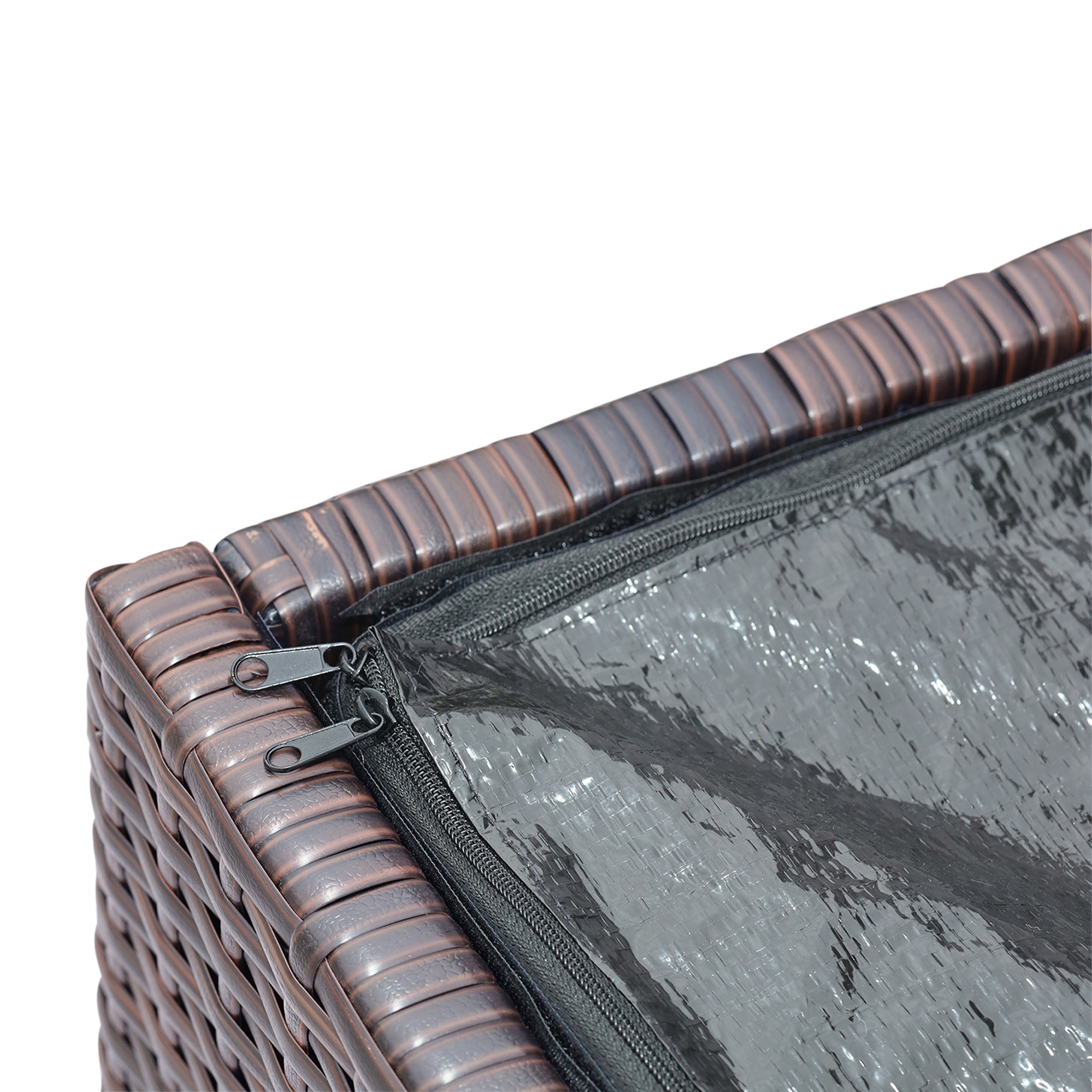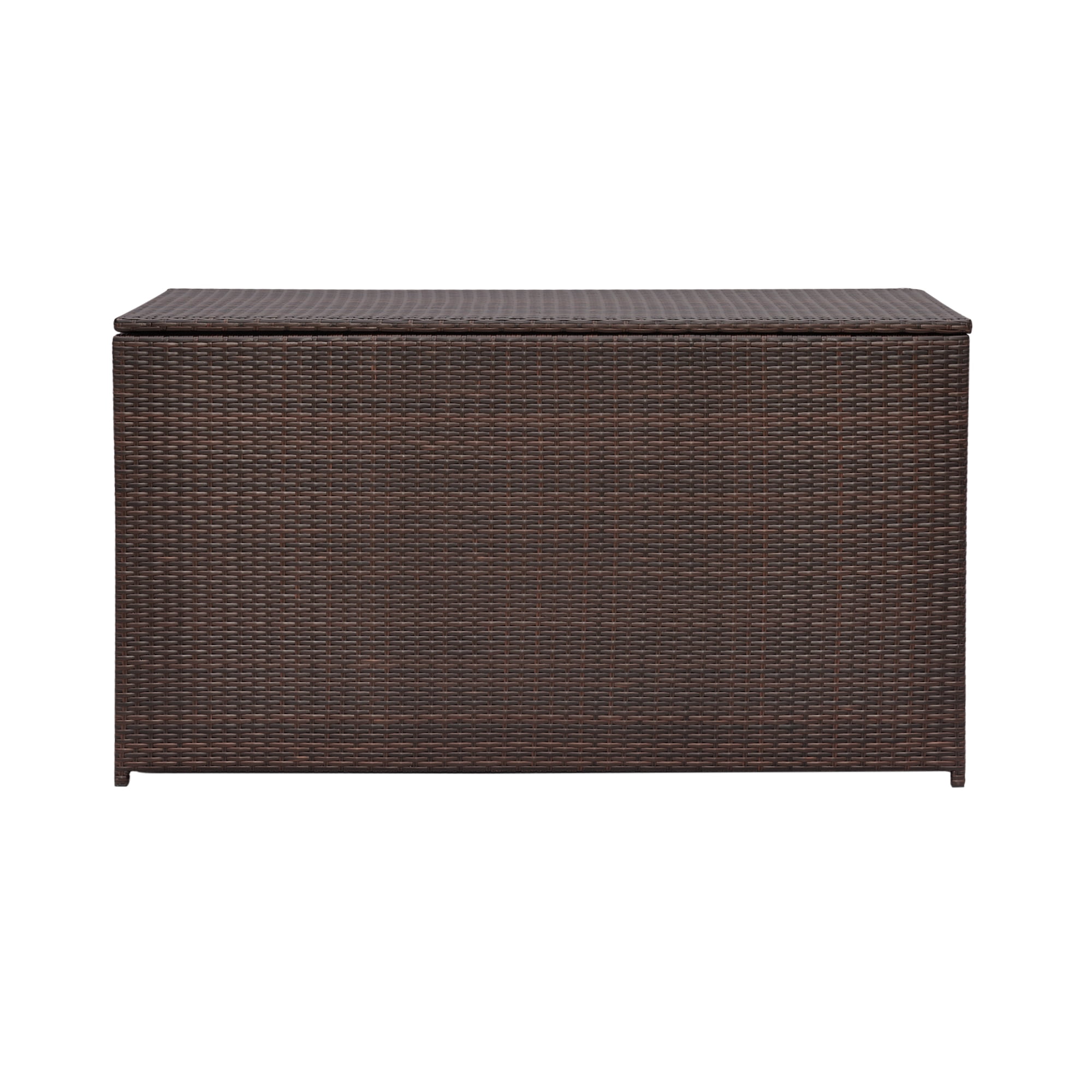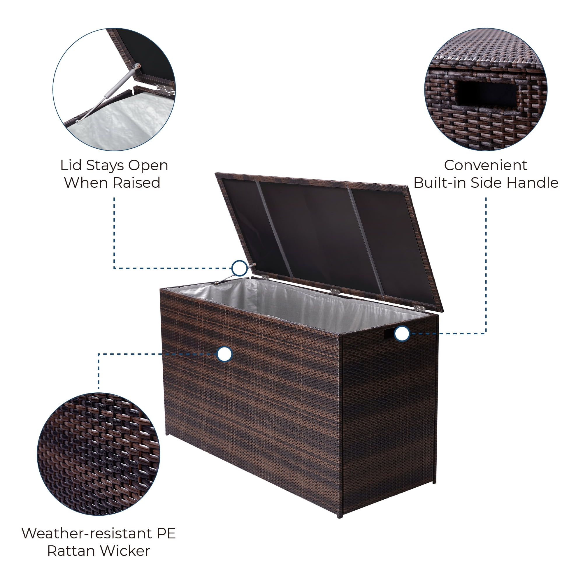 Keep patios, decks, and pool areas neat and tidy with this 154-gallon chest Made of fade-resistant PE rattan with a durable steel frame Soft-close hinges, removable zipped interior waterproof liner, and side handles for easy transport Store patio cushions, pool toys, bird seed and other outdoor living staples year-round Dimensions: 55.0″ L x 23.62″ W x 31.5″ H