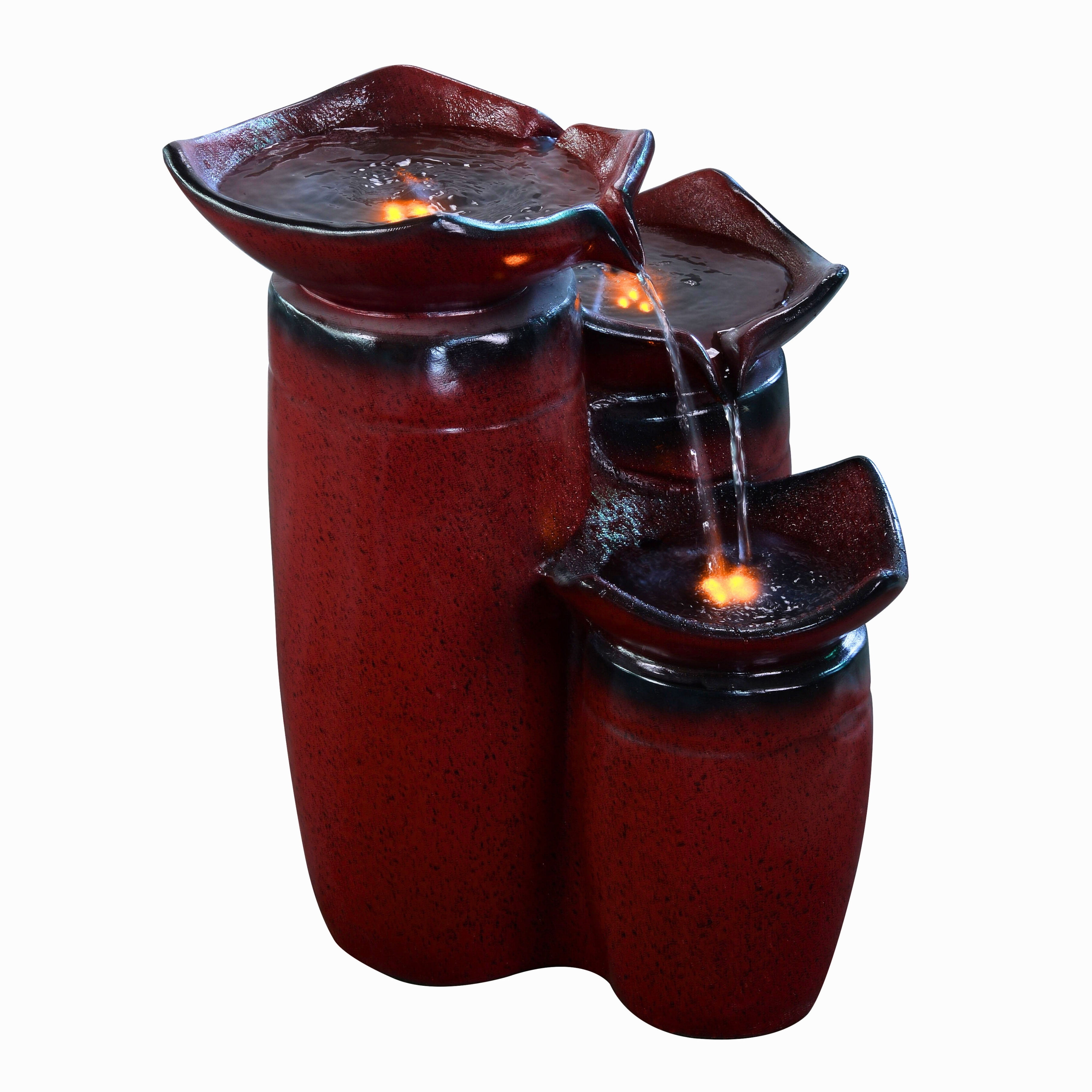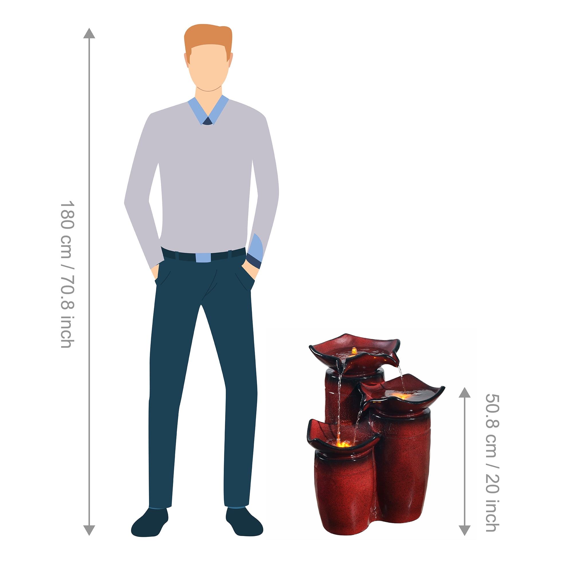 Turn your home’s outdoor area into a relaxing oasis with the Teamson Home Outdoor 3-Tier Glazed Pot Floor Fountain with LED Lights. This outdoor waterfall fountain features a multi-tiered red glazed pot design with a stunning gradient finish for a tranquil and soothing addition to your porch, backyard, or lawn. Constructed from durable polyresin and fiberglass with a natural look and classic textures, the fountain is weatherproof, rust-resistant, and resilient. The built-in LED lights placed in each tier keep this fountain illuminated for a magical display. This outdoor fountain will bring a touch of natural beauty to your space. Relax to the sounds of the peaceful water 300 L/H flow as it trickles down from the top tier to the additional tiers below for a peaceful escape. For convenient setup, the fountain includes a pump and all necessary parts for installation without the need to purchase additional hardware. This outdoor fountain measures 16.14″ x 15.94″ x 20″ to easily fit in almost any outdoor space.