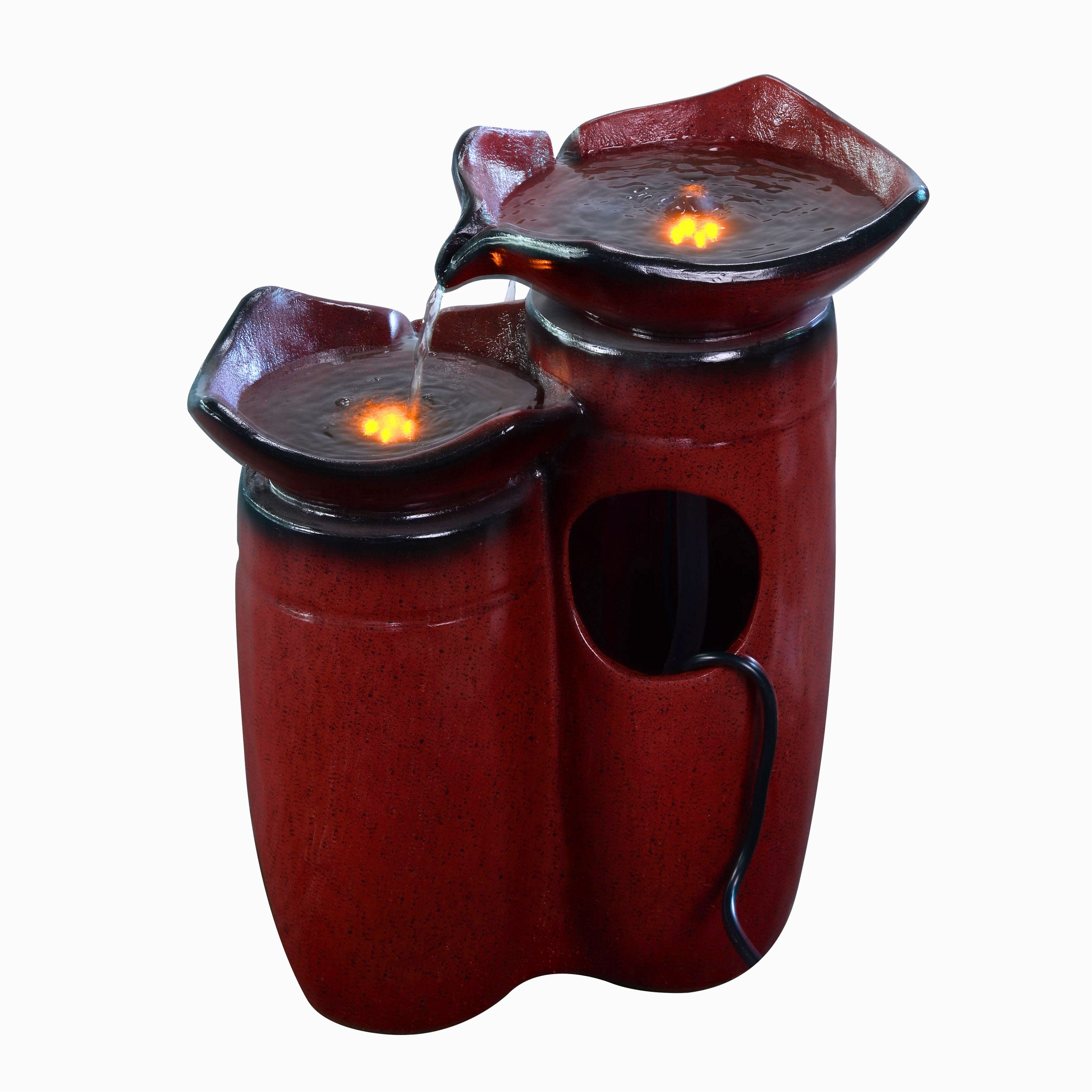 This stunning red fountain adds color to your garden while attracting pollinators LED light in the centre of each tier keeps the fountain glowing Constructed from polyresin with a natural look and realistic textures, the fountain is weatherproof, rust-resistant, and resilient Includes an adjustable water pump with a 72.04″ cord, and suction cups for secure, submersed placement Dimensions: 16.14″ L x 15.94″ W x 20.0″ H; Water Capacity: 2.2 gallons