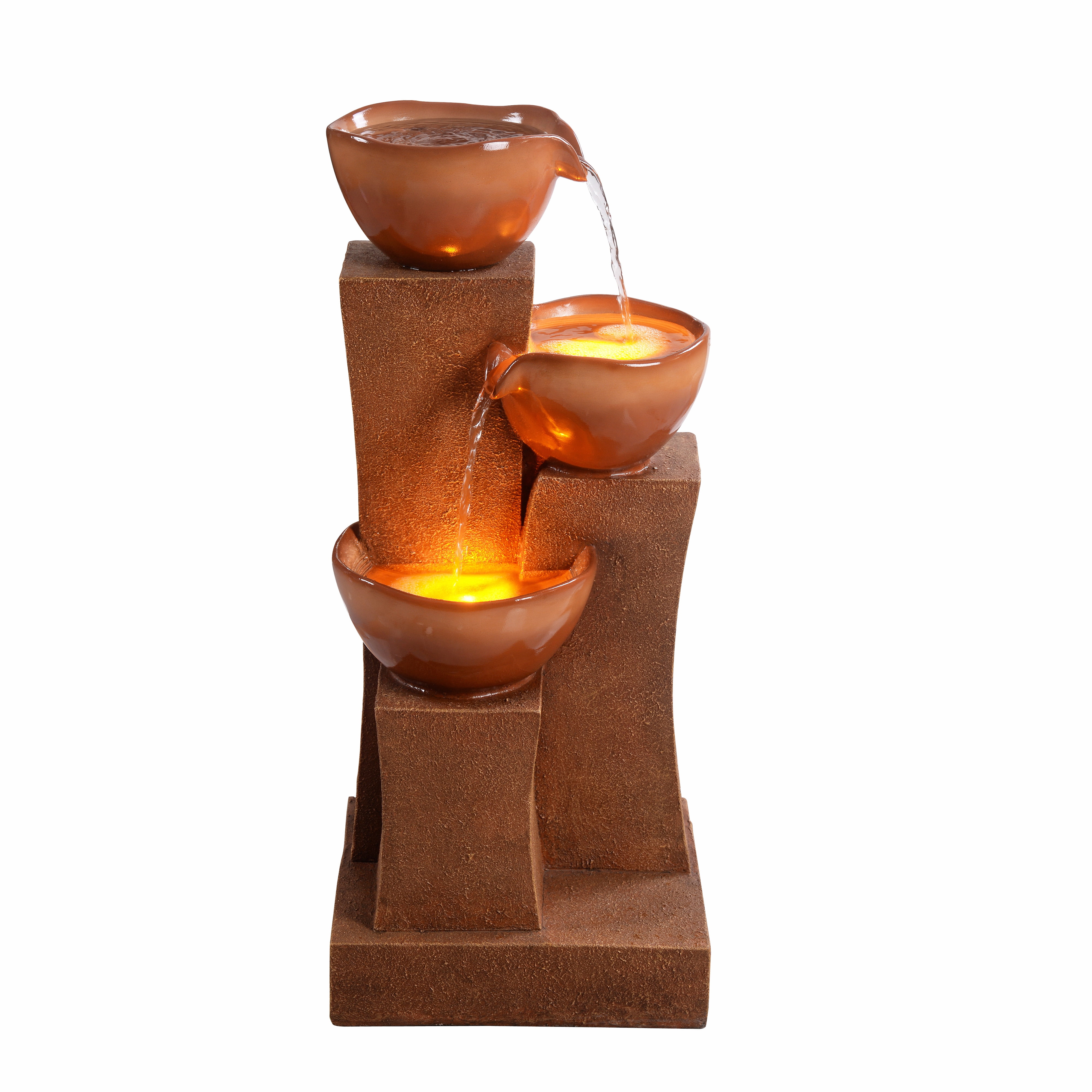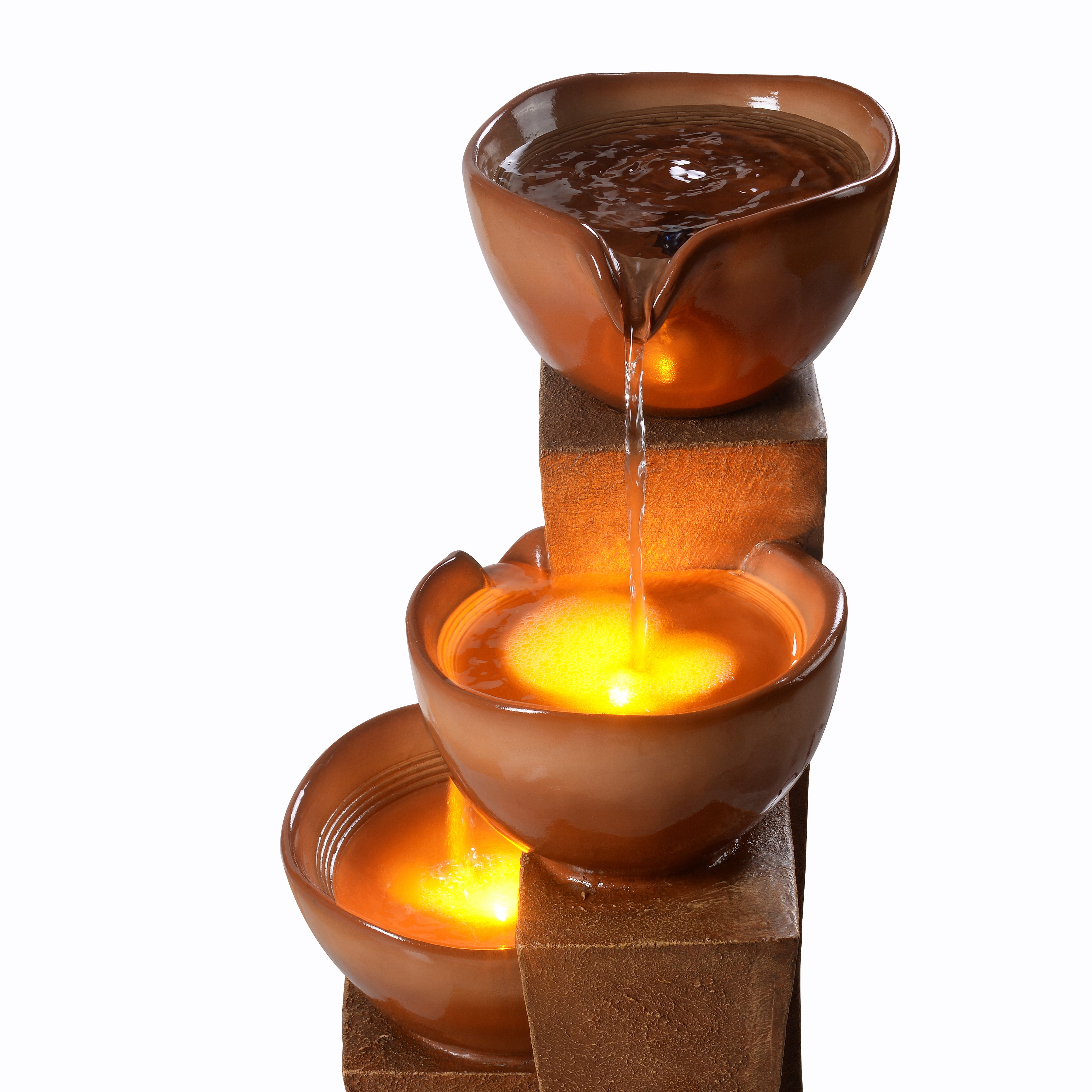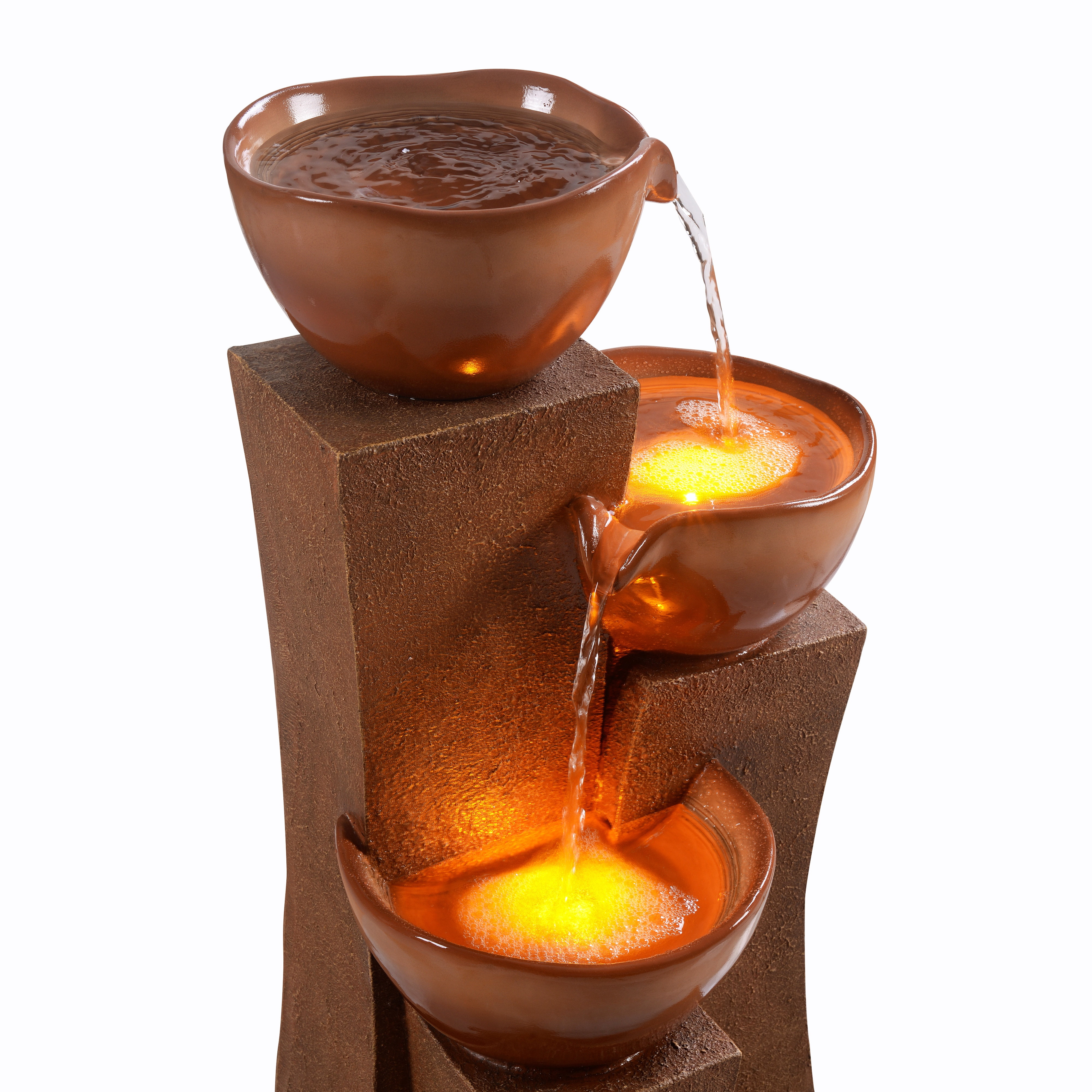 Decorative, multi-textured 3-tier water fountain for outdoors or indoors Shiny brown ombre bowls staggered for soothing water sounds, illuminated from the below by LED lights Textured, staggered pedestals form a contemporary frame Includes an adjustable water pump with a 72.04″ cord and suction cups for secure, submersed placement Dimensions: 12.2″ L x 11.81″ W x 28.54″ H; Water Capacity: 2.1 gallons 0
