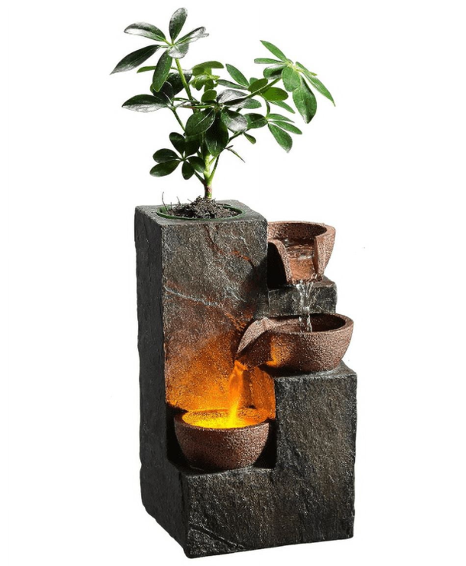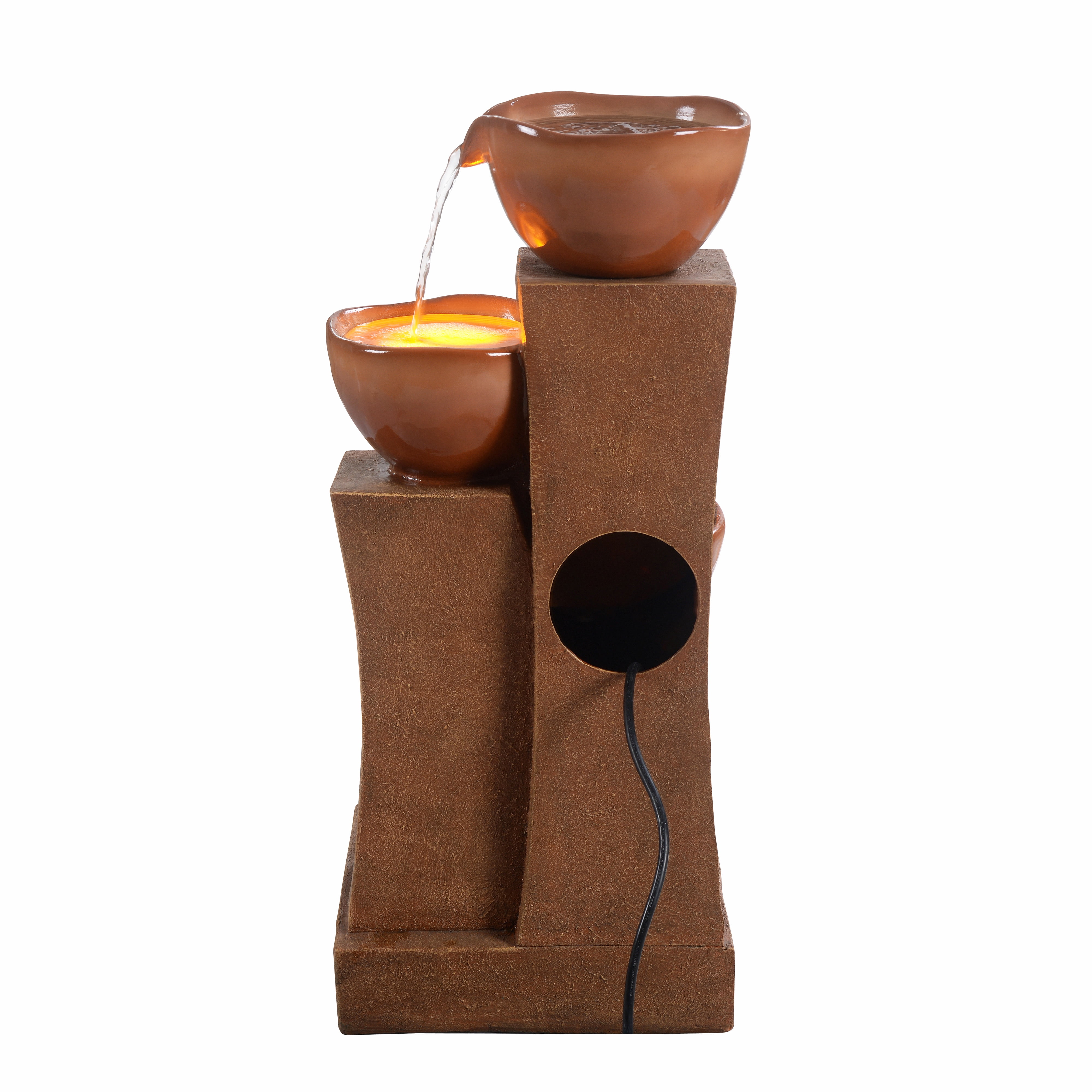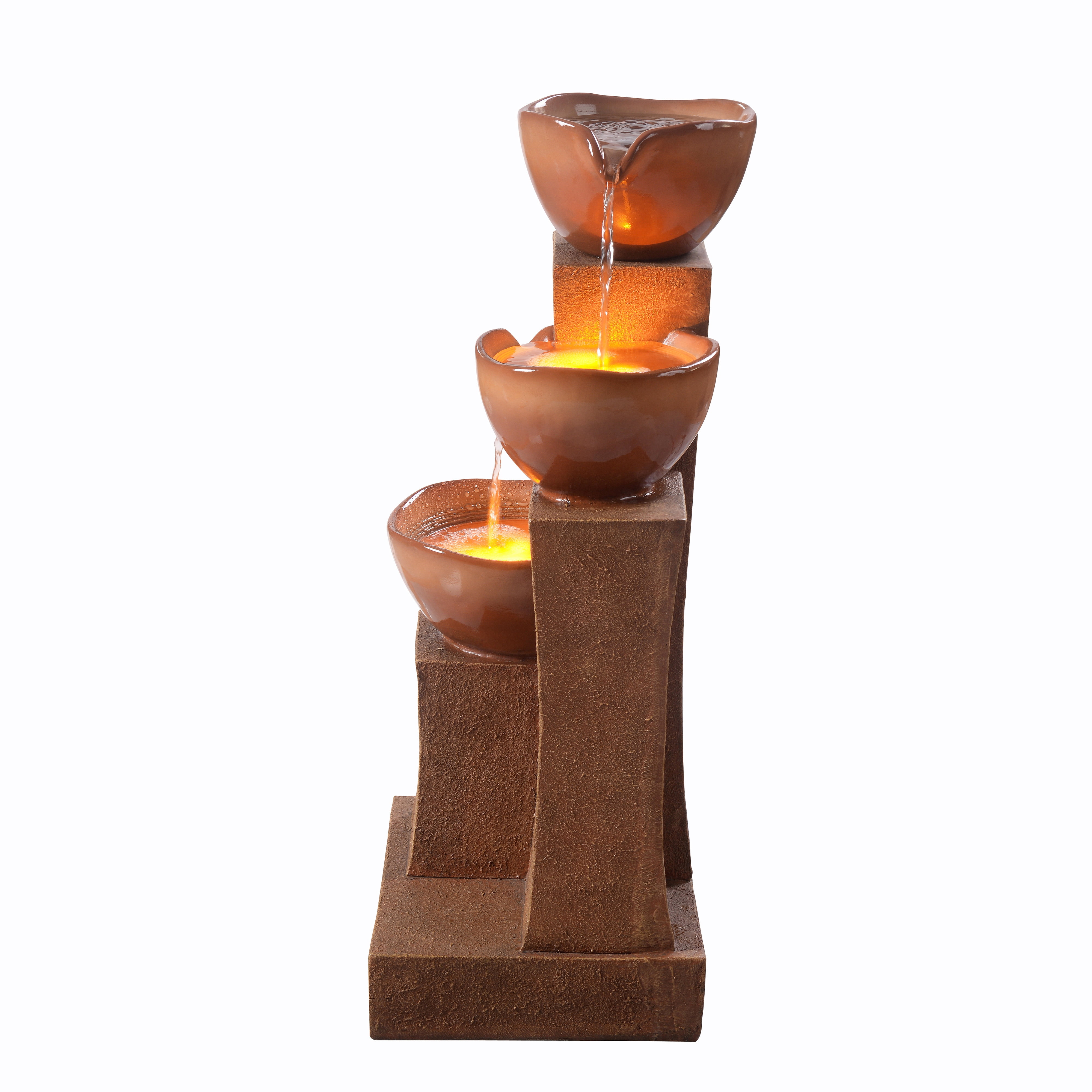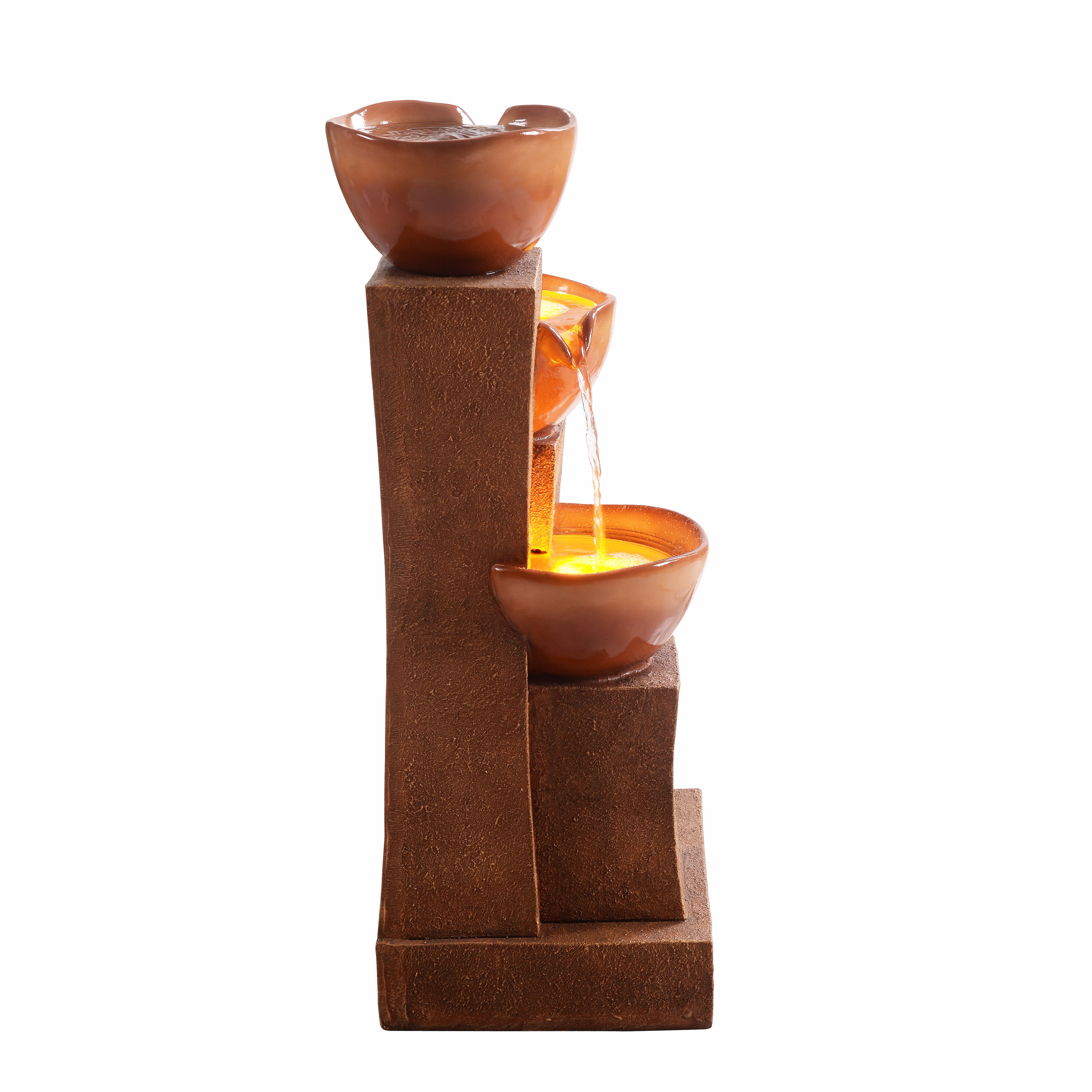 Decorative, multi-textured 3-tier water fountain for outdoors or indoors Shiny brown ombre bowls staggered for soothing water sounds, illuminated from the below by LED lights Textured, staggered pedestals form a contemporary frame Includes an adjustable water pump with a 72.04″ cord and suction cups for secure, submersed placement Dimensions: 12.2″ L x 11.81″ W x 28.54″ H; Water Capacity: 2.1 gallons 0