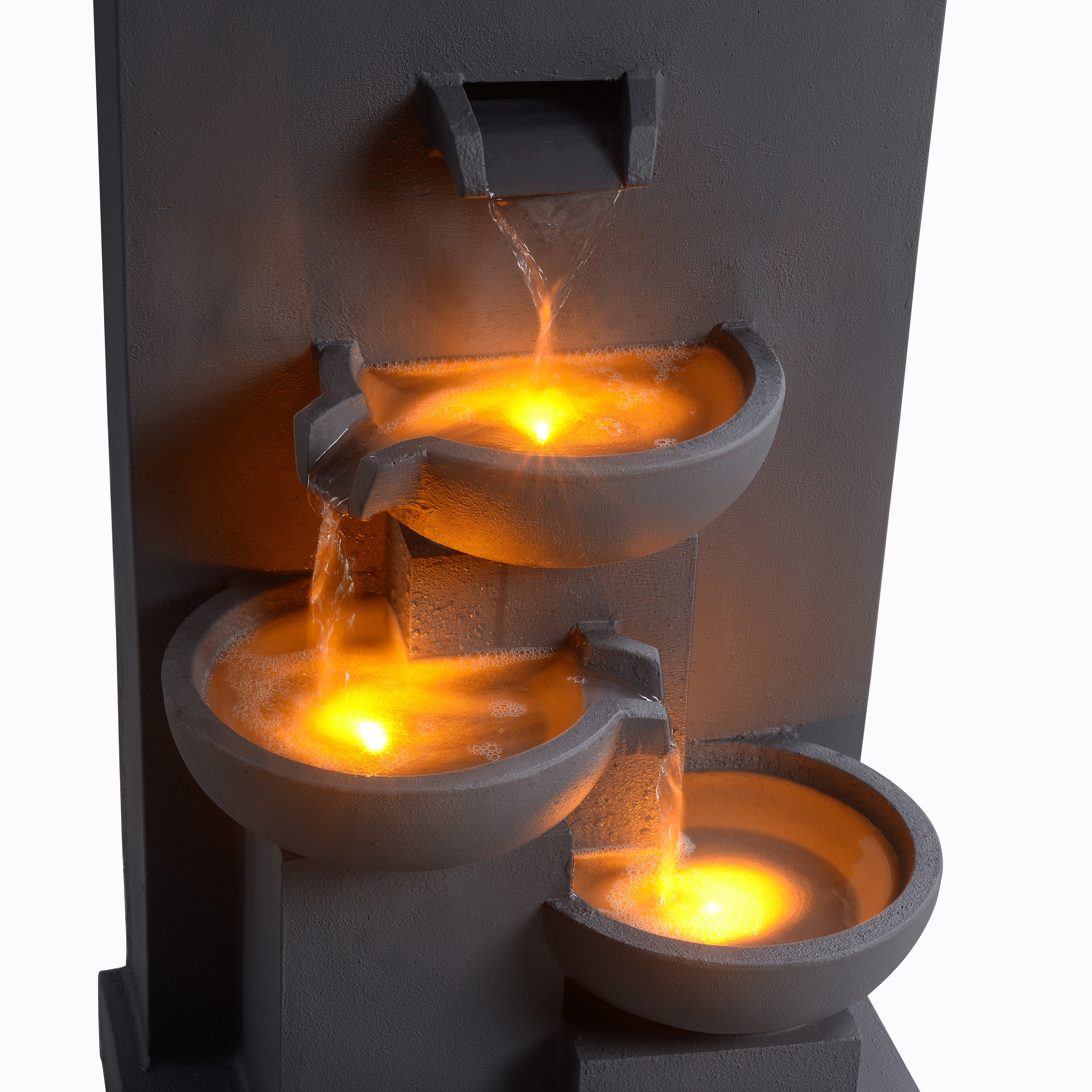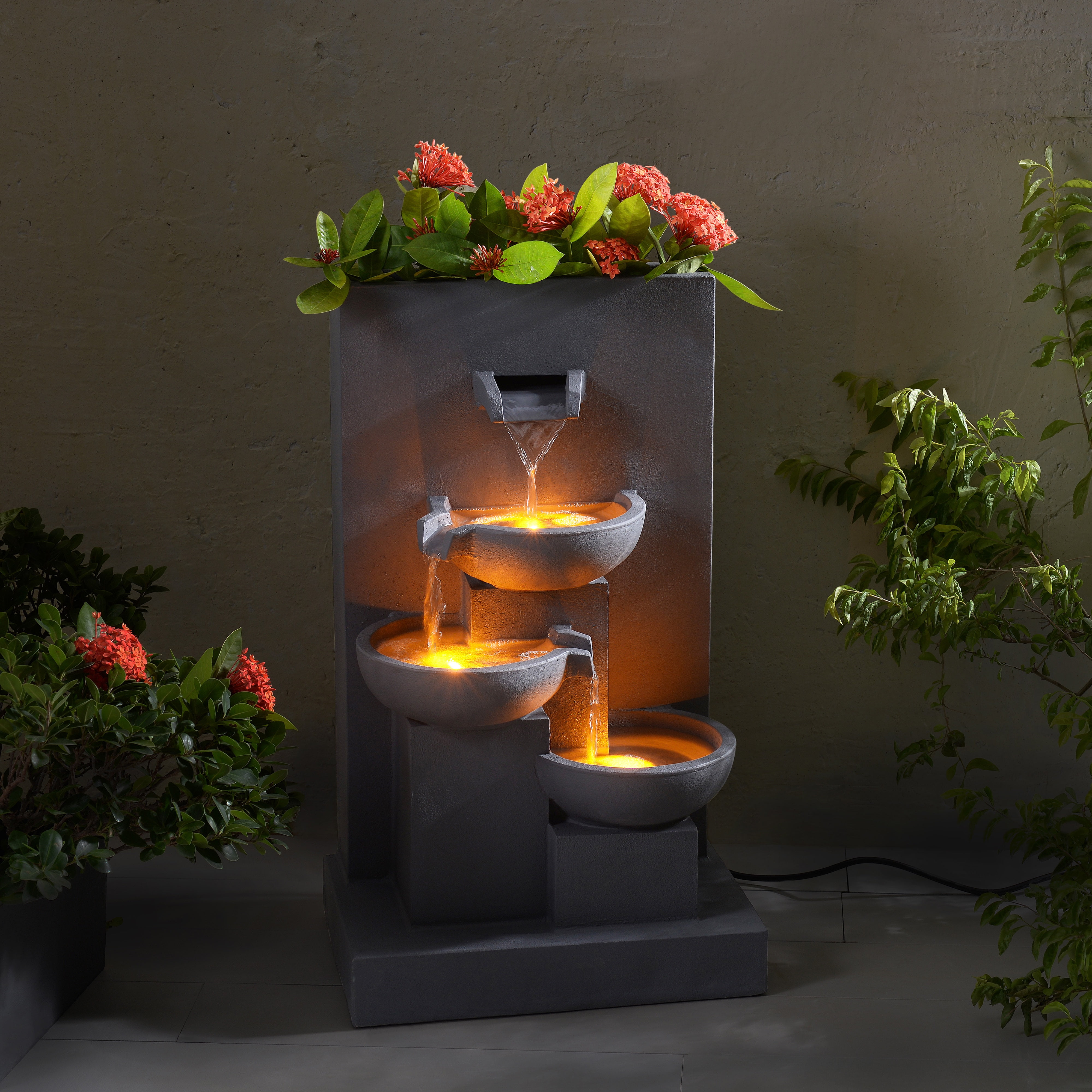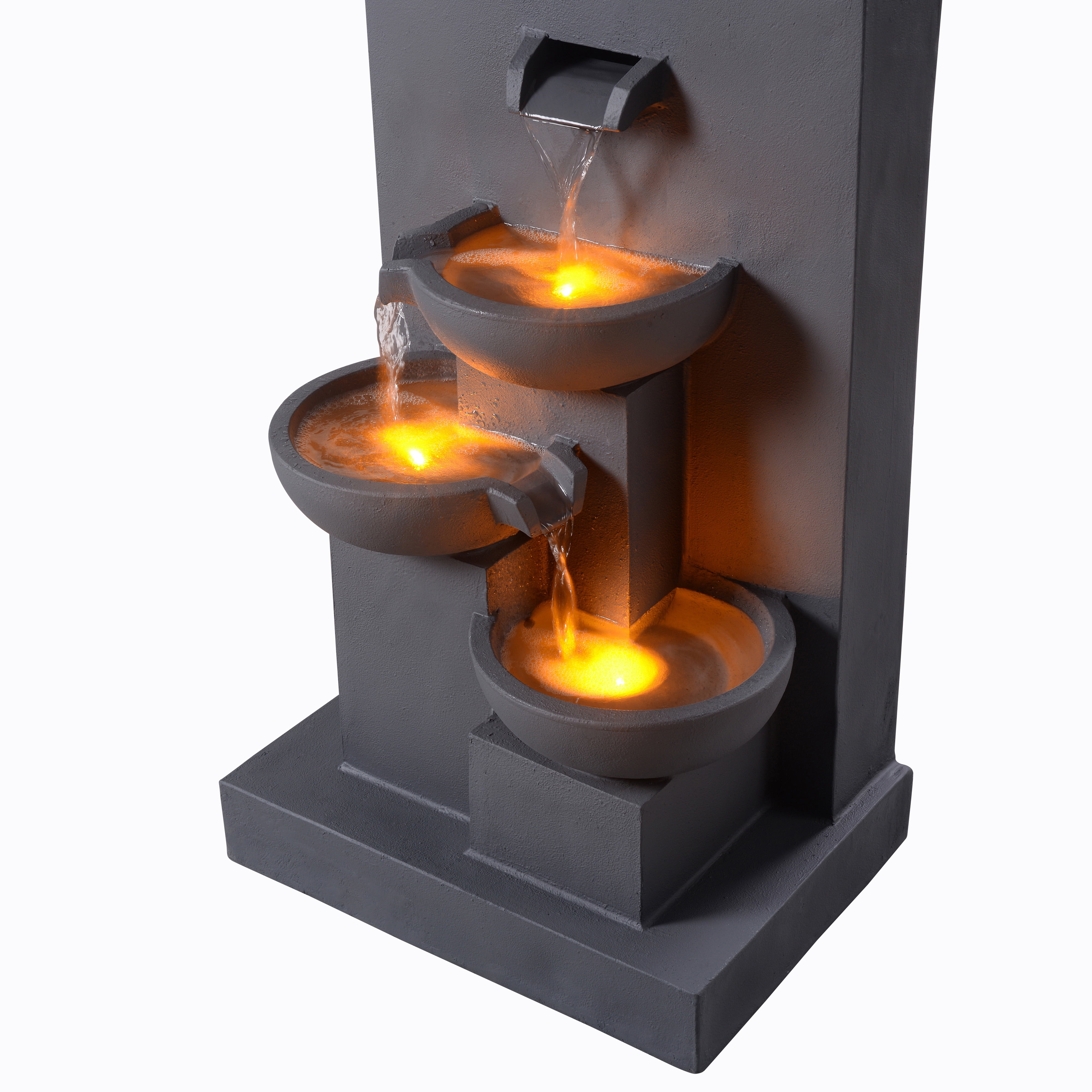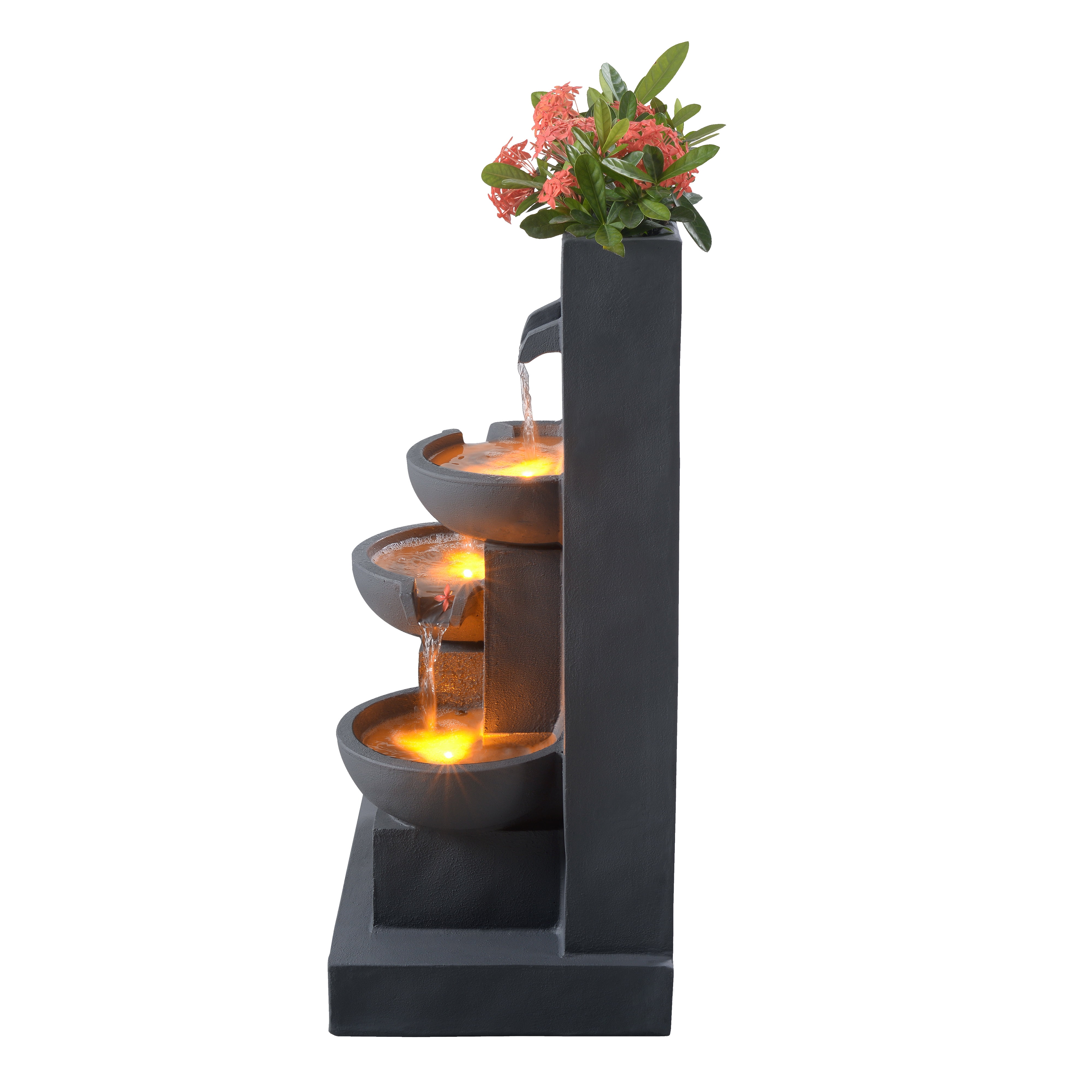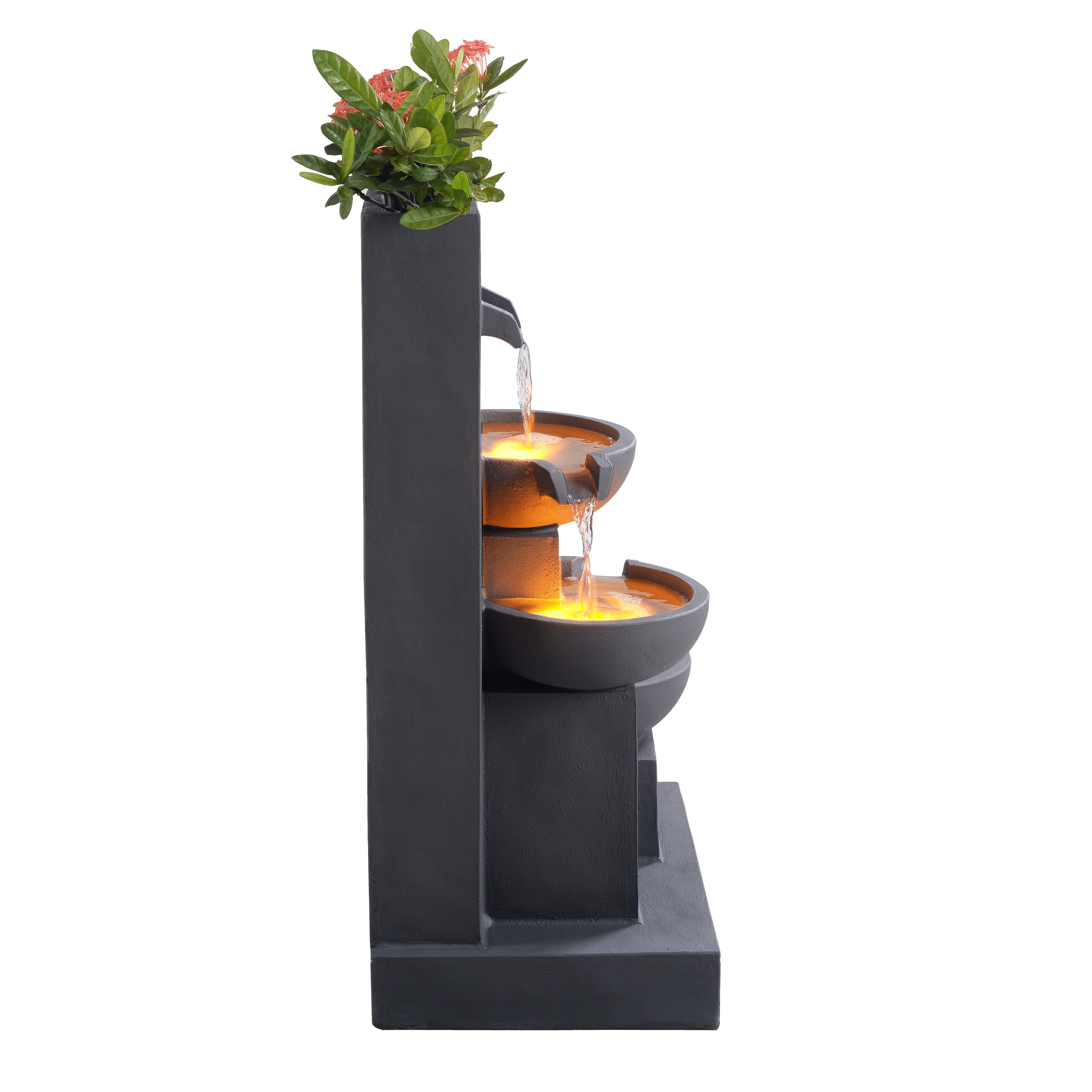 Add the gentle sound of trickling water to the ambiance of your home or office with the Teamson Home 3-Tier Cascading Outdoor Water Fountain with Planter. This decorative addition features a trio of staggered vessels, each illuminated by LED lights for a unique effect under the water. This 3.5-gallon water feature also includes a planter to add annuals or a houseplant for some color. (Plants not included.) Made of a sturdy combination of polyresin and stone powder in a smooth, gray finish that withstands the elements.