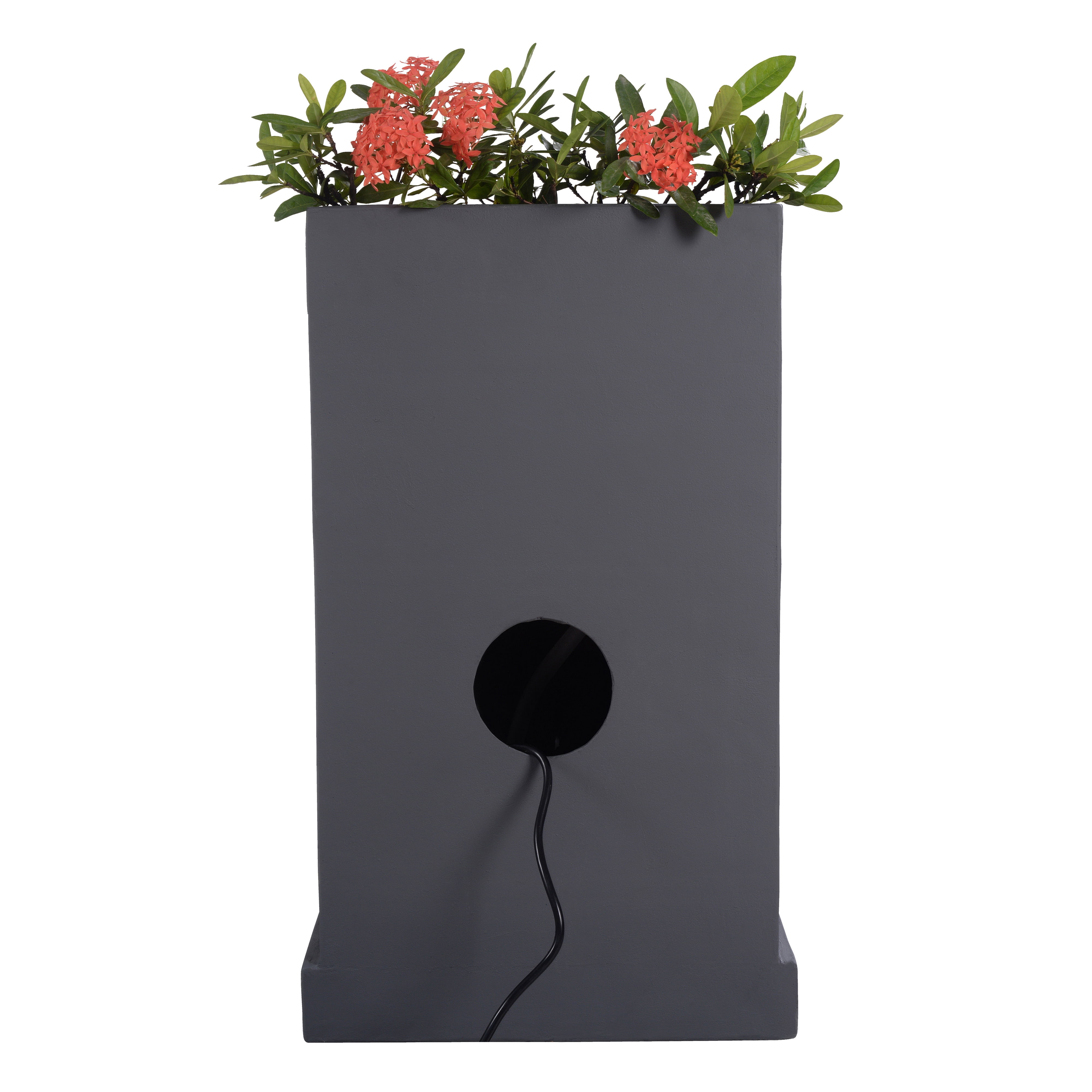 Decorative 3-tier water fountain in a smooth gray finish, each tier is illuminated by LED lights Planter on top of the water feature for annuals or houseplants (plants not included) Weatherproof, rust-resistant polyresin body becomes a focal point, a decorative piece in landscaping Includes an adjustable water pump with a 72.04″ cord and suction cups for secure, submersed placement Dimensions: 17.32″ L x 12.4″ W x 29.13″ H; Water Capacity: 4.2 gallons 0