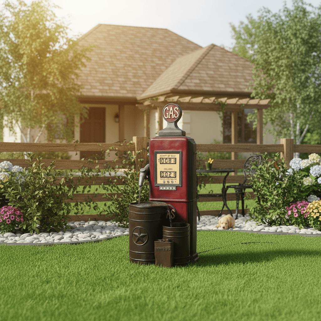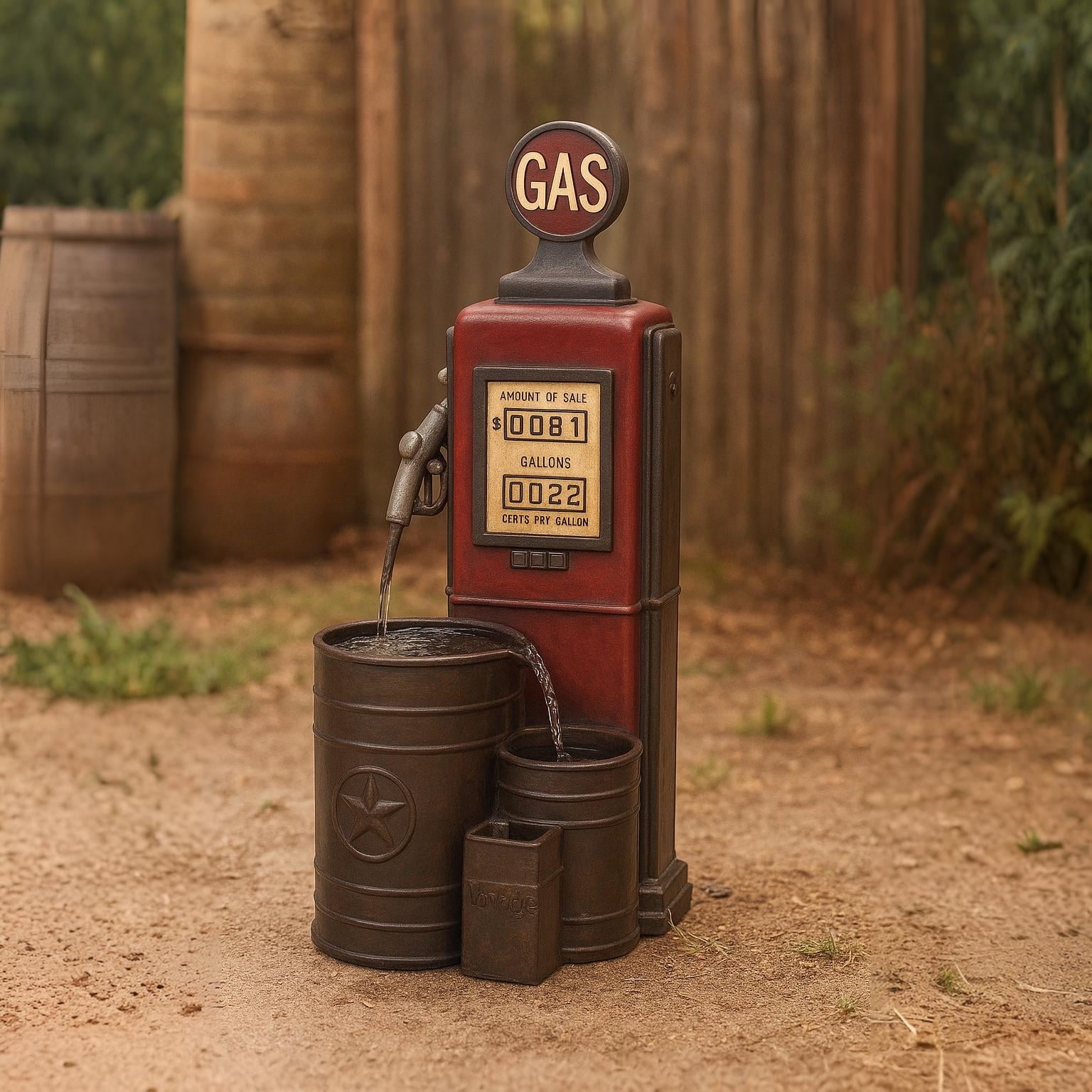 Vintage gas pump surrounded by aged cans to create a cascading water feature Soothing trickling water sound created as water flows down the cans Add as a decorative focal point in outdoor living spaces, adding a peaceful, serene atmosphere Includes an adjustable water pump with a 72.04″ cord, and suction cups for secure, submersed placement Dimensions: 17.13″ L x 16.34″ W x 42.01″ H; Water Capacity: 6.17 gallons