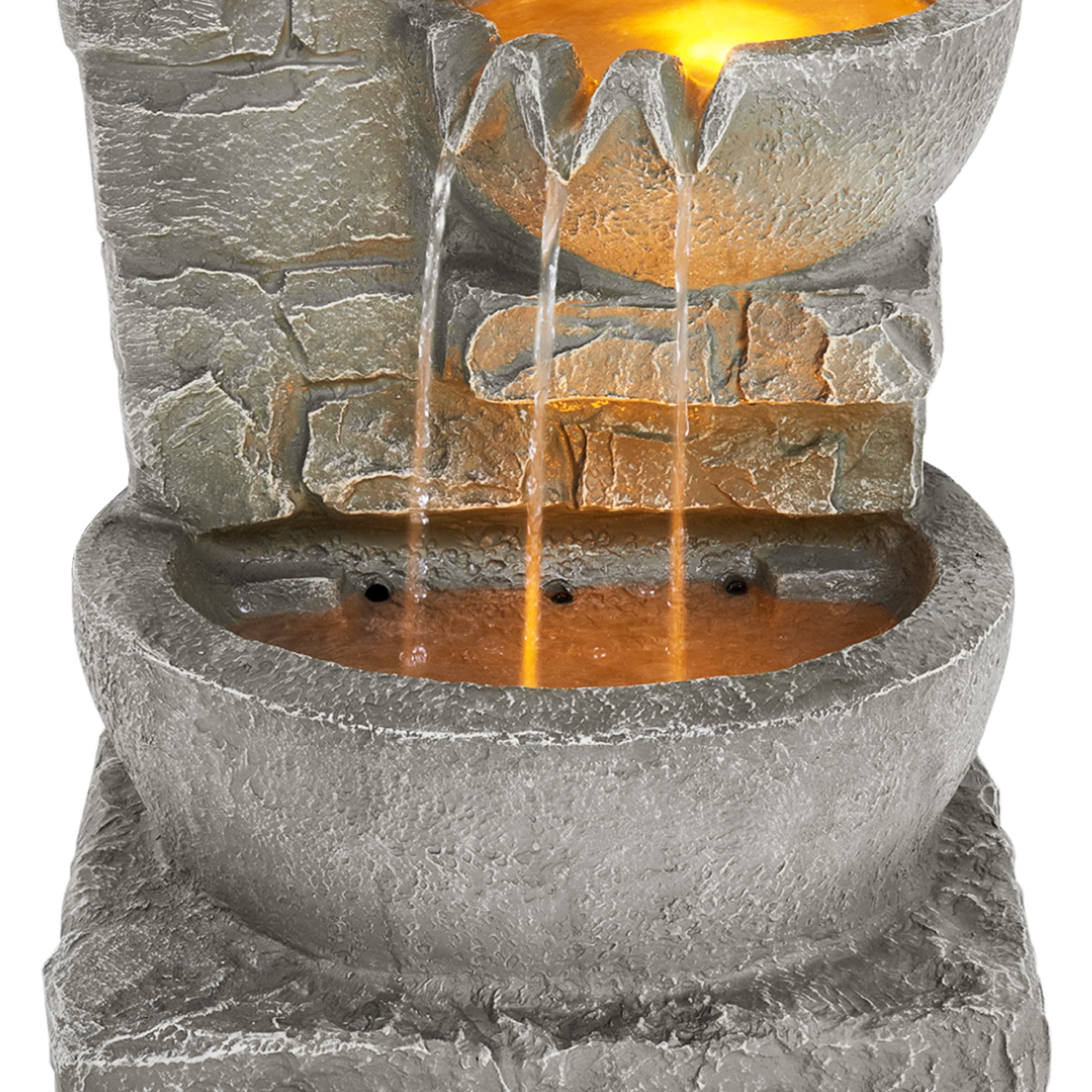 The sound of water gently trickles down a series of cascading bowls, positioned on stacked rocks, while LED lights glow safely beneath the water of this outdoor water fountain Becomes a focal point in landscaping, enhancing your home’s curb appeal, or as a decorative piece on decks and patios Includes an adjustable water pump with a 72.04″ cord, and suction cups for secure, submersed placement Expertly crafted with durable, rust-resistant polyresin with beautiful stone details and a rustic, weathered look, built to withstand the elements Dimensions: 15.51″ L x 15.24″ W x 33.27″ H; Water Capacity: 5.51 gallons LED lights and water pump are included