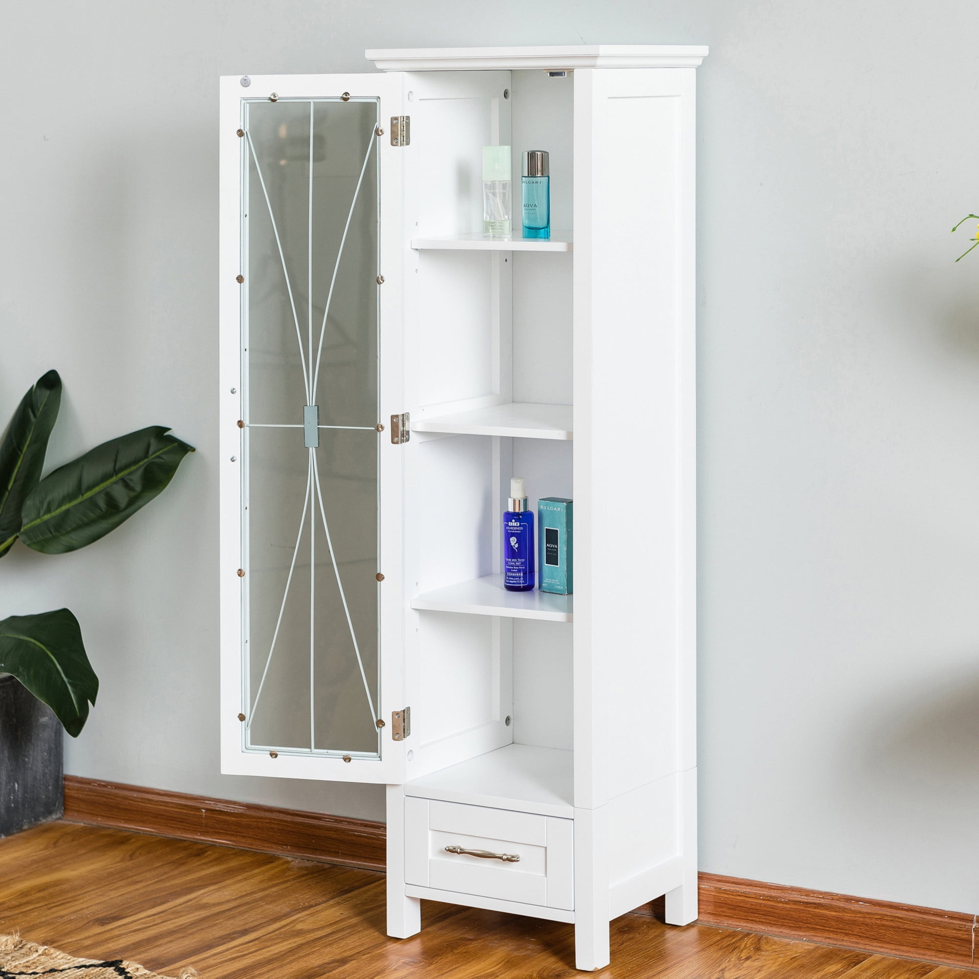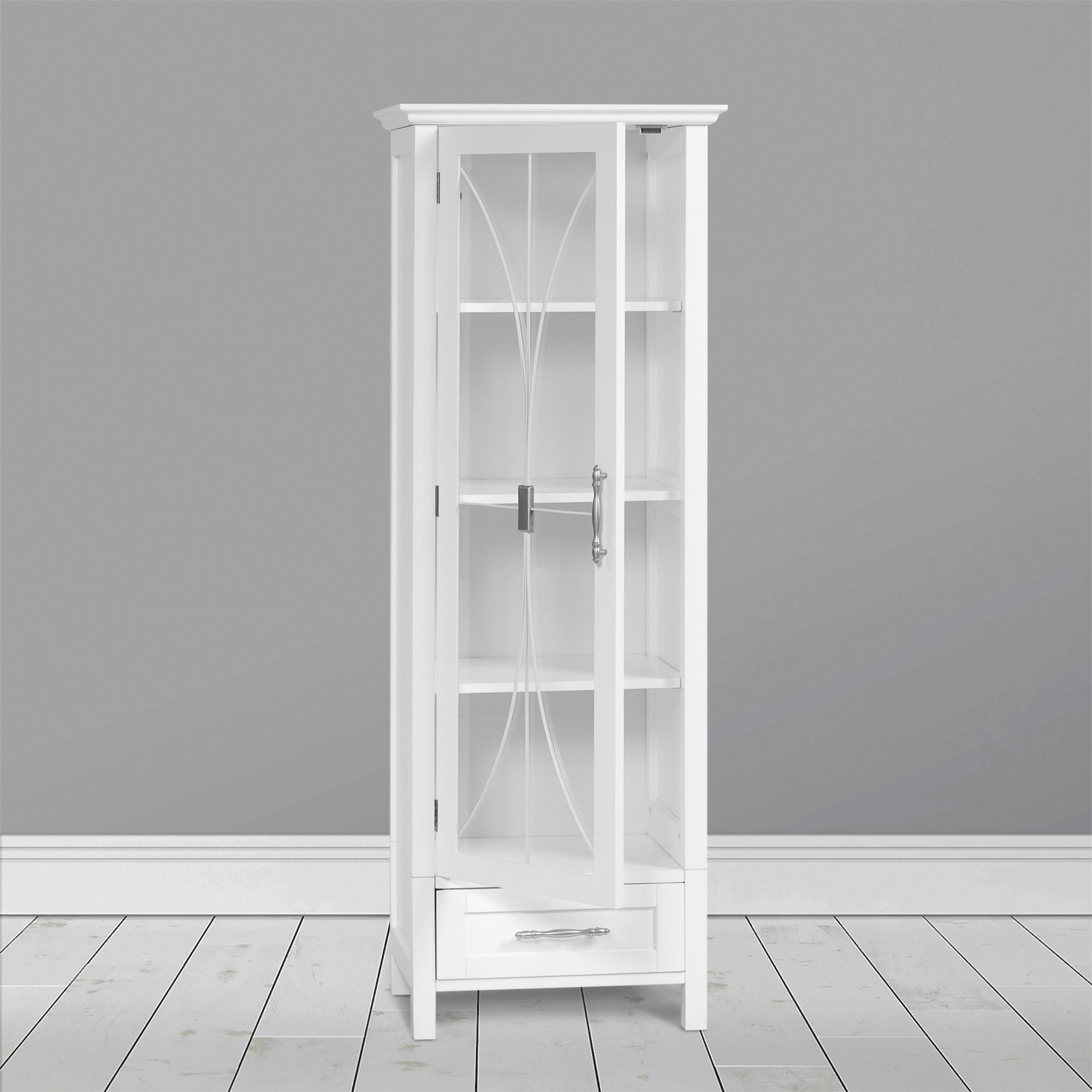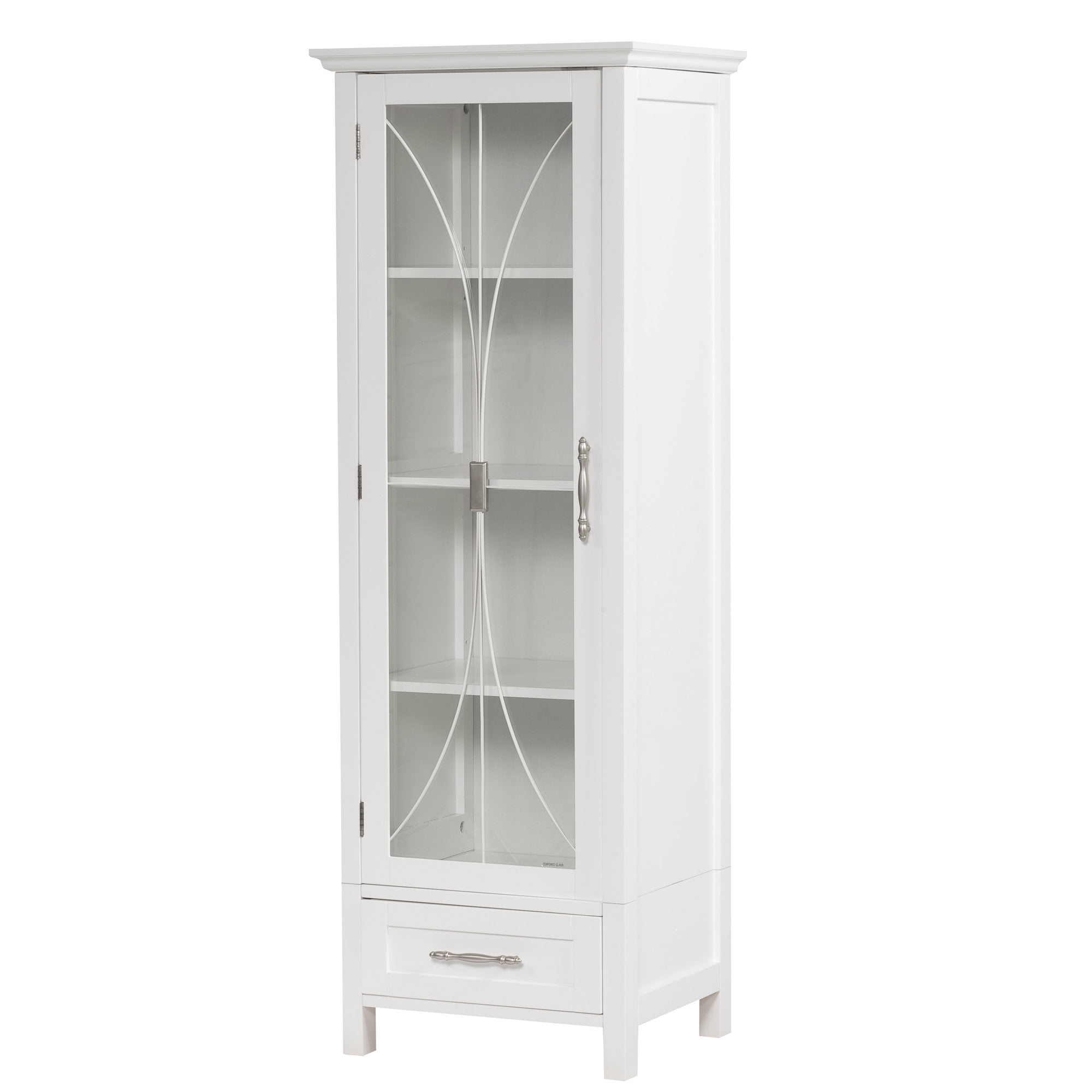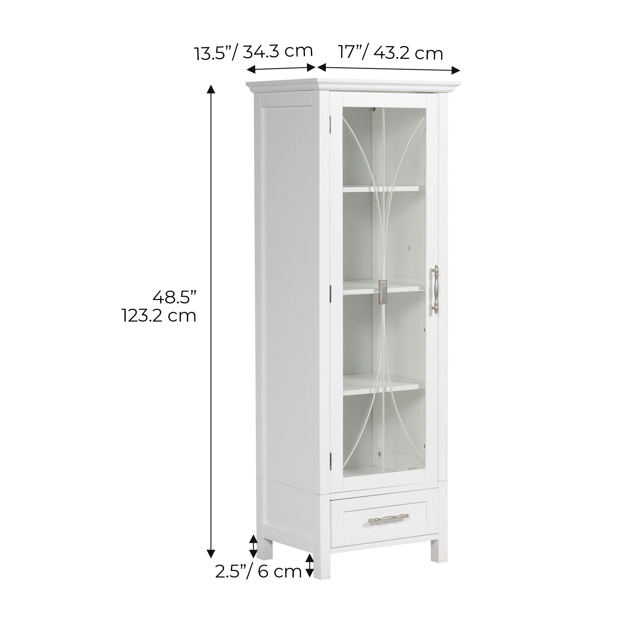 Featuring a tempered-glass paneled door with cathedral-style wire detail In a classic white finish with crown molding, three adjustable shelves and a storage drawer Made of sustainable engineered wood that is less likely to warp, crack, or rot than solid wood Magnetic latch ensures a gentle, silent close, eliminating door slamming Dimensions: 13.5: L x 17.01″ W x 48.5″ H