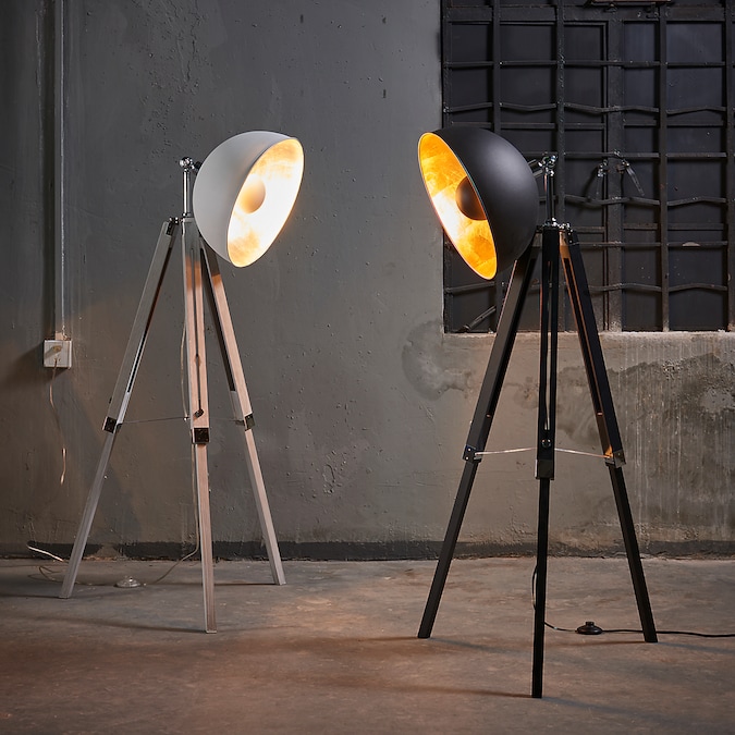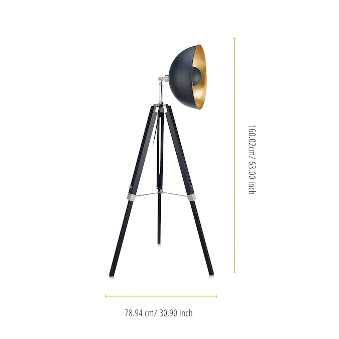 - Industrial floor lamp: Features a classic black finish and a wide dish shade with a bright gold interior for a bold update to any space.