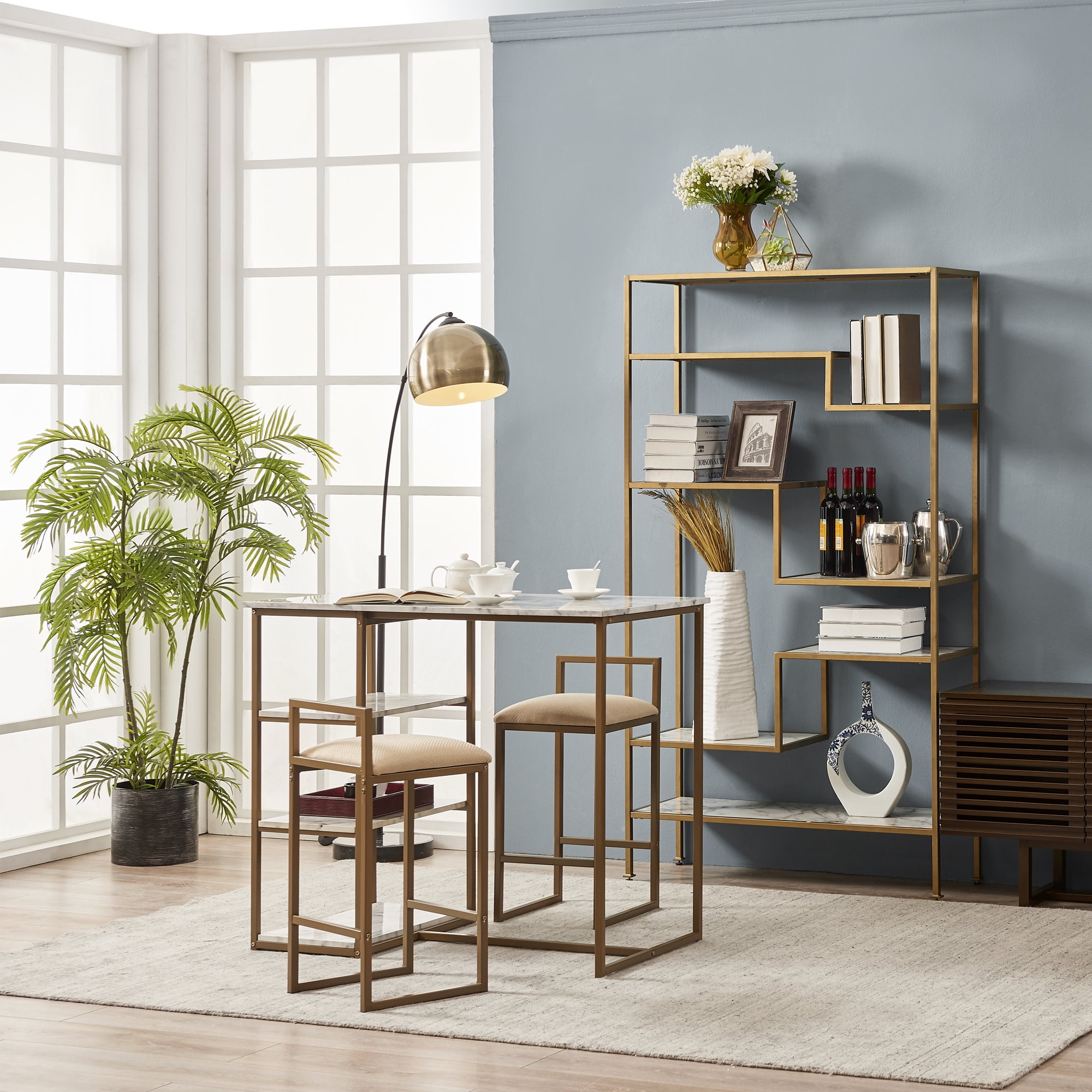 STYLE: This is a perfect accent piece to any house, apartment or commercial space. Featuring a compact construction and storage along one side, it brings style and multifunction to any kitchen or dining space with a modern classic touch. PREMIUM ENGINEERED WOOD & STEEL: Crafted with sturdy metal base in brass finish and Eco-friendly MDF frame for added extra stability and strength. DURABLE & FUNCTIONAL: Set includes 1 rectangular table and 23″ counter height stools. Padded stool seats with beige upholstery can tuck under table for storage. The three spacious shelves for essential storage space. AN ASSET TO ANY SETTING: This table is perfect for any kind of living spaces, dining room, kitchen, brunch shop, even restaurants. Suitable for multifunctional usage as breakfast table, dining table, or used in bar table. EASY TO ASSEMBLE AND CLEAN: The package comes with an easy to follow instruction for assembling and cleaning. Low maintenance accent piece adds a long lasting intelligent design touch to your home.