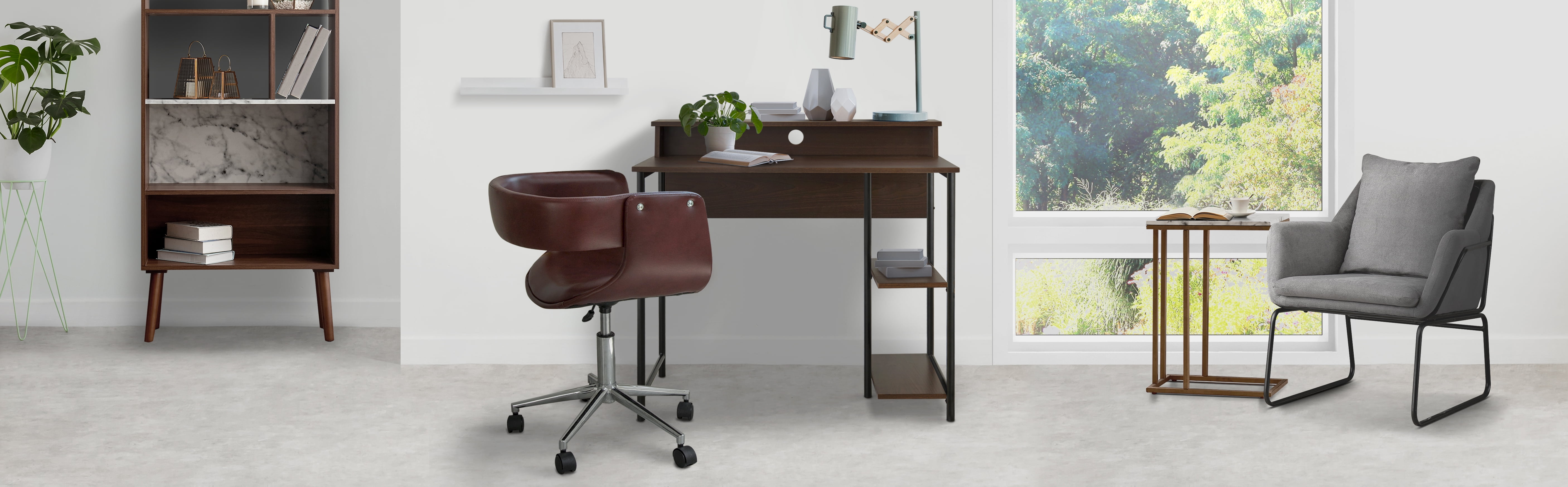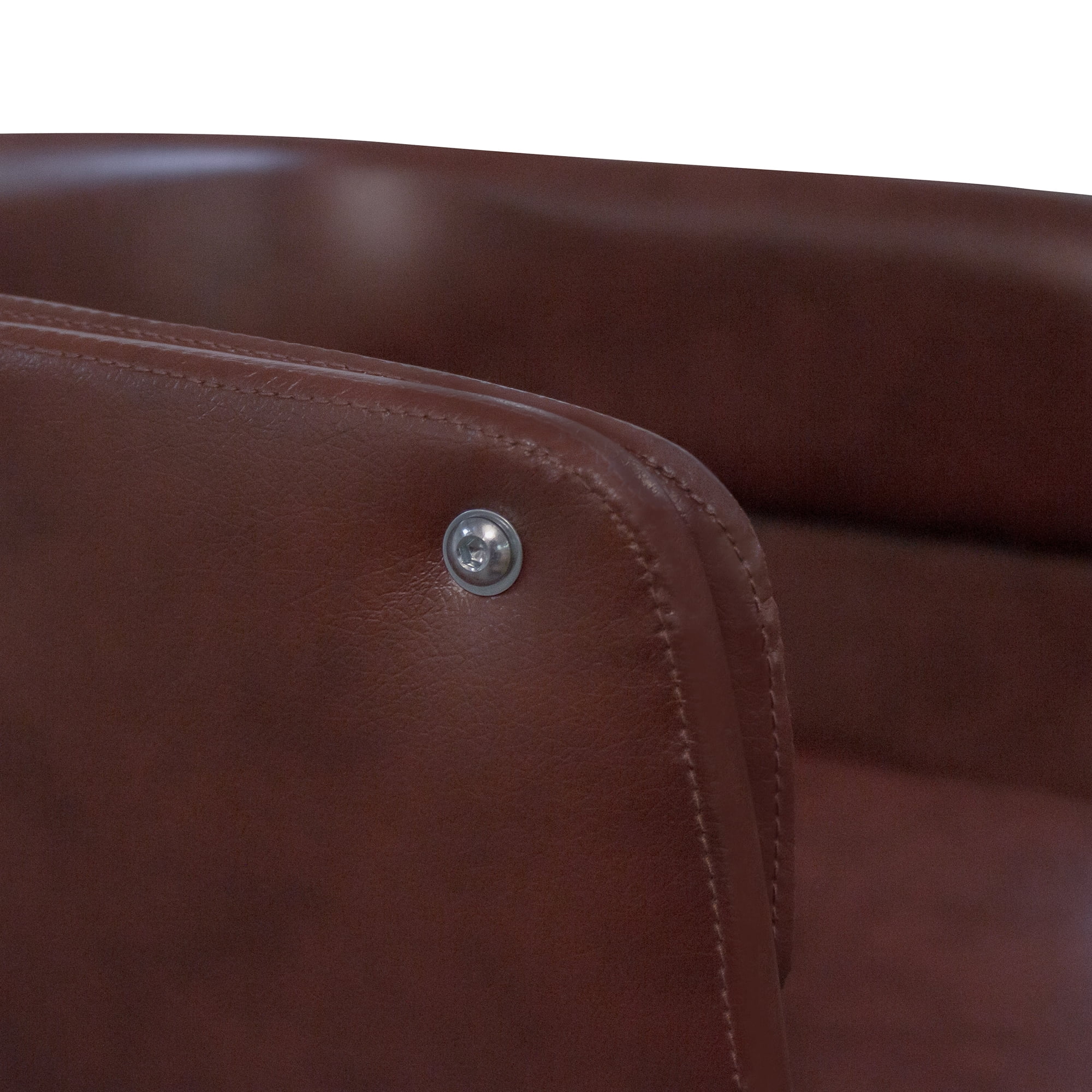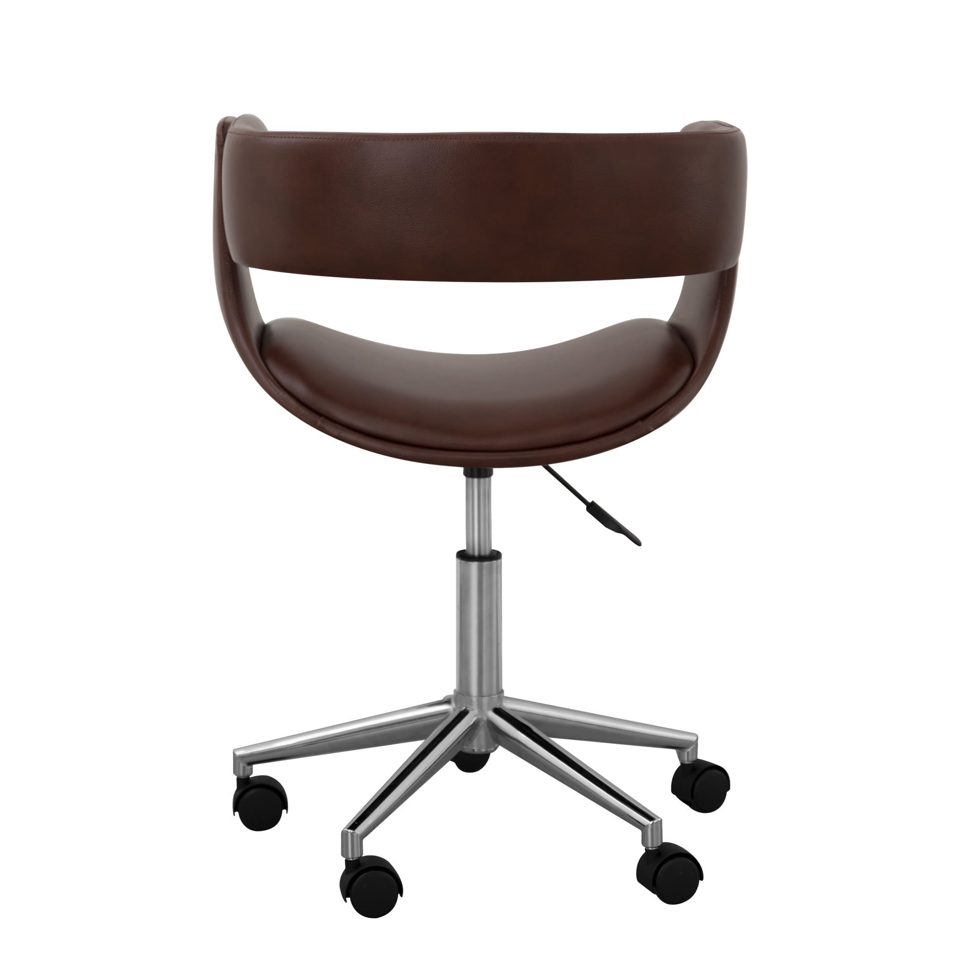 PU LEATHER SWIVEL CHAIR: Features a sleek brown PU leather seat with a polished chrome base for a stylish and comfortable addition to any home office ERGONOMIC DESIGN: Designed with a mid-back ergonomic curved upholstered seat and open back to make working long hours more comfortable, and the curved armrests fit your elbows comfortably SWIVELING BASE WITH WHEELS: Full 360 degree swivel base with 5 rolling wheels allows the chair to be moved around easily ADJUSTABLE HEIGHT: Seat adjusts from 26.5″ to 29.5″ in height to provide comfortable seating at any desk EFFICIENT SIZE: Measures 20″ x 21.26″ x 26.38″ to fit in any office space