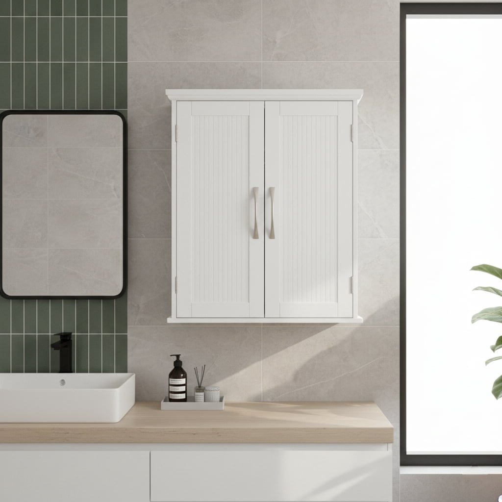 Features a classic white finish with two flat beadboard shaker door and brushed nickel pulls Adjustable shelf provides customizable storage to help reduce clutter Made of sustainable engineered wood that is less likely to warp, crack, or rot than solid wood Magnetic latch ensures a gentle, silent close, eliminating door slamming Dimensions: 20.0″ L x 7.01″ W x 24.02″ H