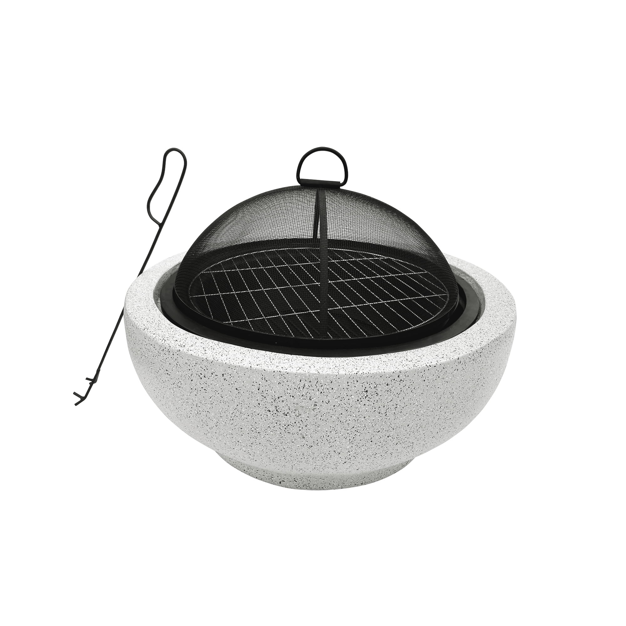 Round contemporary shape with a granite-look finish adds warmth and ambiance to your backyard, patio, deck, porch, or any outdoor space Includes a cooking grate for light cooking, making it great for parties and entertaining Durable design with sturdy base prevents the fire pit from tipping or falling over, even in windy weather conditions Includes a removable ash pan for easy clean-up, mesh spark screen, stainless steel grill grate, poker, and touch-up paint with brush Dimensions: 23.62″ dia. x 15.55″ H; Burning Area: 15″ dia. X 5.75″ H