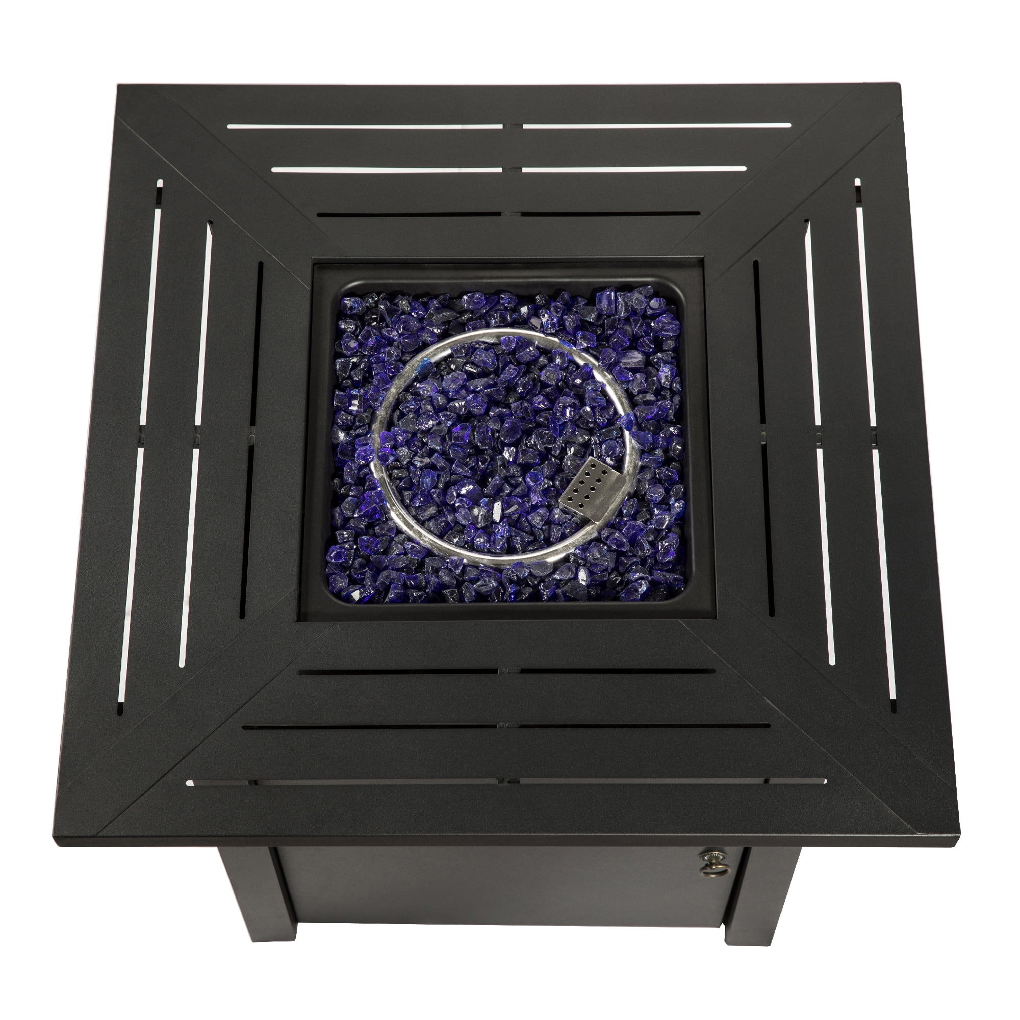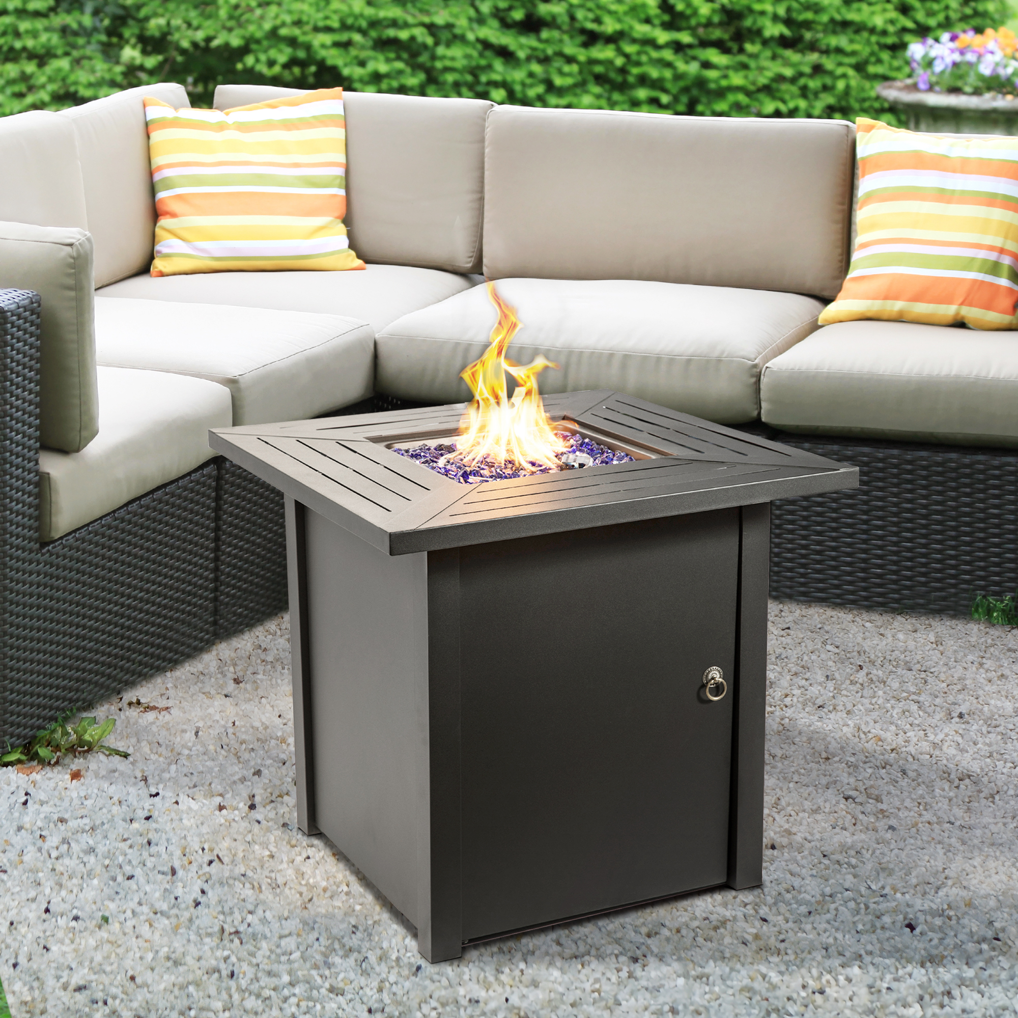 STEEL GAS FIRE PIT: Features a modern look to add warmth and a calming atmosphere to your porch, deck, or yard INCLUDES ACCESSORIES: Comes with a 20″ gas hose, 11 lbs. of glass rocks, and a lid for easy operation PROPANE POWERED: Rated for 40,000 BTUs and its convenient design makes installing a propane tank easy STURDY CONSTRUCTION: Durable steel base prevents cracking and keeps the fire pit stable even in windy conditions DIMENSIONS: W30 x D30 x H28 Inches. Weight: 59.4 lbs.