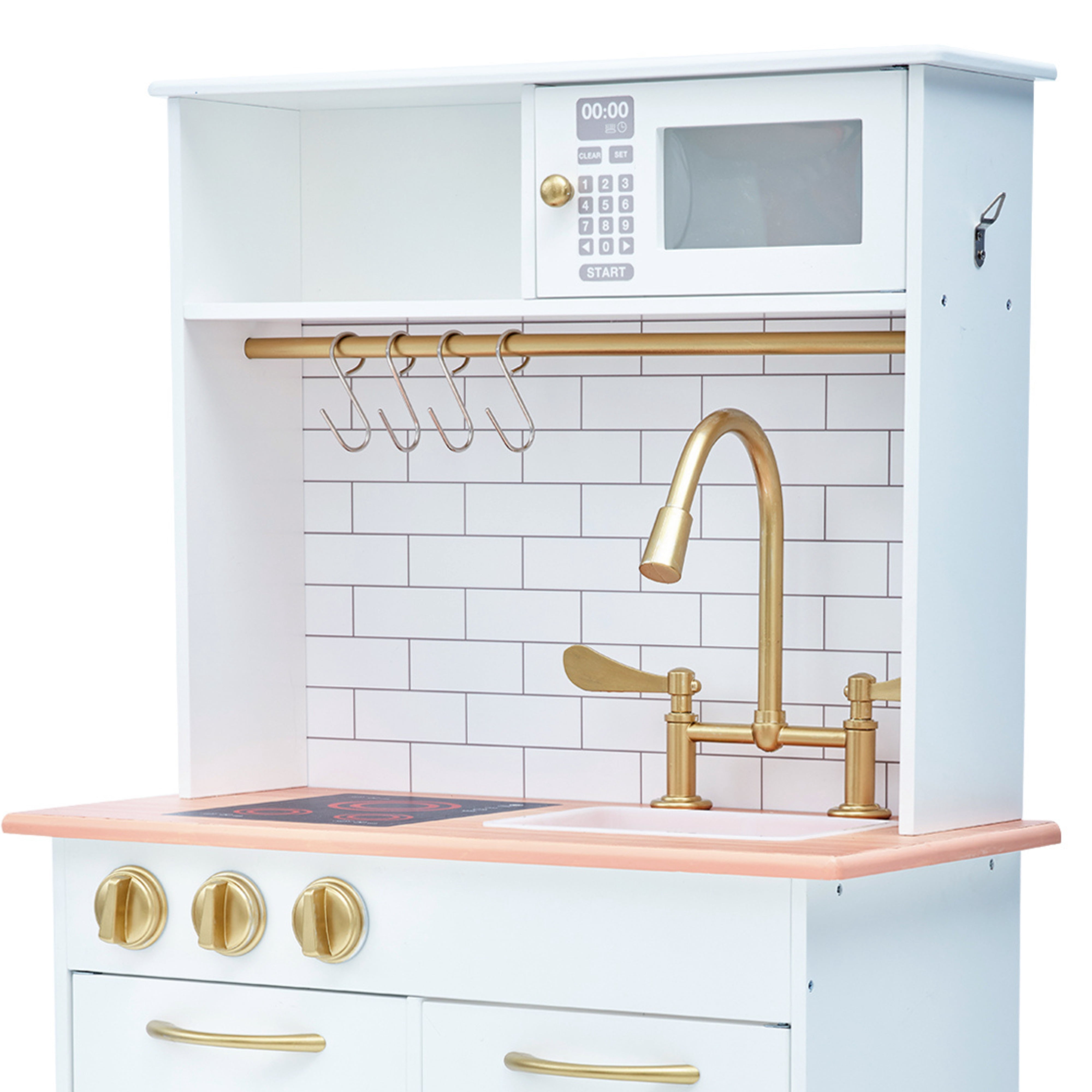 Modern play kitchen with retro accents – farmhouse sink, retro subway tile backsplash Realistic faucet handles and oven knobs turn – even make a clicking sound Includes vintage-looking metal cookware with a white finish Dimensions: 22.24″ L x 12.01″ W x 37.52″ H, 23.75 lbs. The stove has an oven door, microwave, two burners, a sink, three knobs