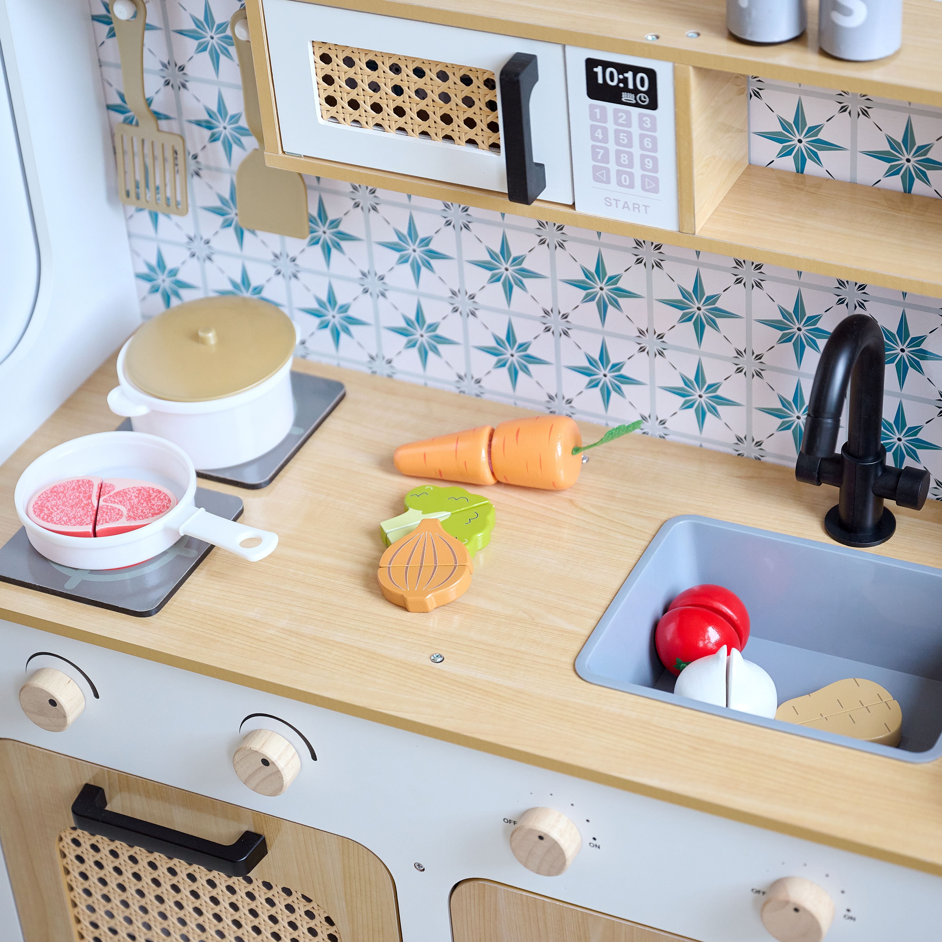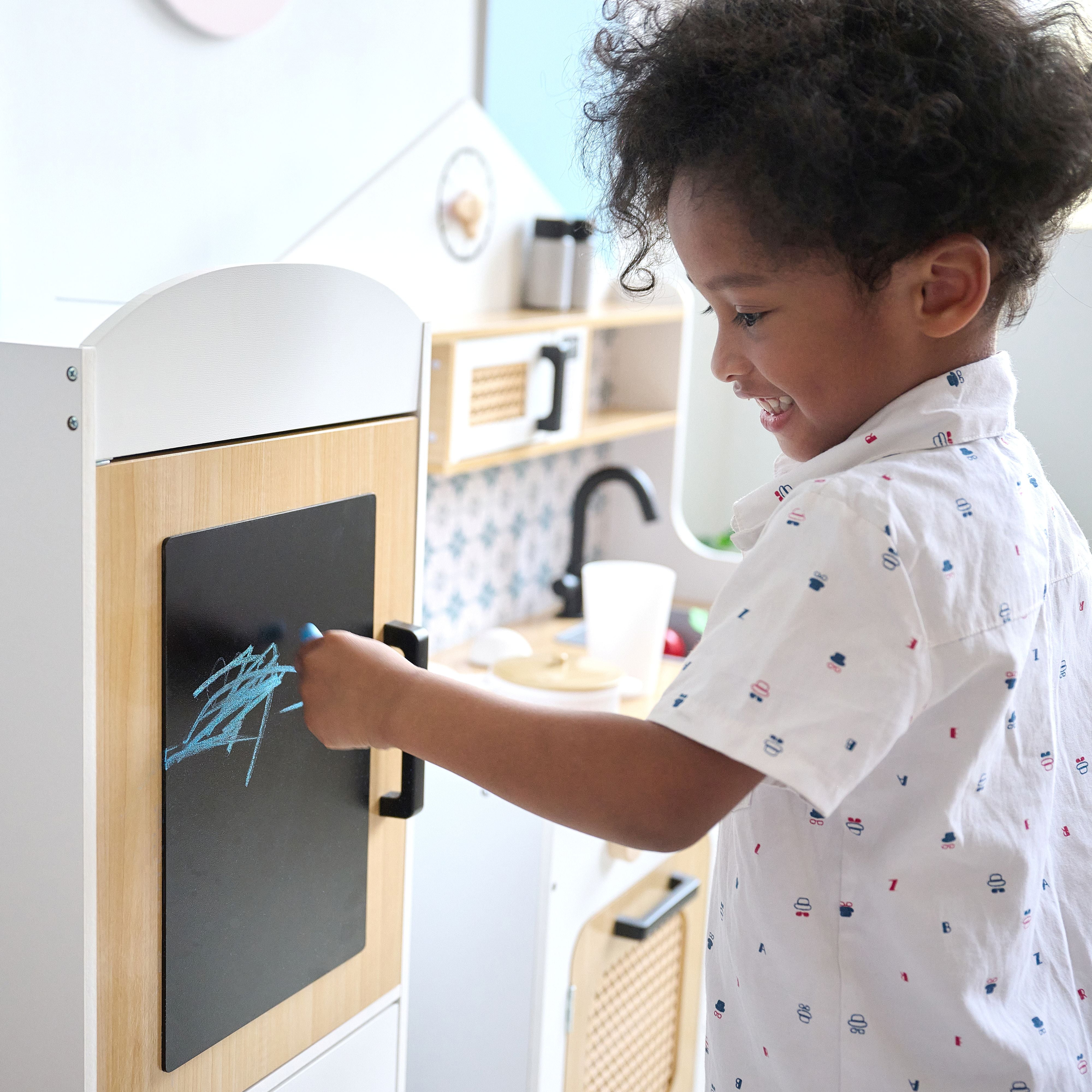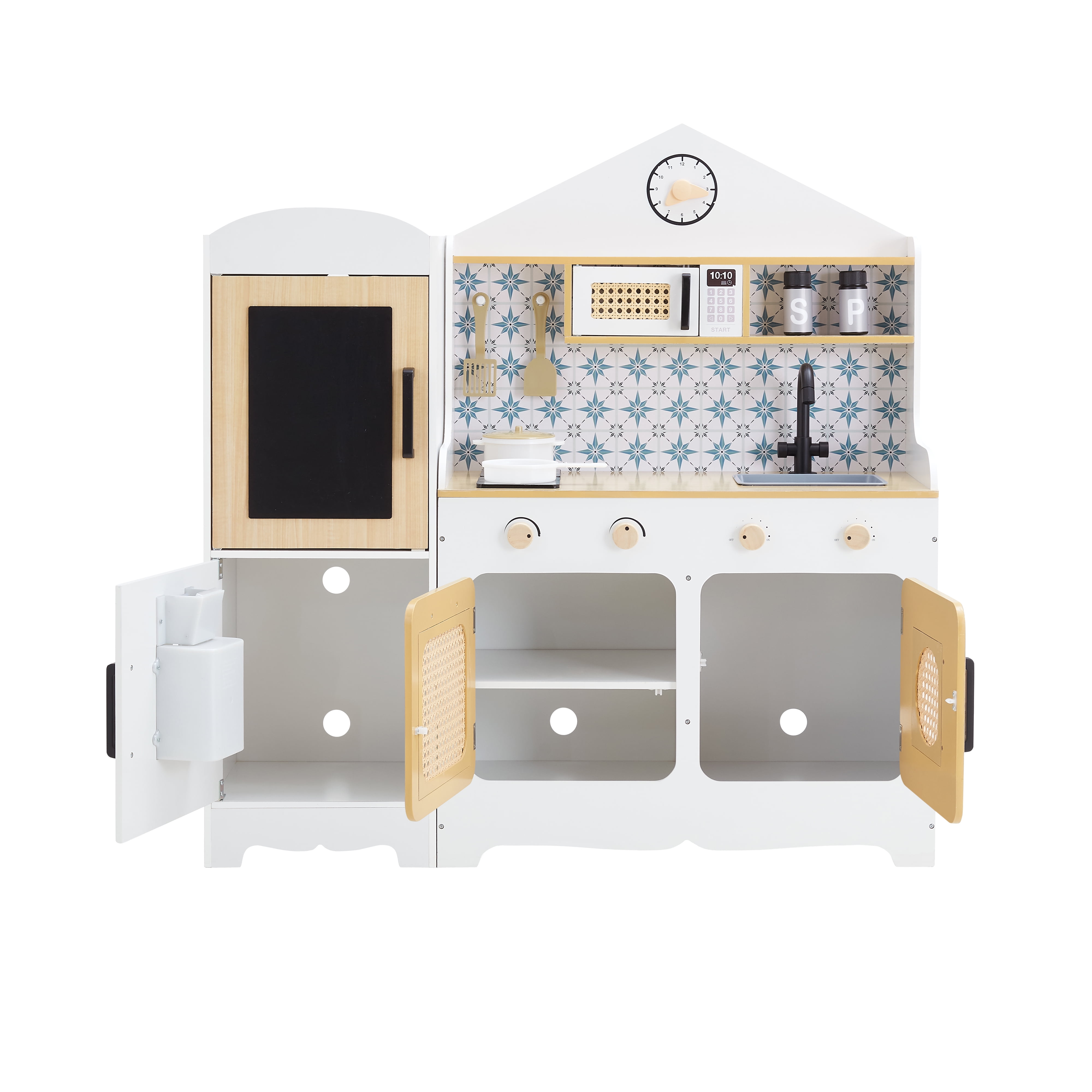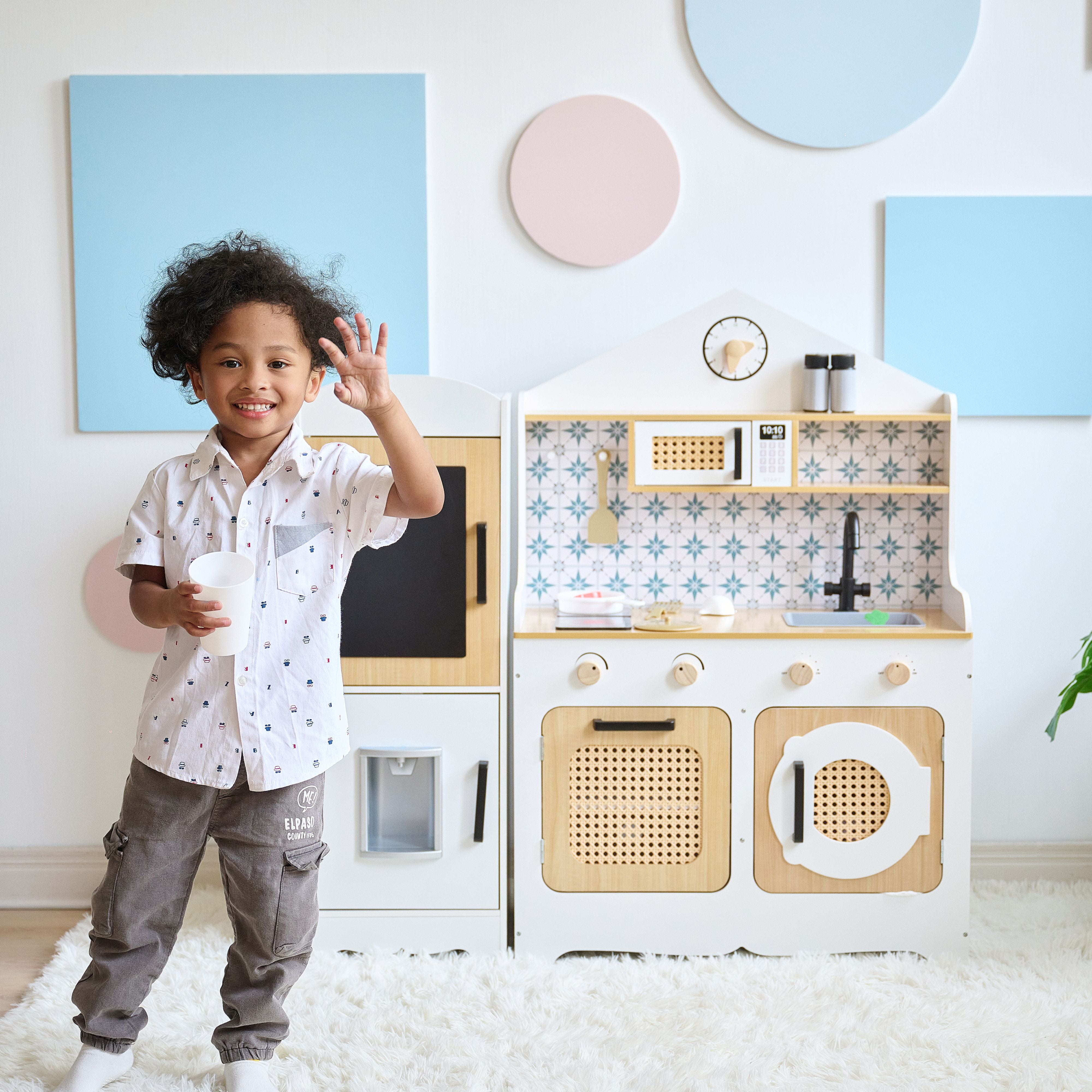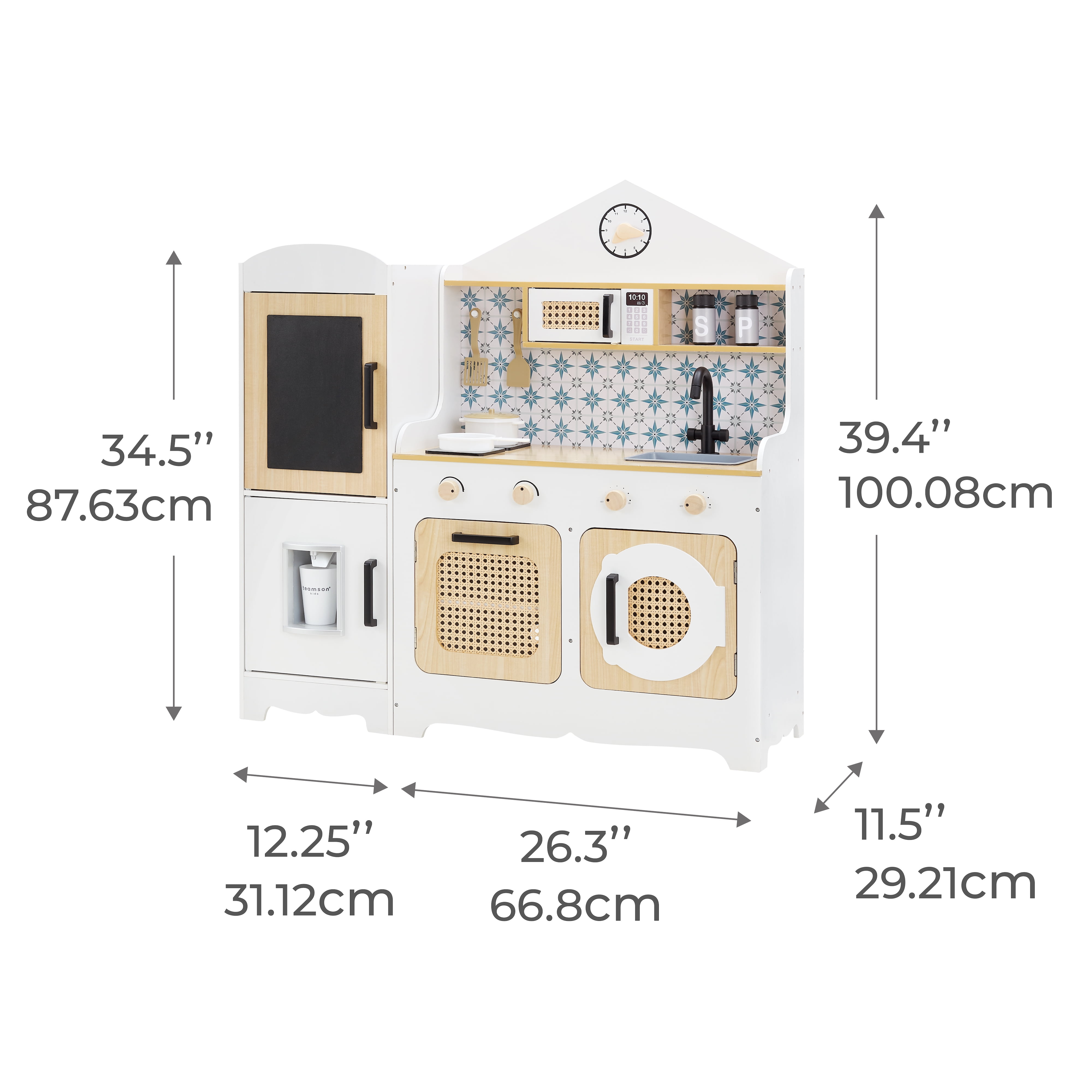 Complete Modular Play Kitchen: Includes separate refrigerator and combo unit with oven, microwave, washer, and sink—perfect kids kitchen playset for realistic pretend routines at home. Interactive Toy Kitchen for Toddlers: Features clicking knobs, movable faucet, ice dispenser, and chalkboard for hands-on sensory play that encourages independence and life-skill growth. Stylish & Compact Kids Kitchen: Faux Moroccan tile, rattan-textured doors, and wood finishes elevate this wooden kitchen for toddlers without overwhelming small spaces. Complete 11-Piece Accessory Set: Includes pot, pan, lid, spatulas, salt & pepper shakers, cup, and pretend ice cubes—everything needed for creative toddler kitchen roleplay. Safe, Compact & Durable Design: Made from wood. Dimensions—Fridge: 12.25″ L x 11.5″ W x 34.5″ H; Main Body: 26.3″ L x 11.5″ W x 39.4″ H. Meets safety standards. DIMENSIONS: Refrigerator (12.25″ L x 11.5″ W x 34.5″ H); Oven/Sink (26.3″ L x 11.5″ W x 39.4″ H) ASSEMBLY REQUIRED: Phillips Screwdriver Recommended (